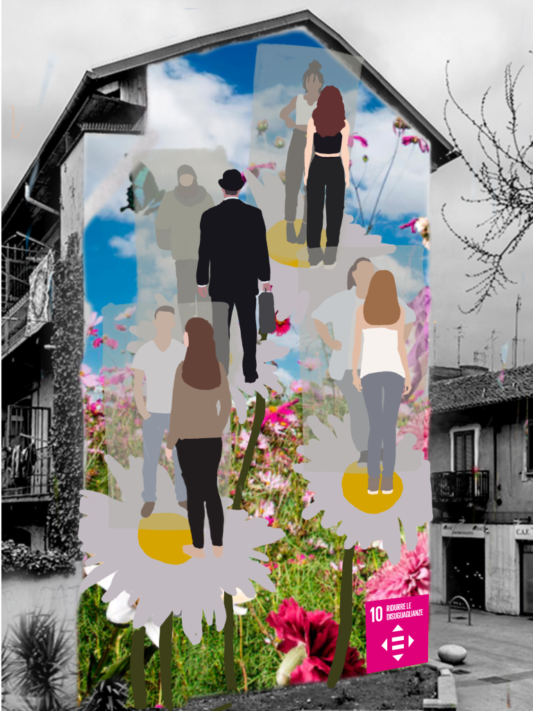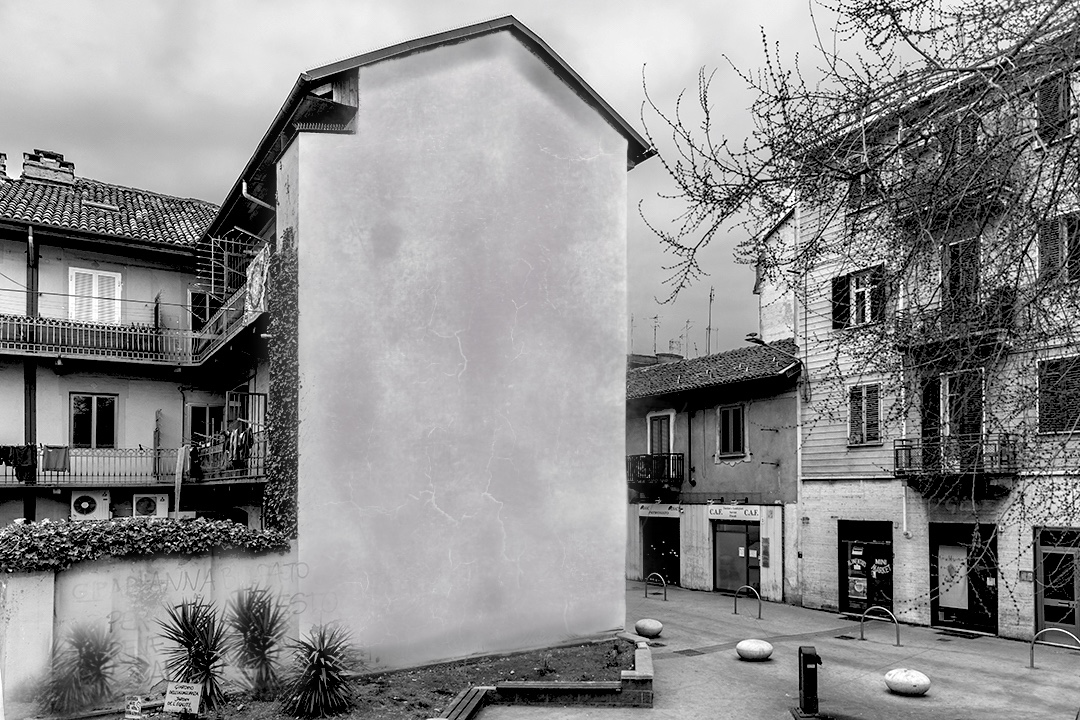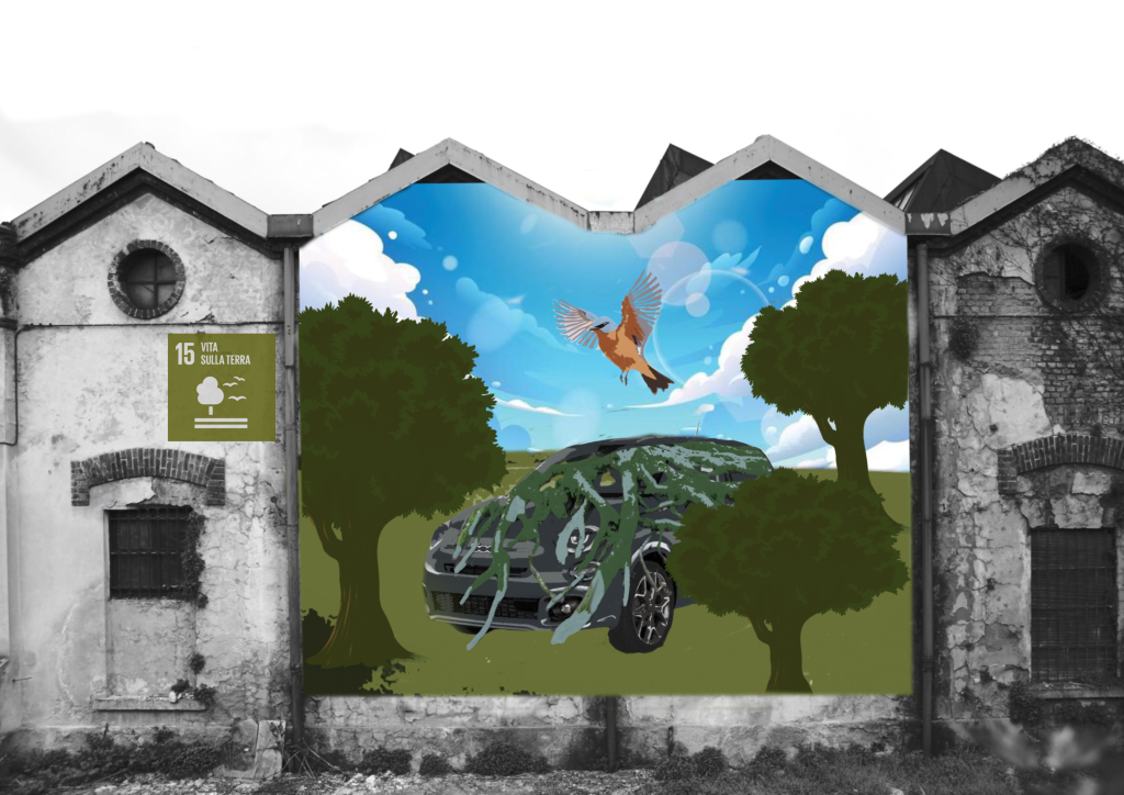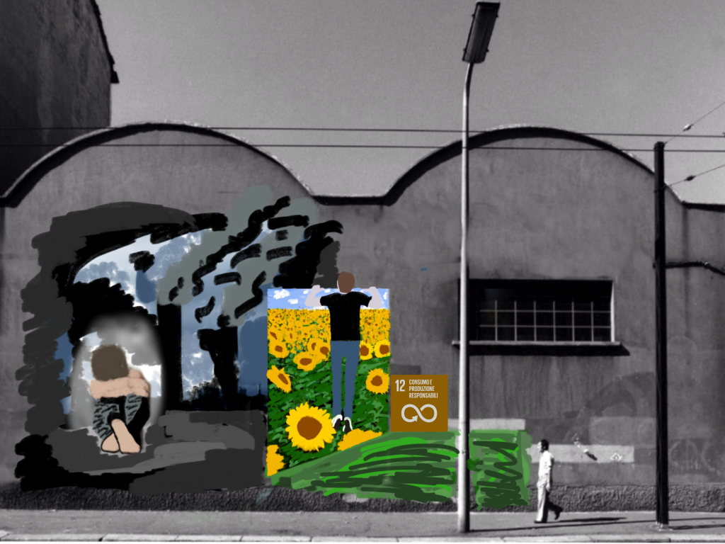 The final phase consists of elaborating our digital image with a pictorial style. We must, in fact, imagine that the work is realizable as a true painted mural. Let’s think of it as a piece of street art that, once digitally completed, could actually be created on a real façade.