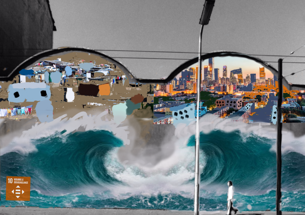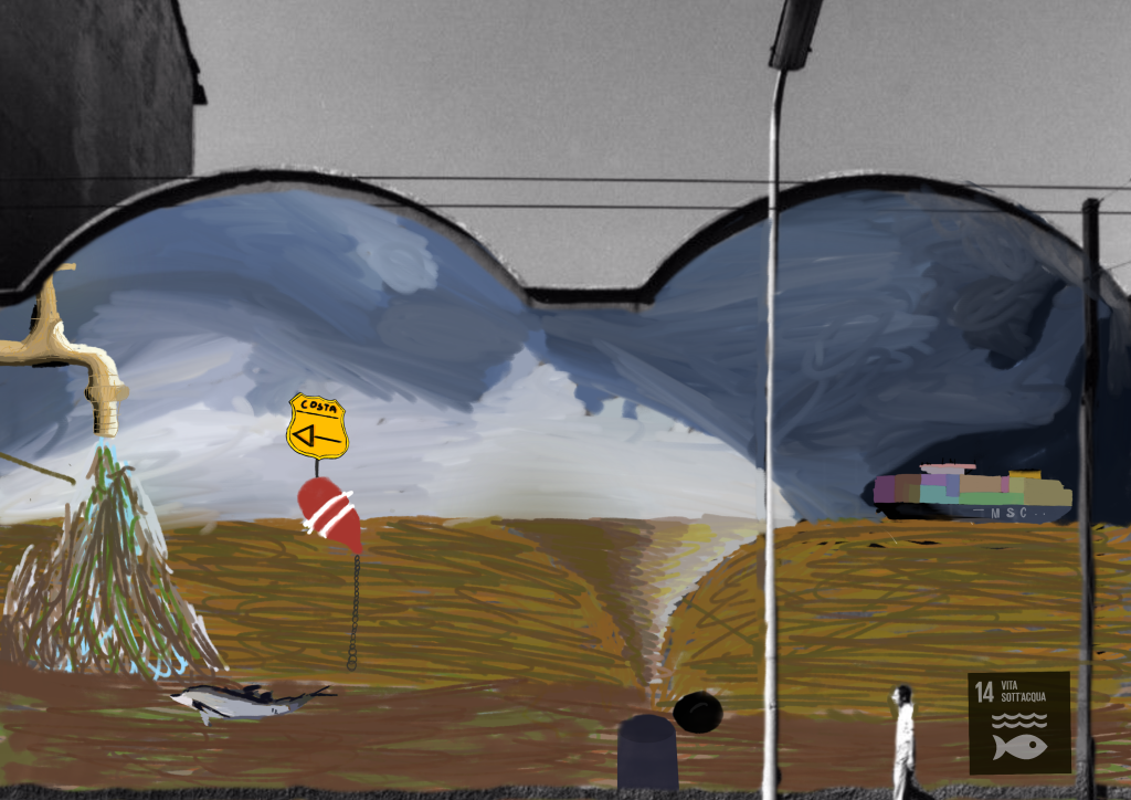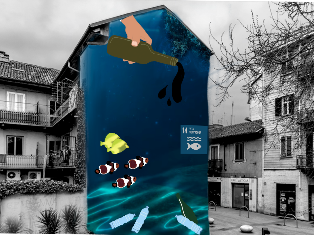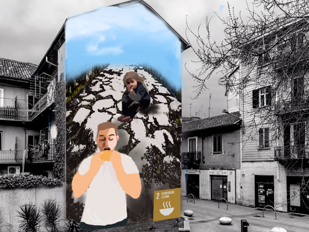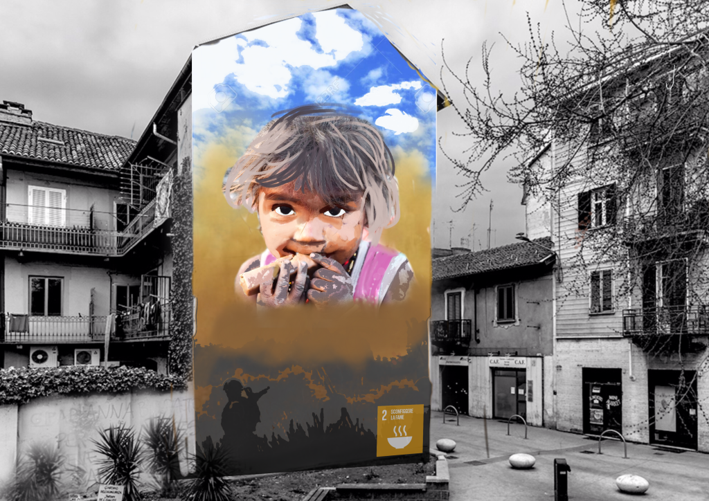 The final phase consists of elaborating our digital image with a pictorial style. We must, in fact, imagine that the work is realizable as a true painted mural. Let’s think of it as a piece of street art that, once digitally completed, could actually be created on a real façade.