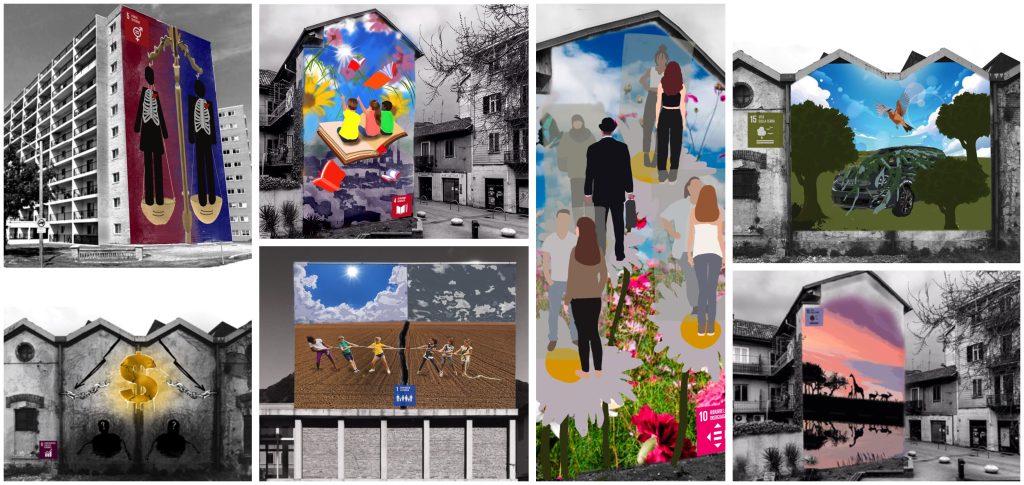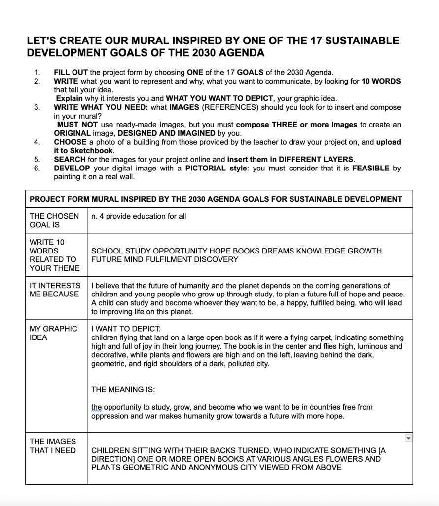The realization took two lessons: one to fill out the form and search for the references, and one to compose the digital image, redrawing it with a pictorial style and finally adding the symbol of the goal it refers to. Here are the students’ digital works. For a paper version of the assignment, click HERE and see this lesson.