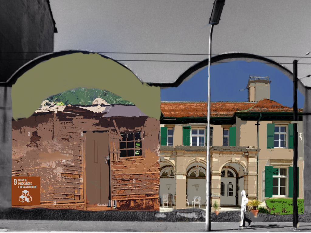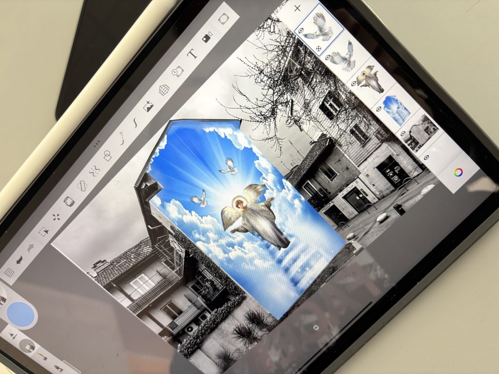 Once the idea has been defined and the reference images gathered, we choose one of the photos of buildings provided by the teacher. This will be our “canvas.” We upload the selected image to the Sketchbook application. At this point, we search online for the references for our project and insert them into the file, ensuring we place them on different layers so we can manipulate them individually.