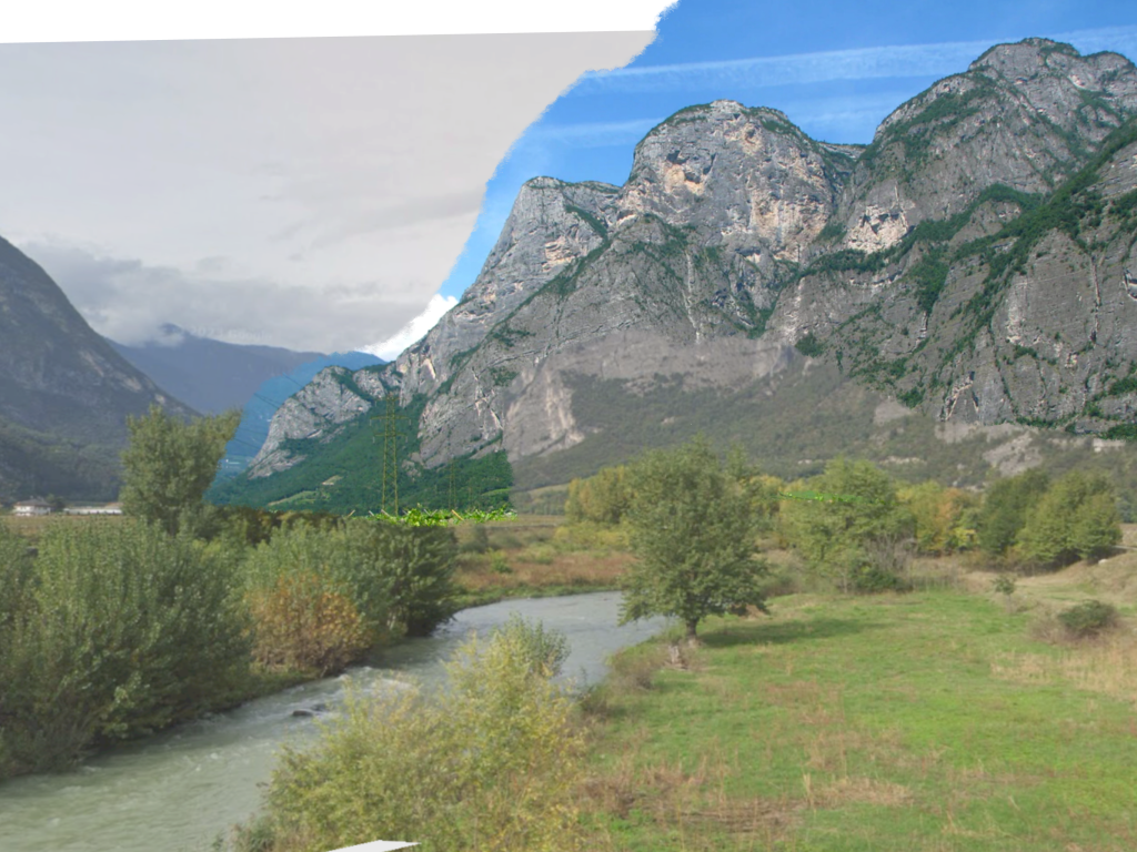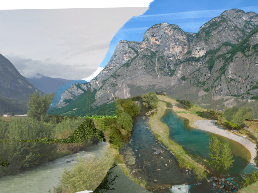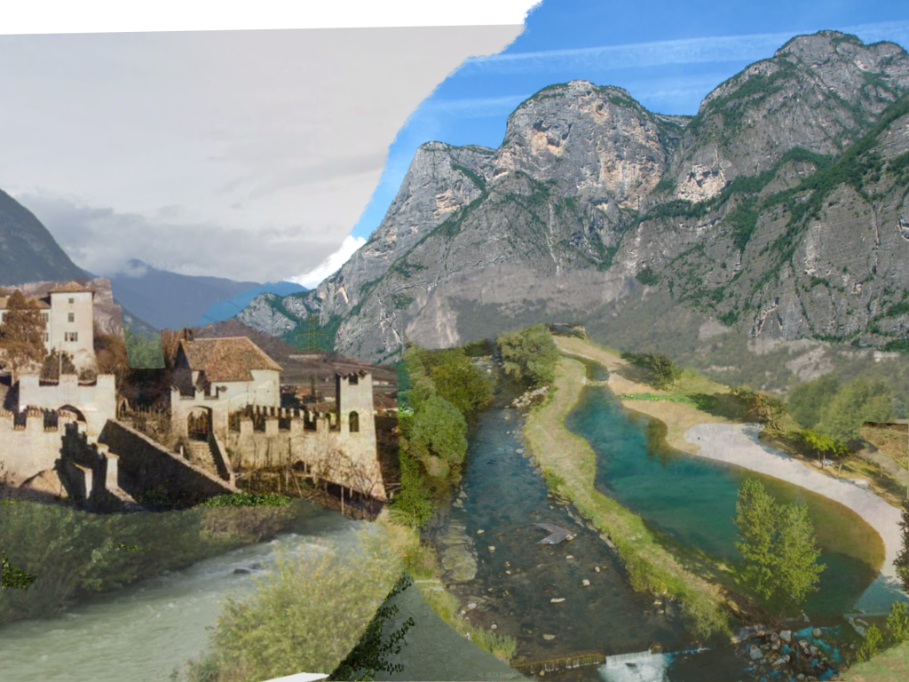 Painting a mural together on the walls of the school in Mezzolombardo was a highly valuable educational and formative activity. The experience was conceived as a group activity, with a “learning by doing” approach. The mural was painted on the ground-floor wall, in the corridor leading to the cafeteria, next to the administration offices. The chosen subject was a stylized landscape depicting the Piana Rotaliana, with Mezzolombardo Castle and the Noce River.