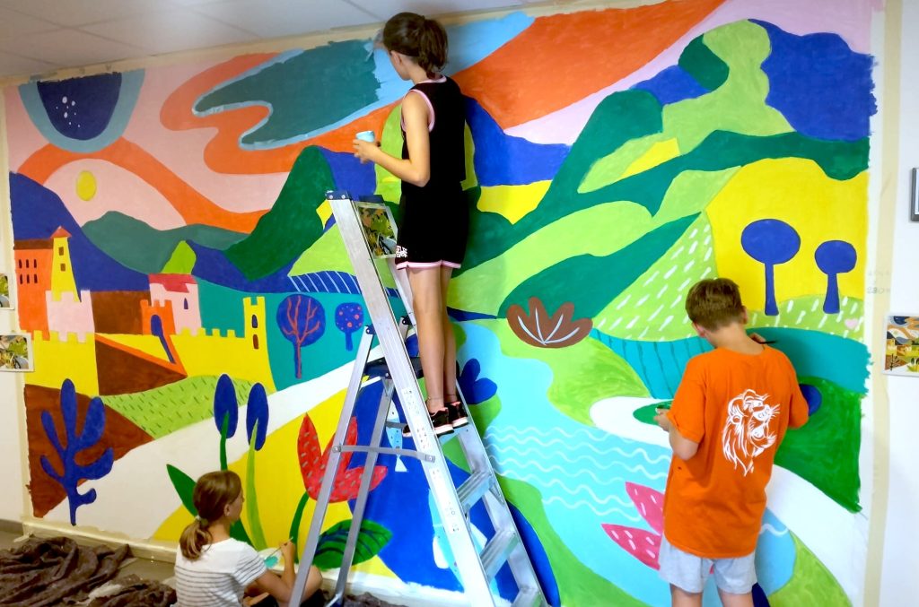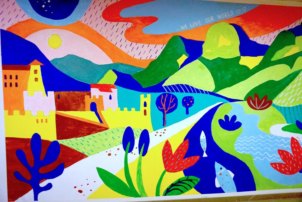 During the first part of the day, after reviewing the project, the students moved on to drawing on the wall and applying the first colors. In the afternoon, the work continued intensely and satisfyingly: all the students completed their tasks with precision and commitment. The day concluded in the evening with the addition of textures, final decorations, and the inclusion of a striking phrase: “We love our world.” With these words, the students reaffirmed their gratitude for the beauty of the place they live in, rich in nature and greenery.