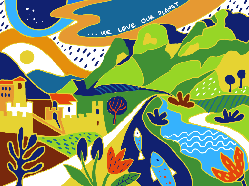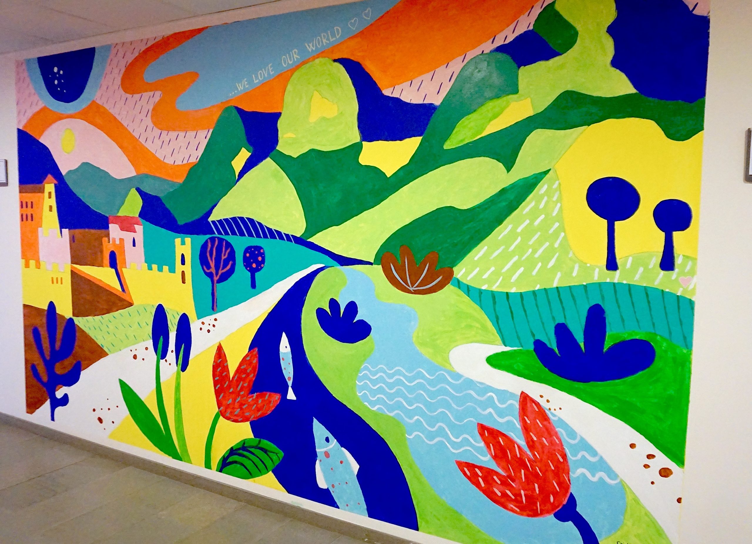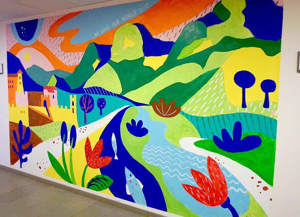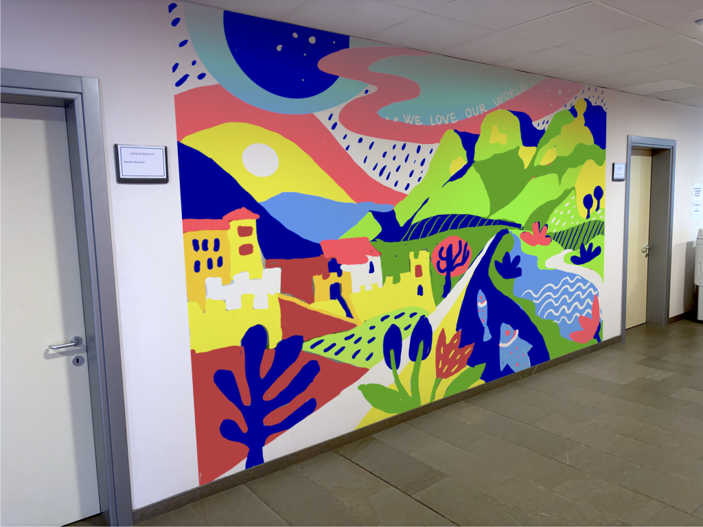 In the project, dedicated to the landscape of our home, the Piana Rotaliana, the students transformed the walls of the cafeteria corridor into a visual narrative of the area: the castle, the Noce stream, the mountain profiles. It was a way to celebrate their roots and leave a tangible and lasting mark on the school, with a message of care and gratitude summed up in the phrase “We love our world.”