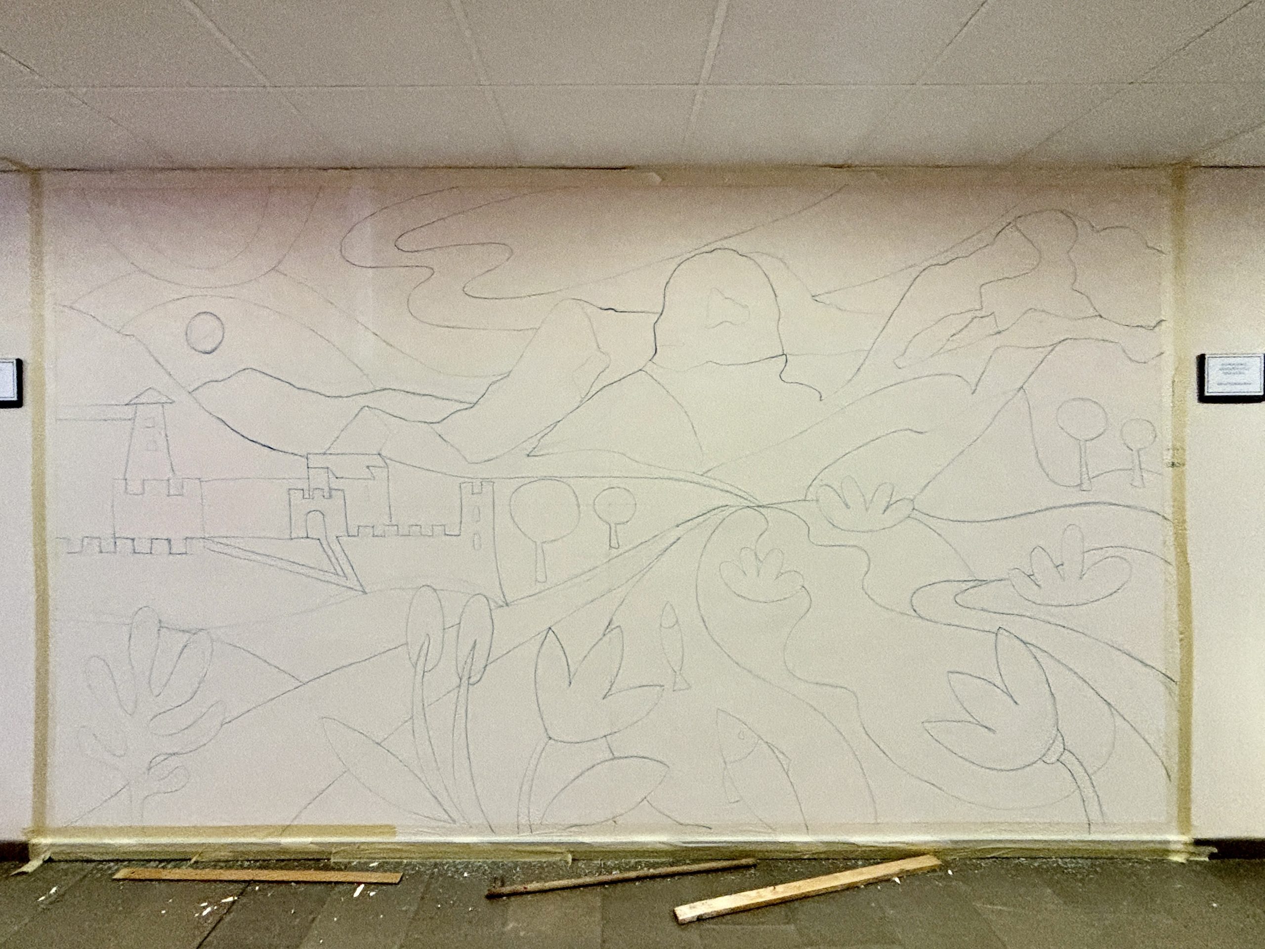 The most complex part was to enlarging the image on the wall, done using the squaring technique: partly by the teacher, partly by the students (in the lower areas). Once the drawing was transferred, the students painted the different areas following the original sketch.
