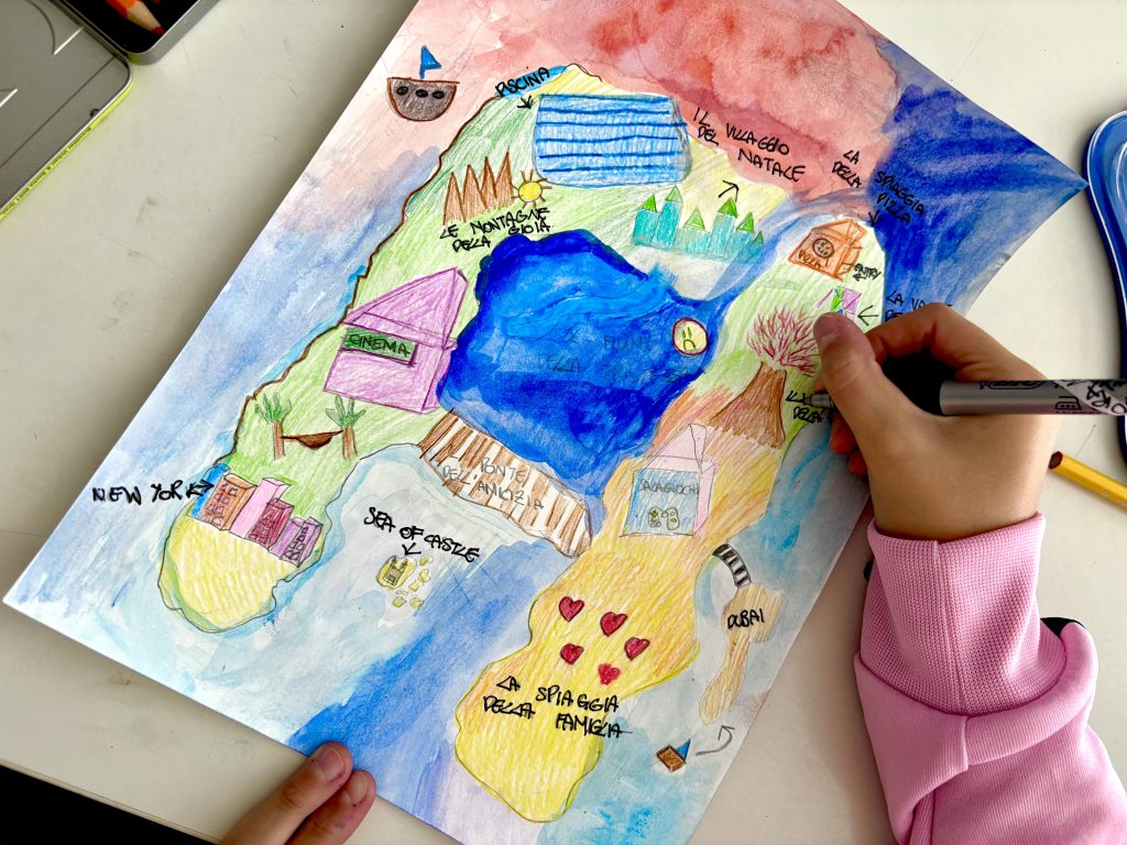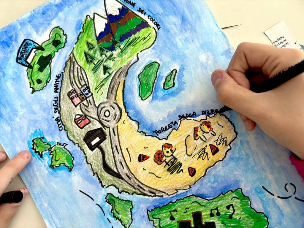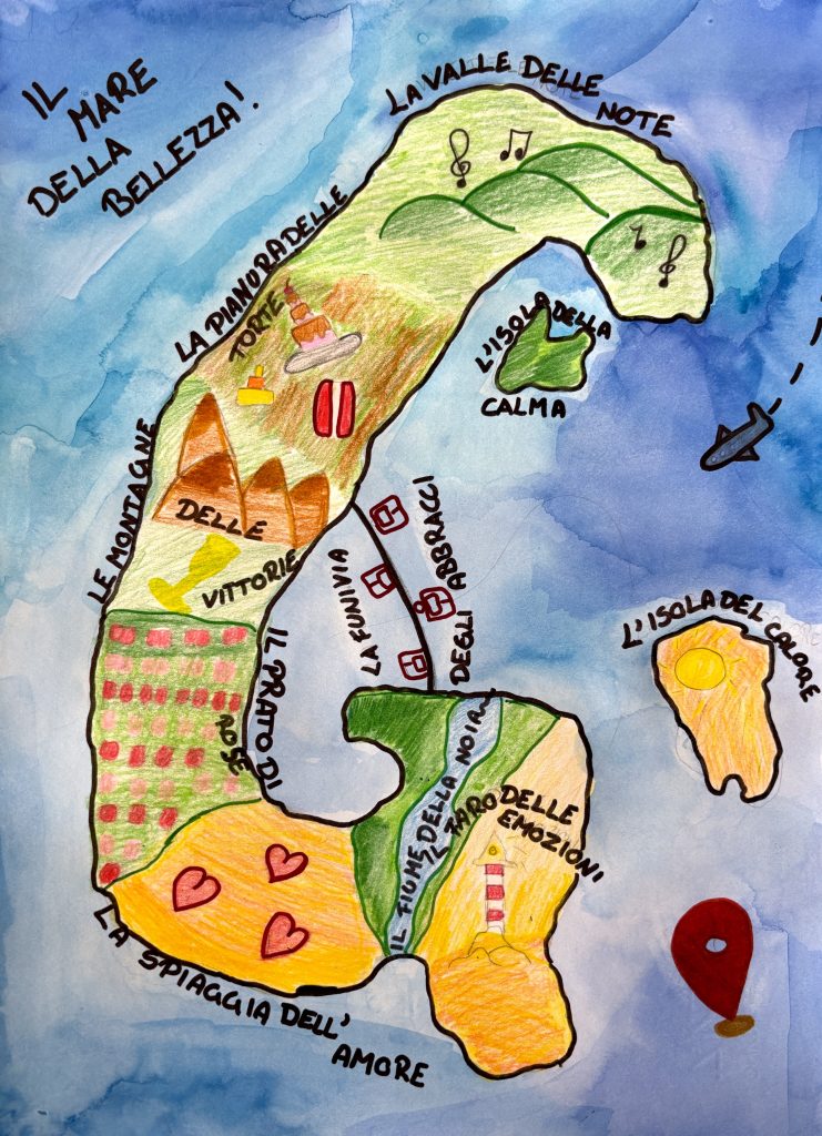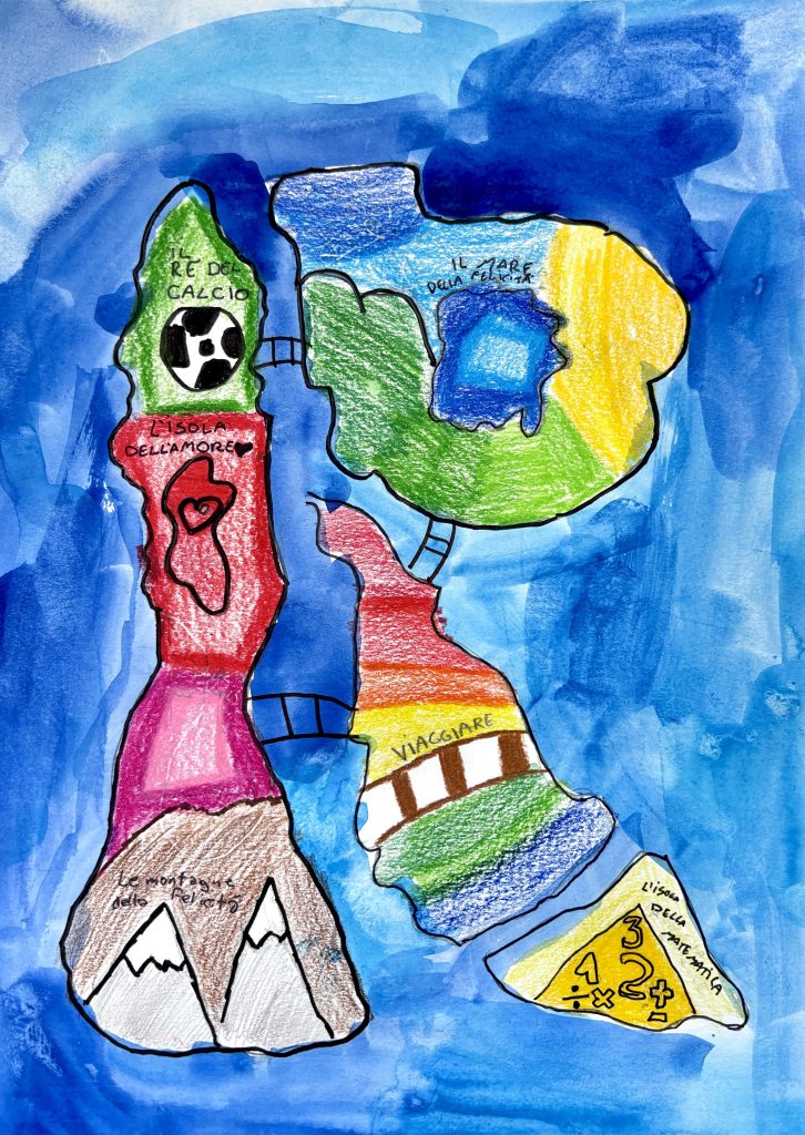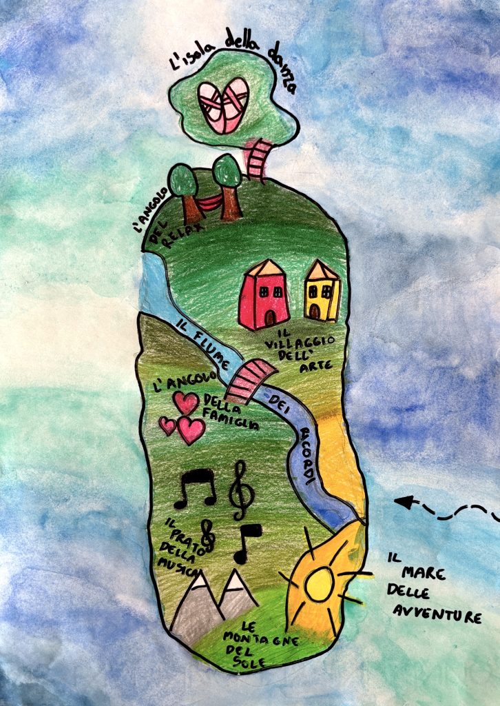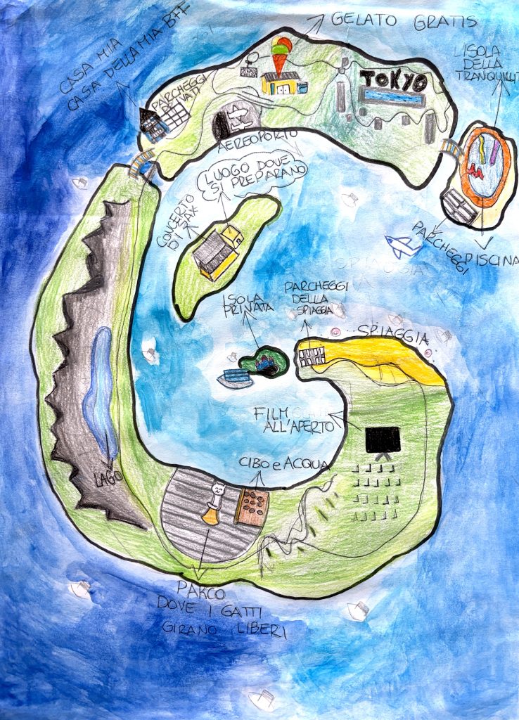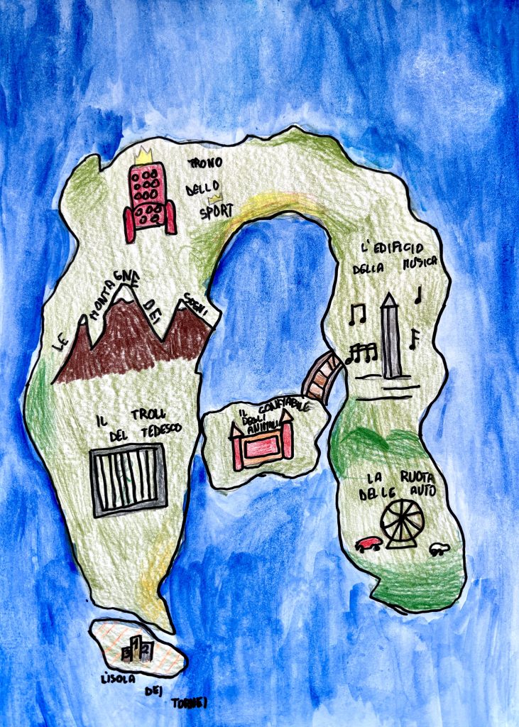 We began with a moment of reflection. On the back of the sheet of paper, we wrote down all the things we like and that are important to us: passions, friends, dreams, favorite foods, interests at school and outside of school, activities with friends/family, sources of well-being, dreams, emotions (sadness, anger, joy). This list, which we created by answering personal questions, became the heart of our island. Then we moved on to the creative phase, matching these words with geographical locations or landscape features. We tried to transform each passion into a piece of map or toponym (such as a mountain, a valley, a bay, a building), matching each interest with a place (natural or man-made) and giving it a creative name. Thus, for example, “The Valley of Bicycles,” “The Mountain of Notes,” or “The City of Gymnastics” were born on our island.