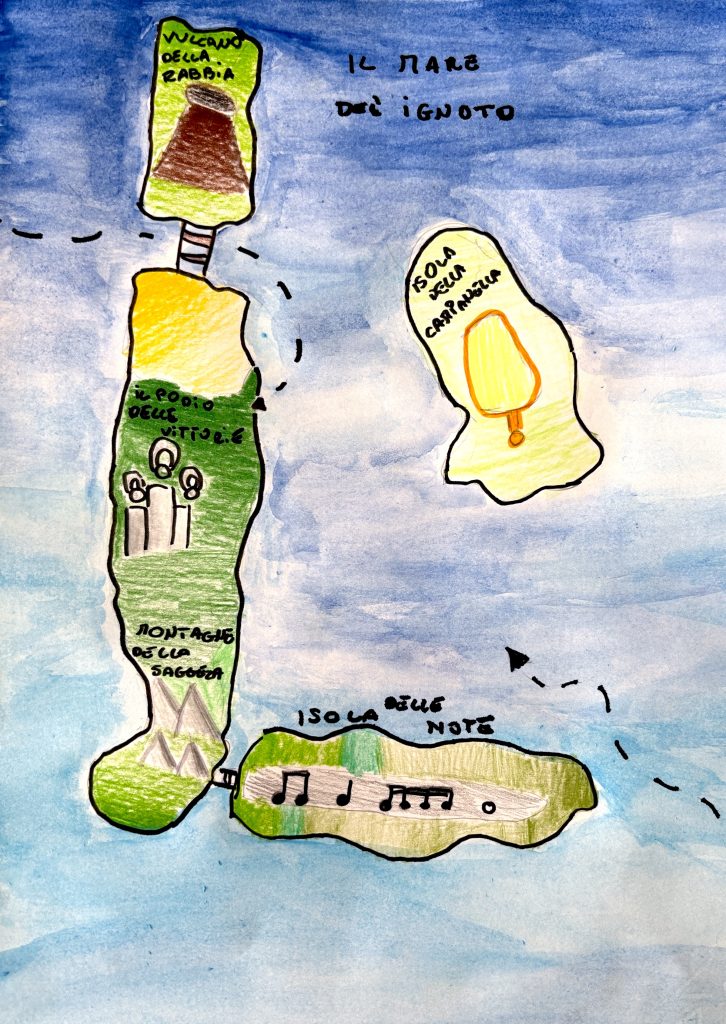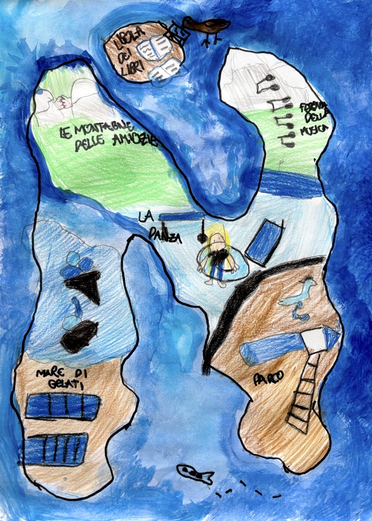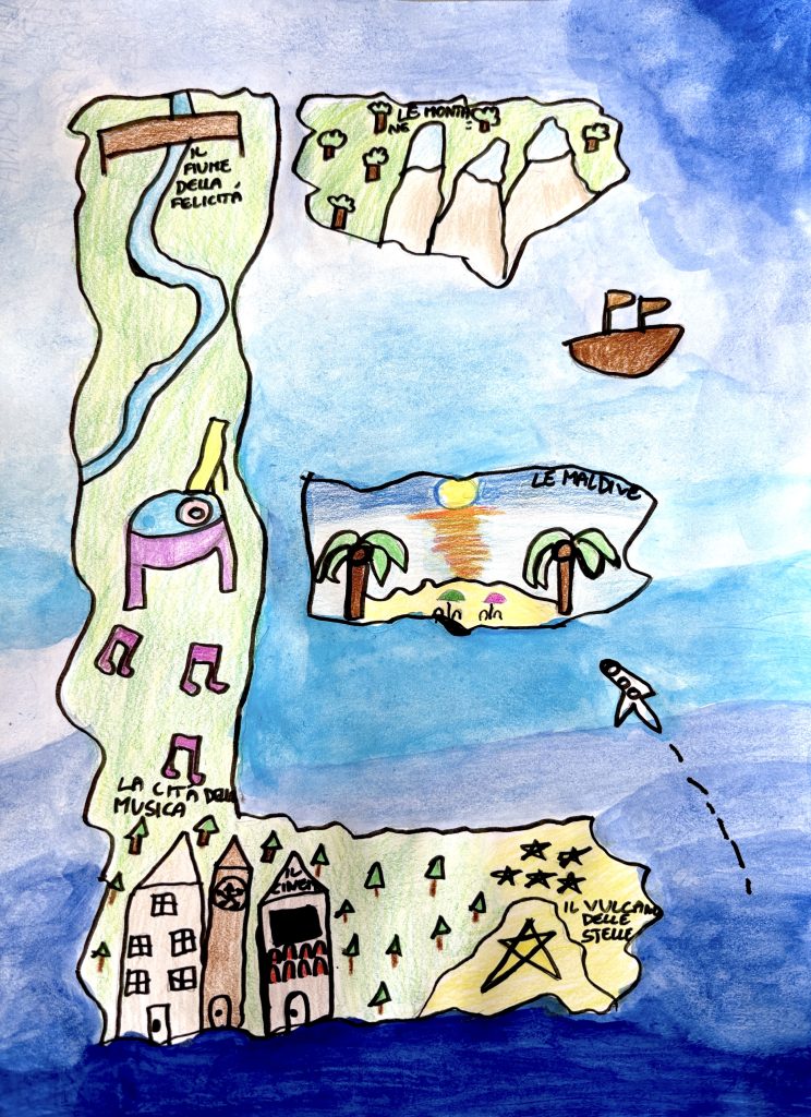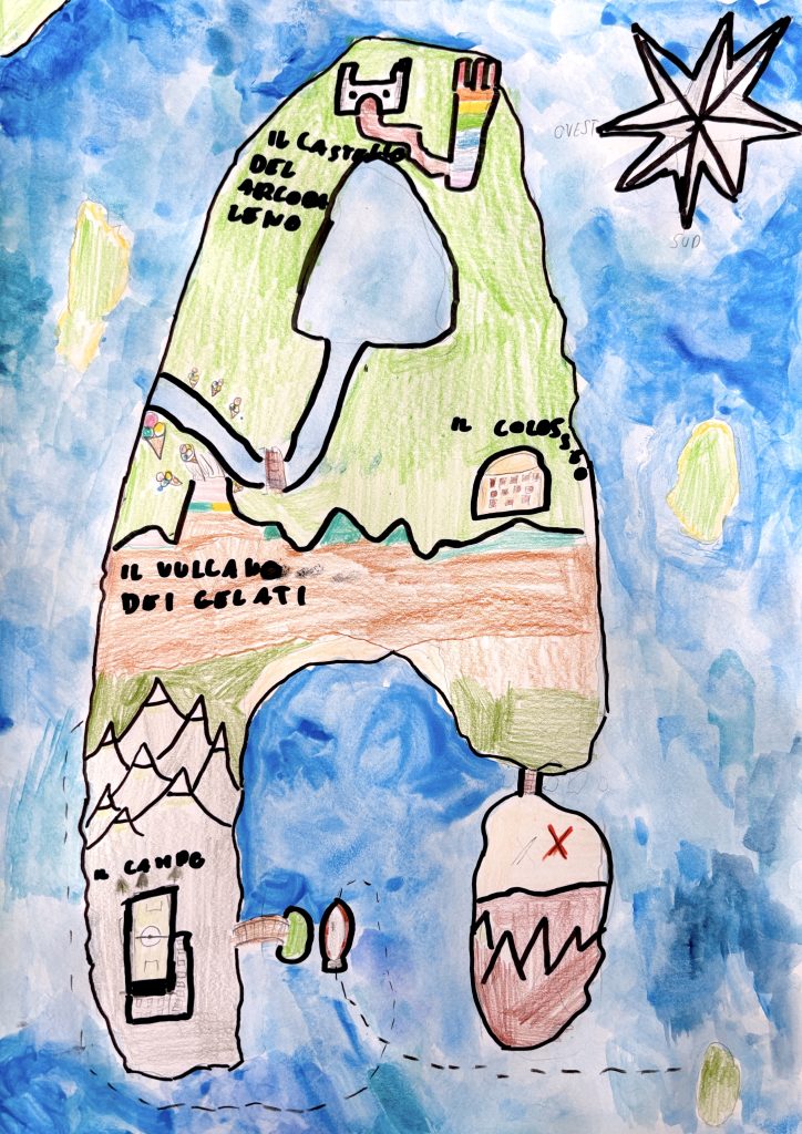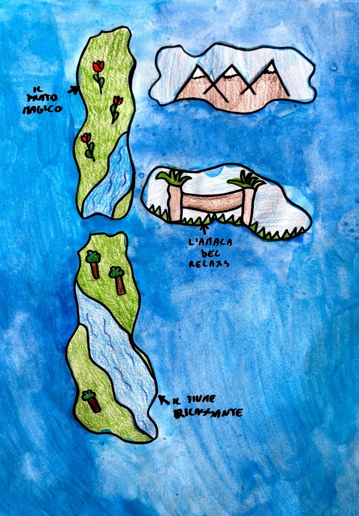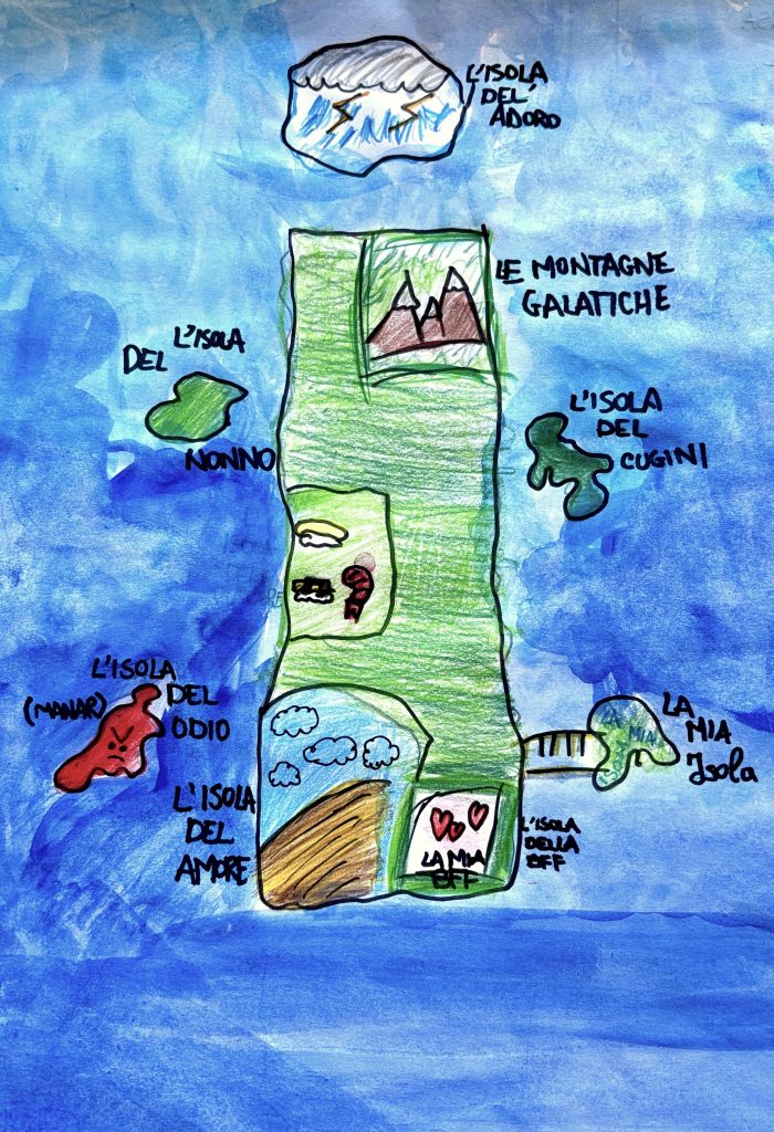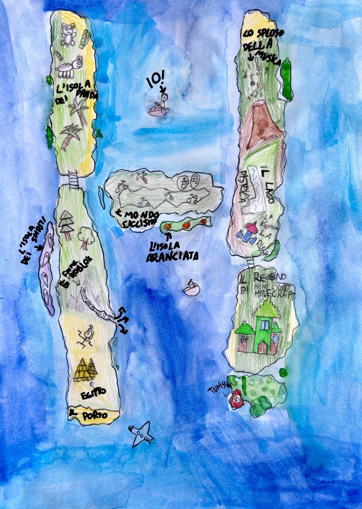 We began with a moment of reflection. On the back of the sheet of paper, we wrote down all the things we like and that are important to us: passions, friends, dreams, favorite foods, interests at school and outside of school, activities with friends/family, sources of well-being, dreams, emotions (sadness, anger, joy). This list, which we created by answering personal questions, became the heart of our island. Then we moved on to the creative phase, matching these words with geographical locations or landscape features. We tried to transform each passion into a piece of map or toponym (such as a mountain, a valley, a bay, a building), matching each interest with a place (natural or man-made) and giving it a creative name. Thus, for example, “The Valley of Bicycles,” “The Mountain of Notes,” or “The City of Gymnastics” were born on our island.