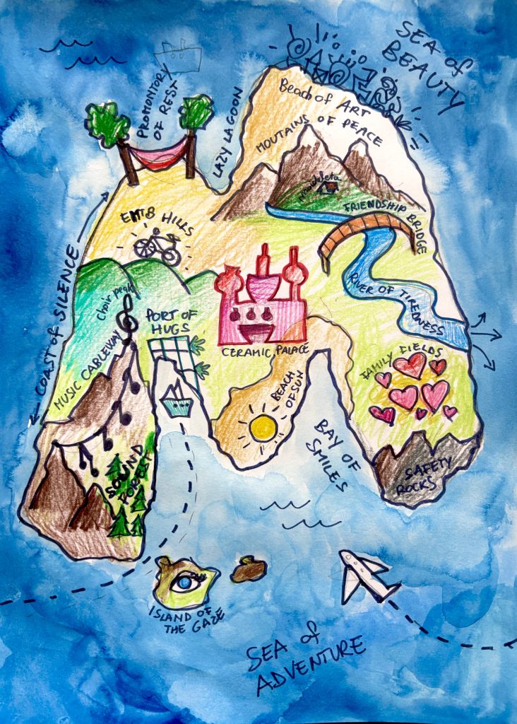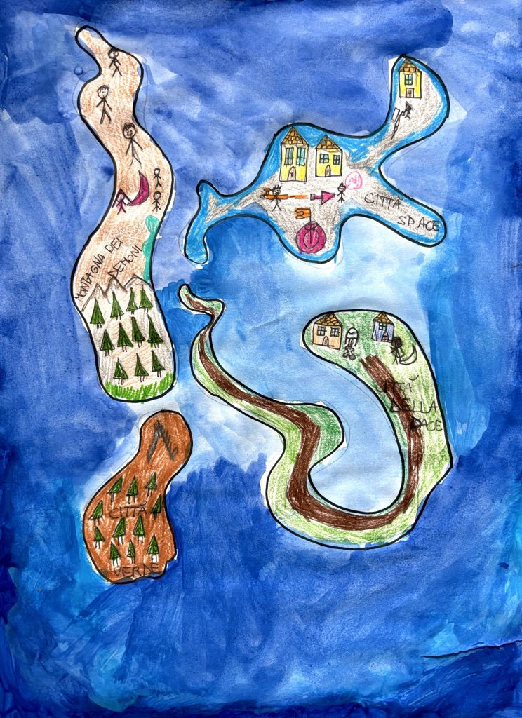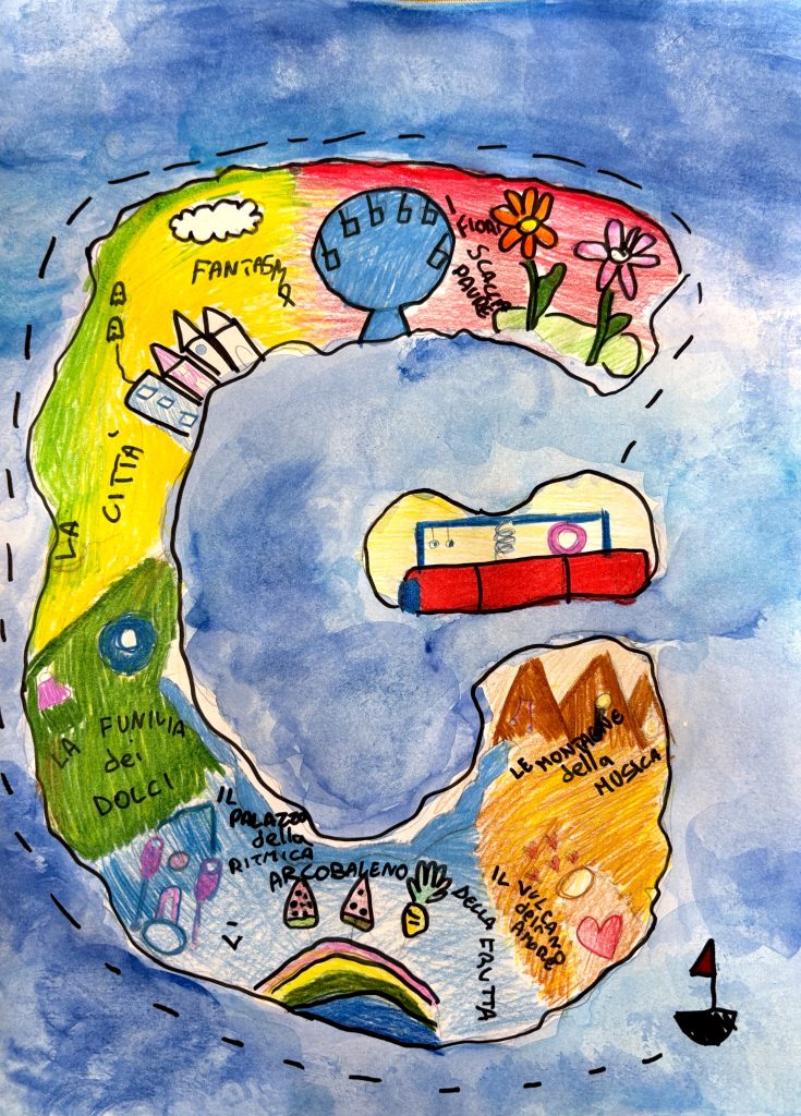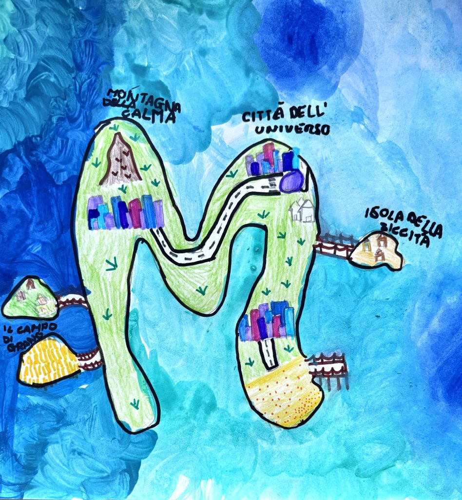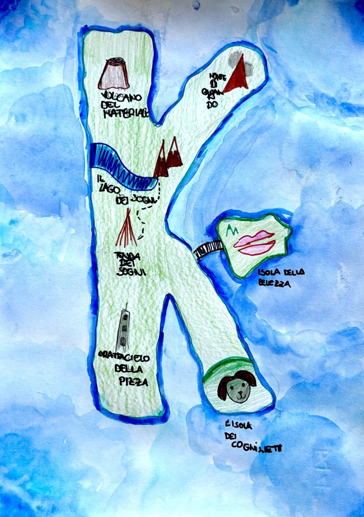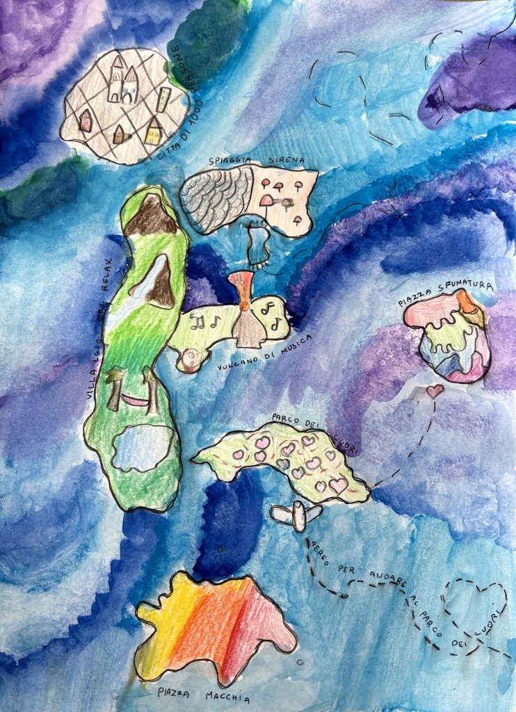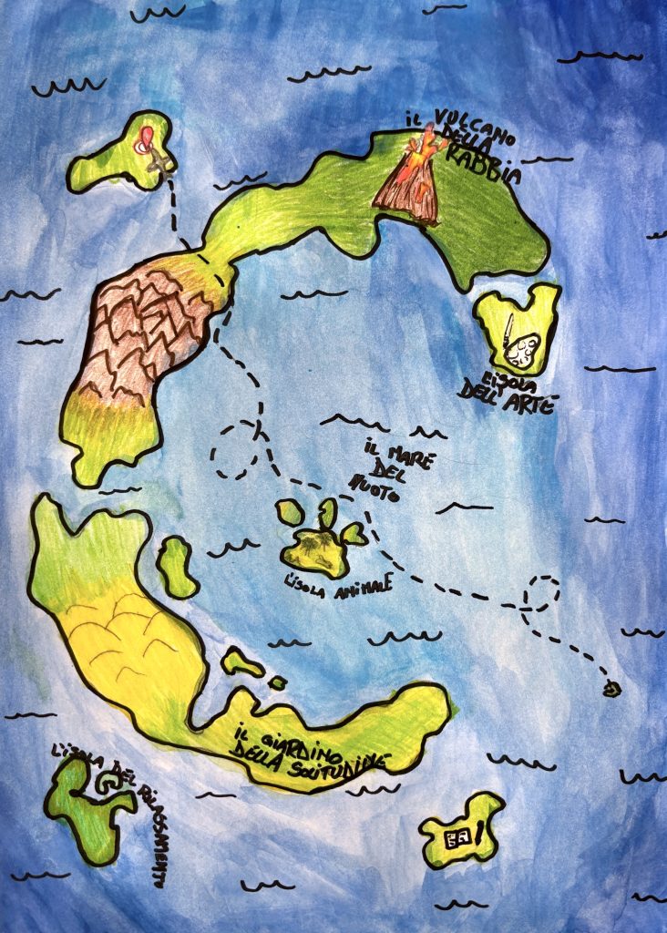 We began with a moment of reflection. On the back of the sheet of paper, we wrote down all the things we like and that are important to us: passions, friends, dreams, favorite foods, interests at school and outside of school, activities with friends/family, sources of well-being, dreams, emotions (sadness, anger, joy). This list, which we created by answering personal questions, became the heart of our island. Then we moved on to the creative phase, matching these words with geographical locations or landscape features. We tried to transform each passion into a piece of map or toponym (such as a mountain, a valley, a bay, a building), matching each interest with a place (natural or man-made) and giving it a creative name. Thus, for example, “The Valley of Bicycles,” “The Mountain of Notes,” or “The City of Gymnastics” were born on our island.