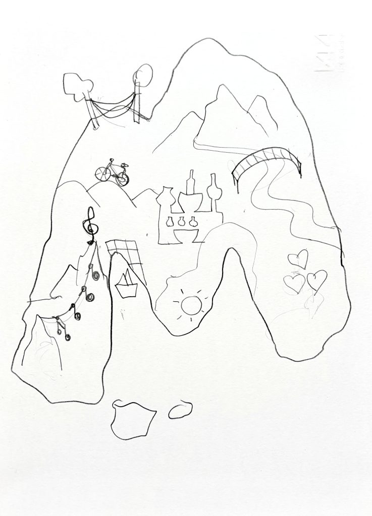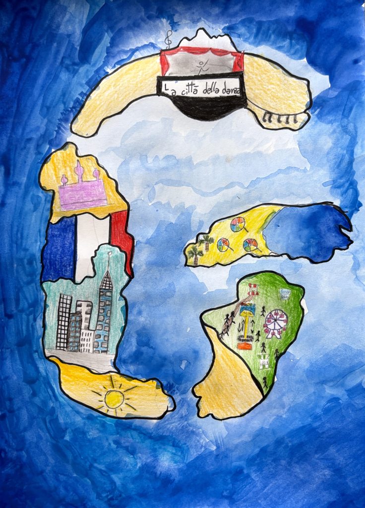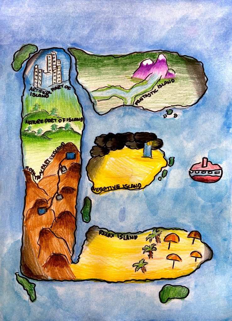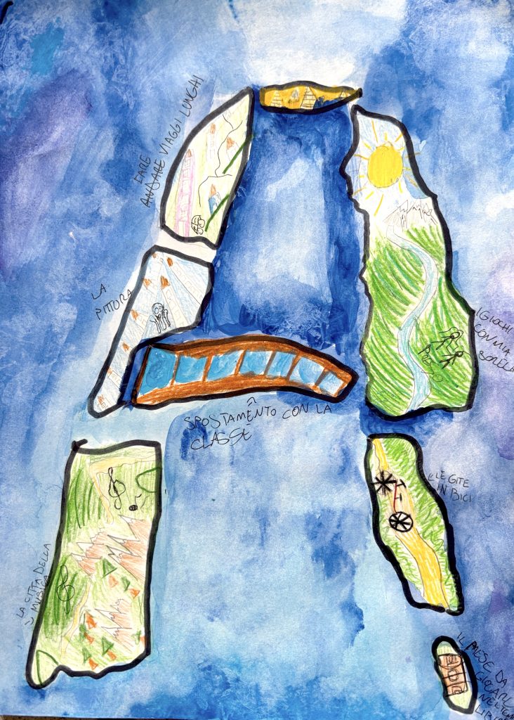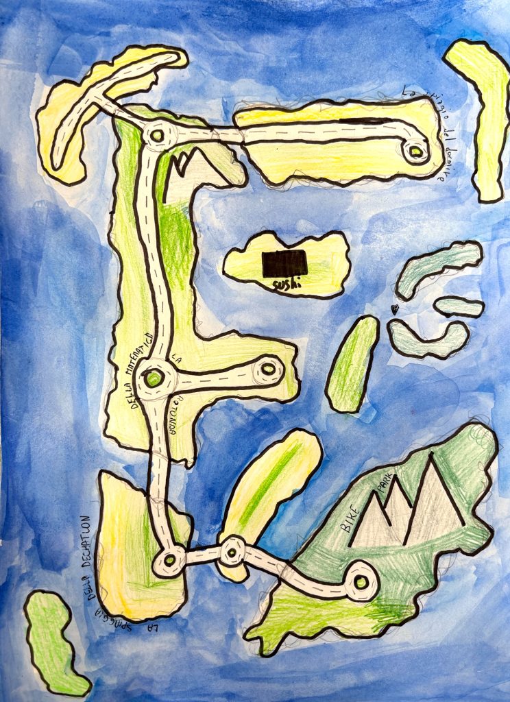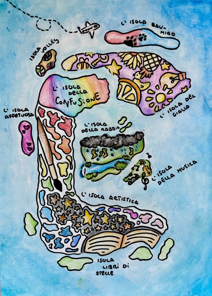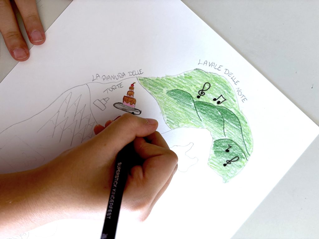 We began with a moment of reflection. On the back of the sheet of paper, we wrote down all the things we like and that are important to us: passions, friends, dreams, favorite foods, interests at school and outside of school, activities with friends/family, sources of well-being, dreams, emotions (sadness, anger, joy). This list, which we created by answering personal questions, became the heart of our island. Then we moved on to the creative phase, matching these words with geographical locations or landscape features. We tried to transform each passion into a piece of map or toponym (such as a mountain, a valley, a bay, a building), matching each interest with a place (natural or man-made) and giving it a creative name. Thus, for example, “The Valley of Bicycles,” “The Mountain of Notes,” or “The City of Gymnastics” were born on our island.