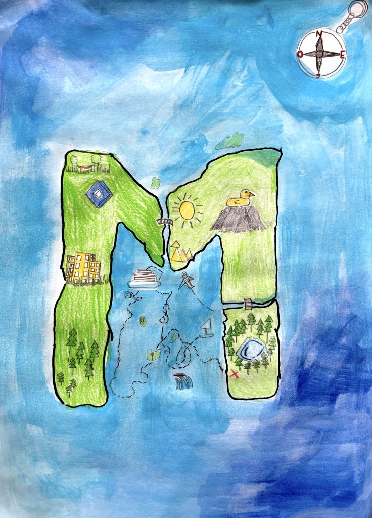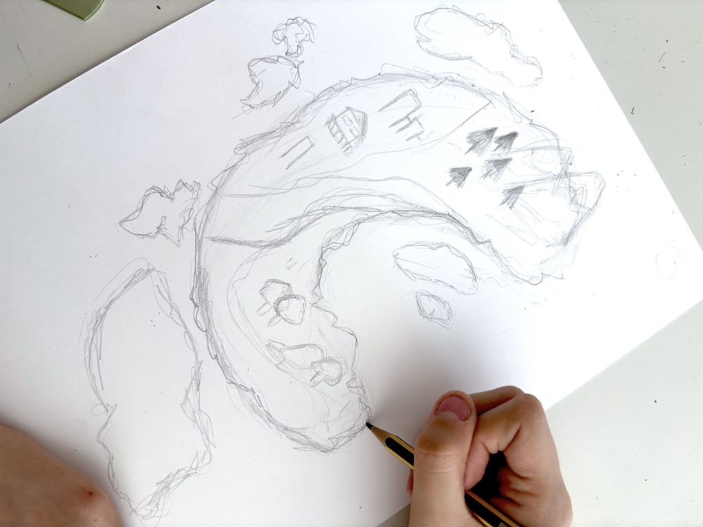 For the outline and shape of the island, we chose to use the initial of our first name (for example, the letter “C” or “M”) and drew it in pencil on the paper. Within this unique outline, we traced the elements that represent us.