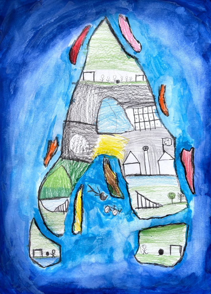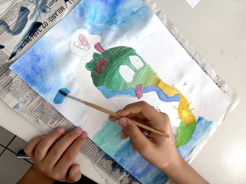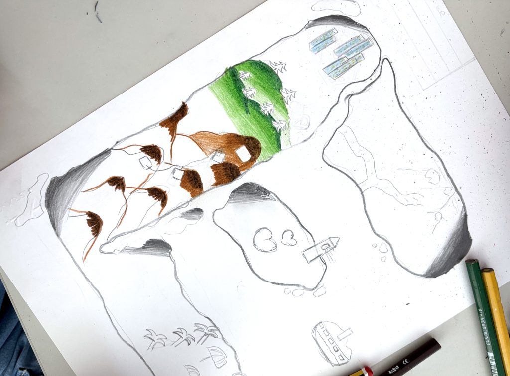 To color the drawing, we used two different techniques. We colored the landforms and elements (mountains, buildings, etc.) with colored pencils, using the classic colors of physical maps (green, brown, yellow). For the sea, we applied watercolors using the “wet-on-wet” technique: we first applied clean water to the sea, followed by blue or light blue paint, to achieve nuanced tones.