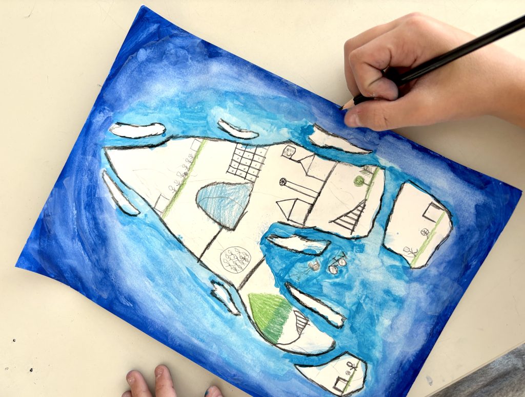 Once the drawing was completely dry, we moved on to the finishing touches. We traced all the outlines and details with a fine-tipped black marker to make the lines clearer. Finally, we added the names we’d invented for each location and area of our personal island.