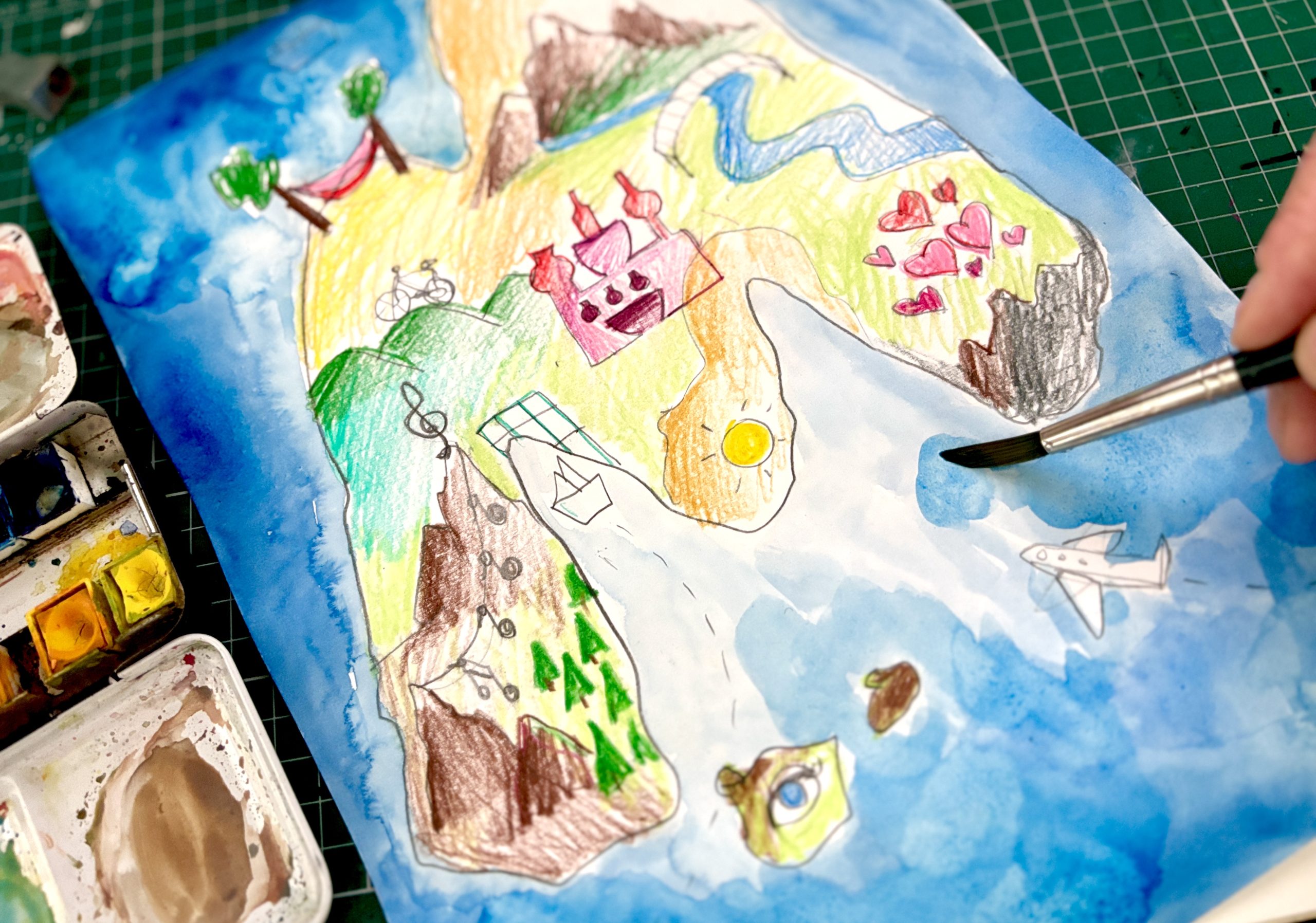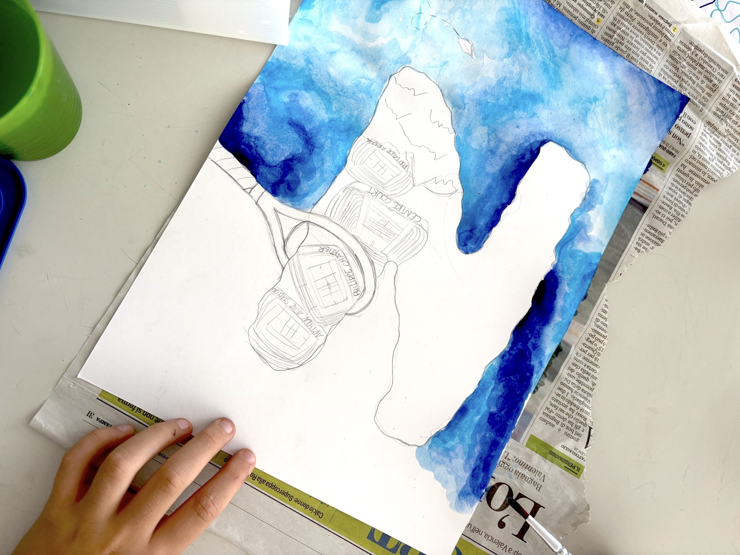 To color the drawing, we used two different techniques. We colored the landforms and elements (mountains, buildings, etc.) with colored pencils, using the classic colors of physical maps (green, brown, yellow). For the sea, we applied watercolors using the “wet-on-wet” technique: we first applied clean water to the sea, followed by blue or light blue paint, to achieve nuanced tones.