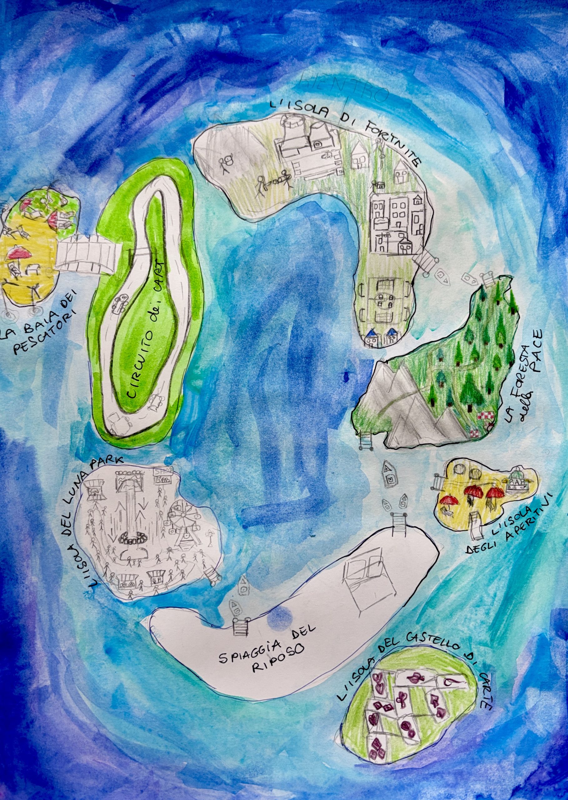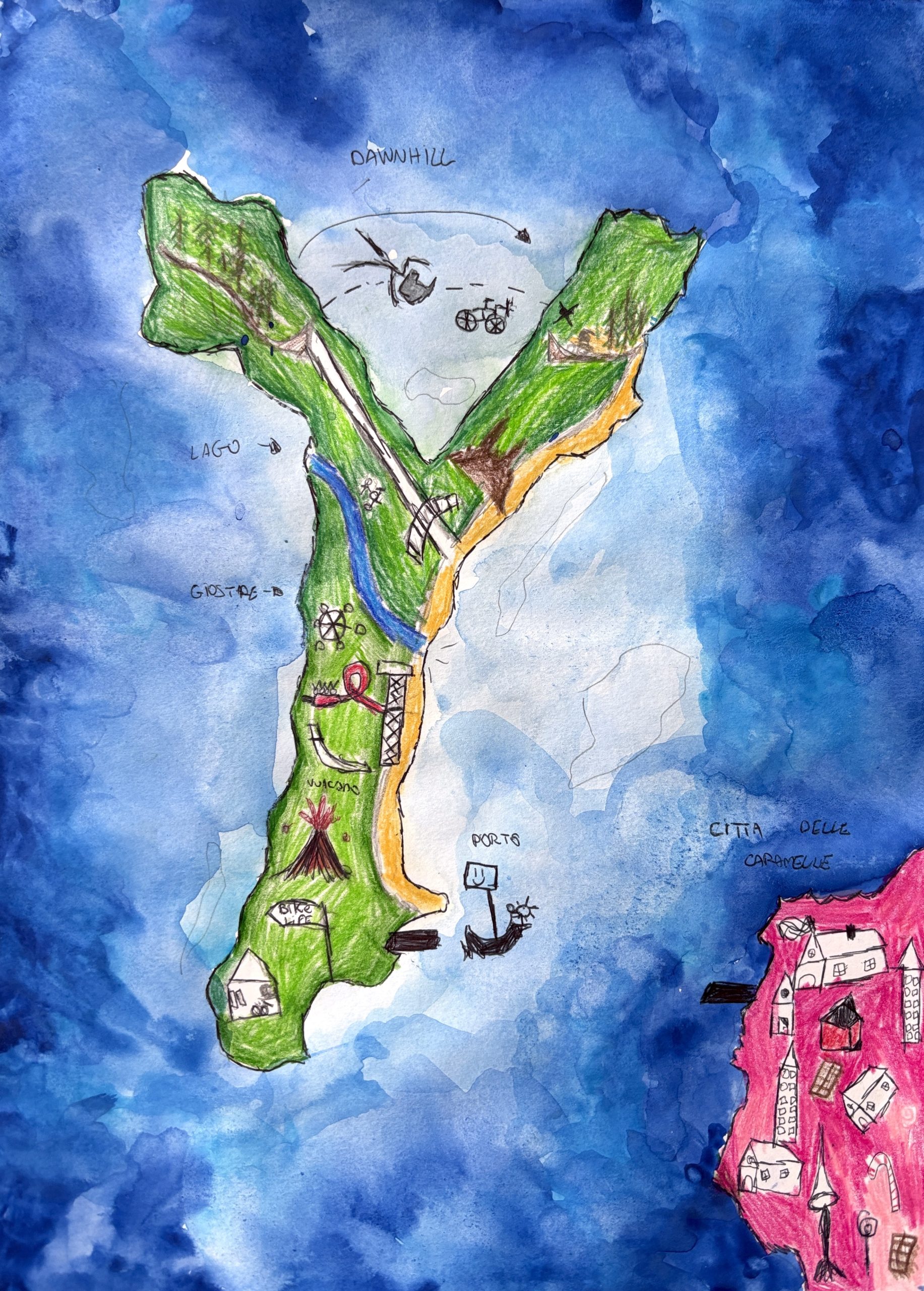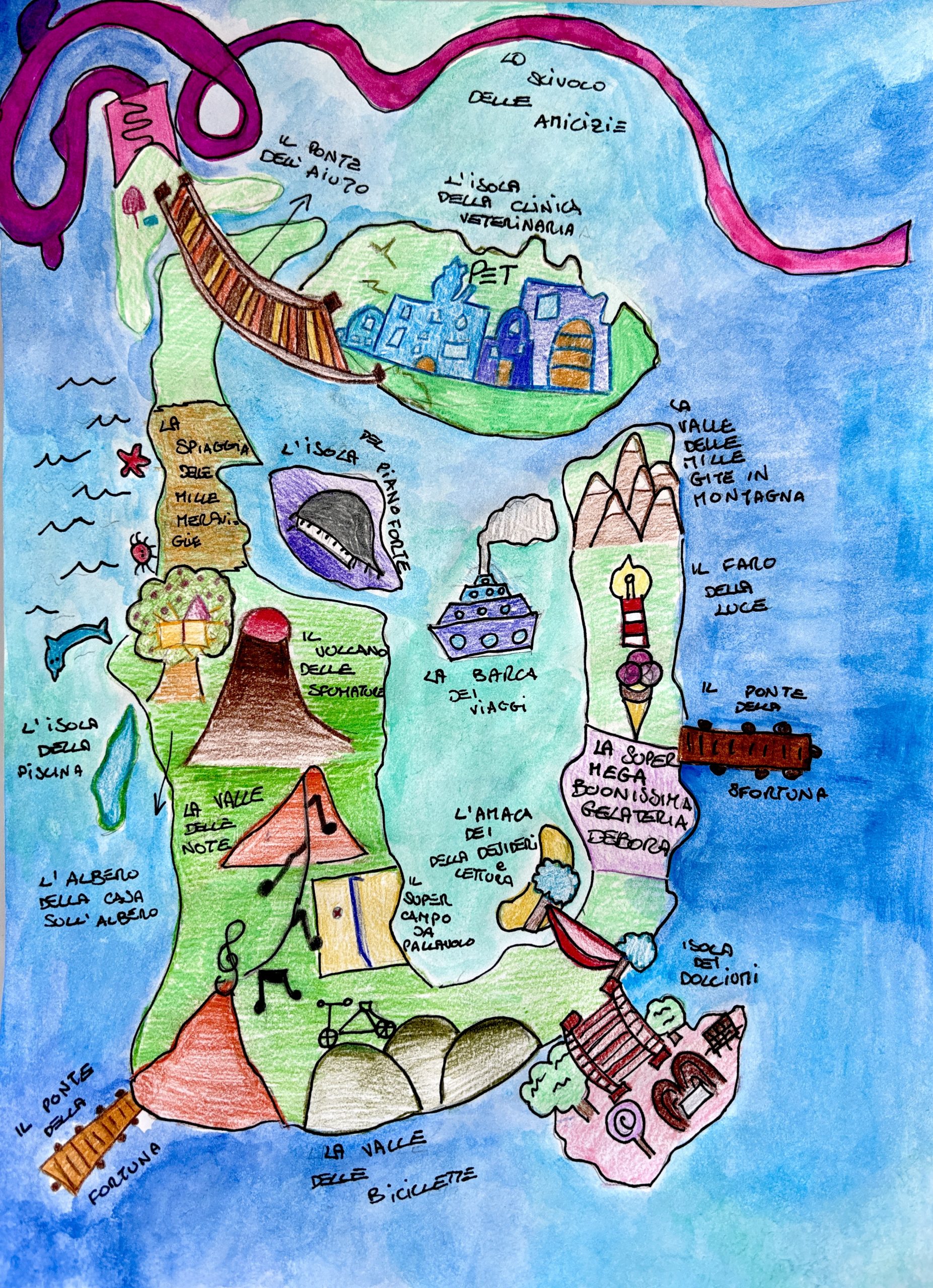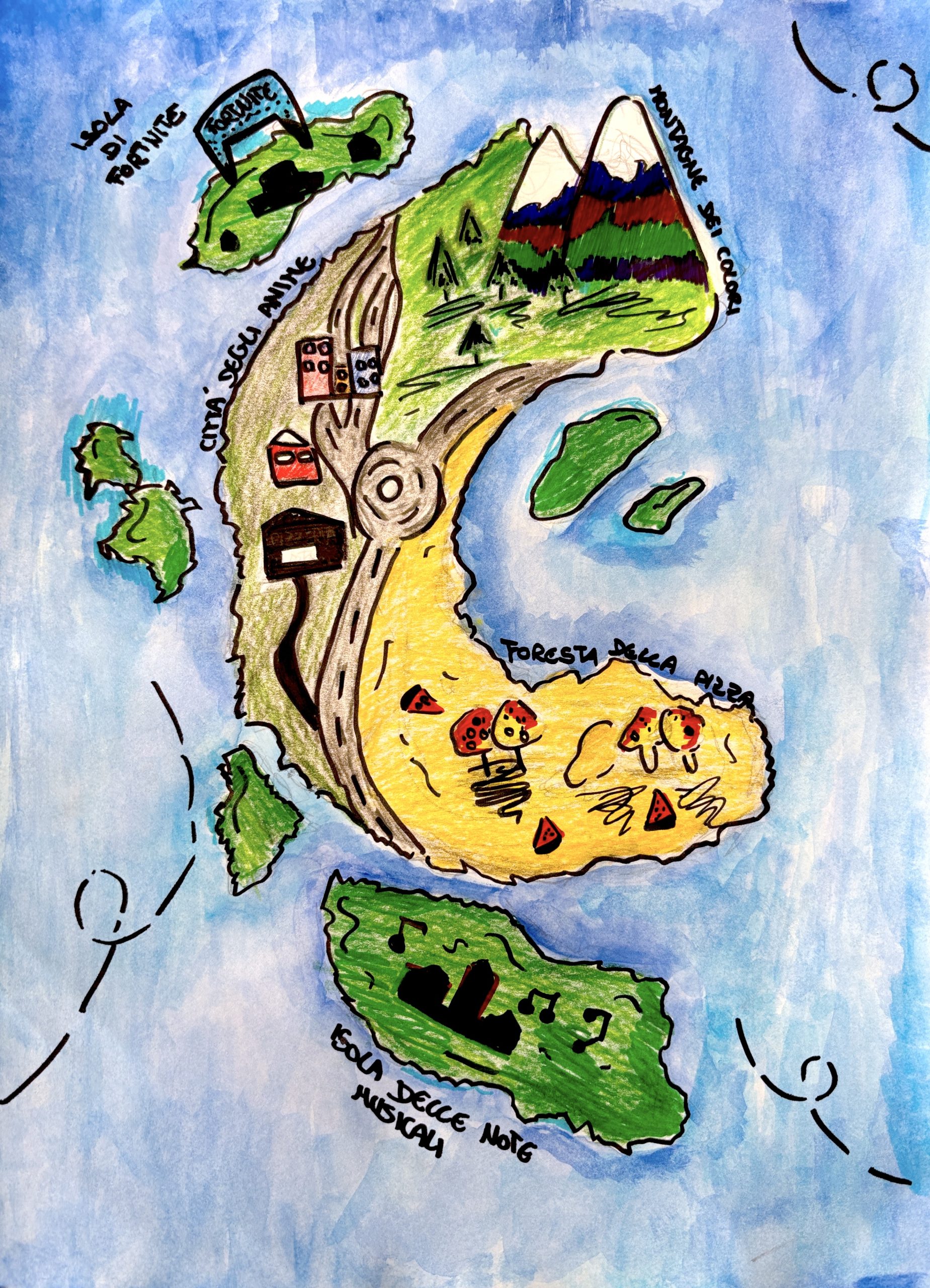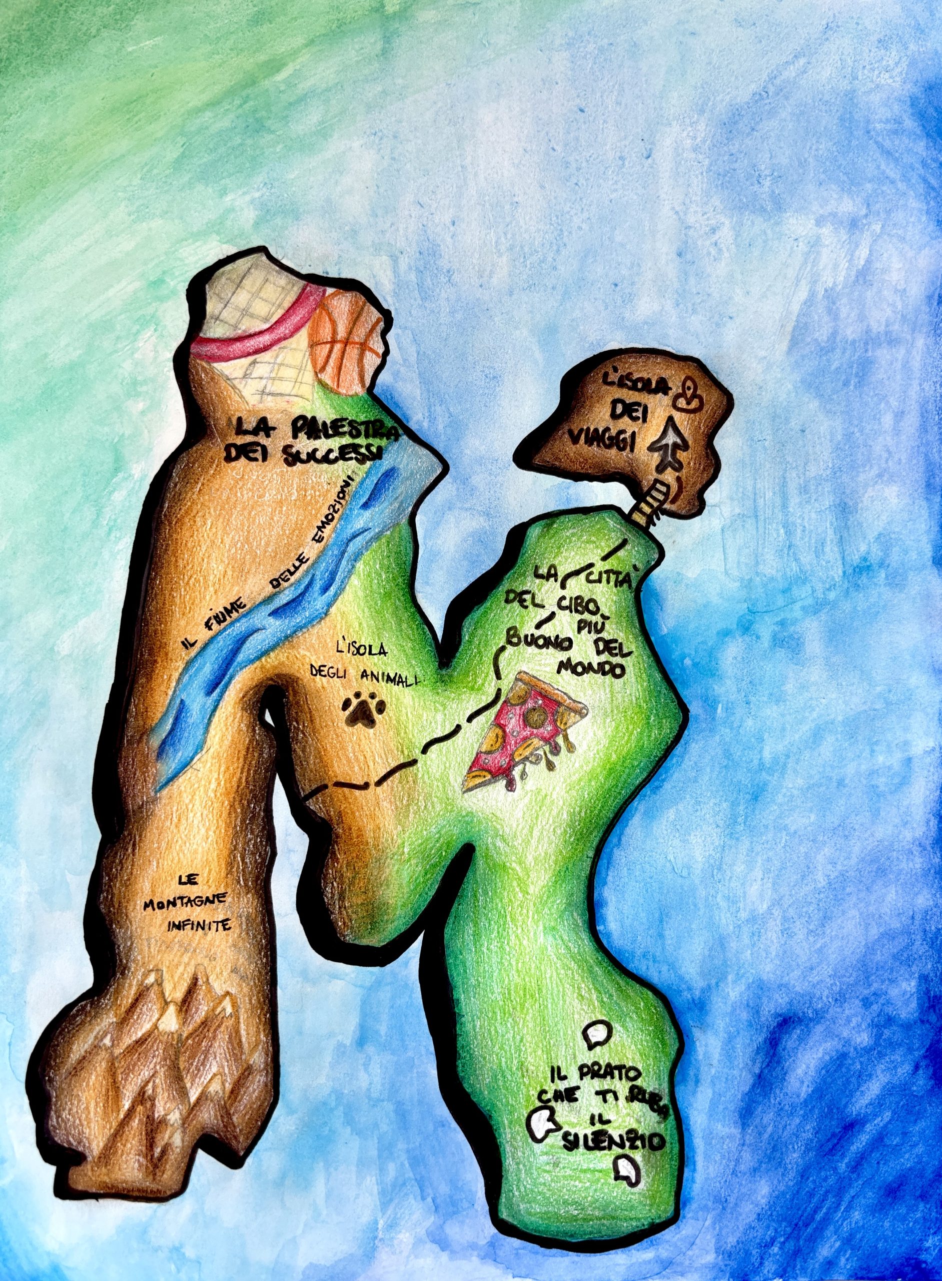 We began with a moment of reflection. On the back of the sheet of paper, we wrote down all the things we like and that are important to us: passions, friends, dreams, favorite foods, interests at school and outside of school, activities with friends/family, sources of well-being, dreams, emotions (sadness, anger, joy). This list, which we created by answering personal questions, became the heart of our island. Then we moved on to the creative phase, matching these words with geographical locations or landscape features. We tried to transform each passion into a piece of map or toponym (such as a mountain, a valley, a bay, a building), matching each interest with a place (natural or man-made) and giving it a creative name. Thus, for example, “The Valley of Bicycles,” “The Mountain of Notes,” or “The City of Gymnastics” were born on our island.