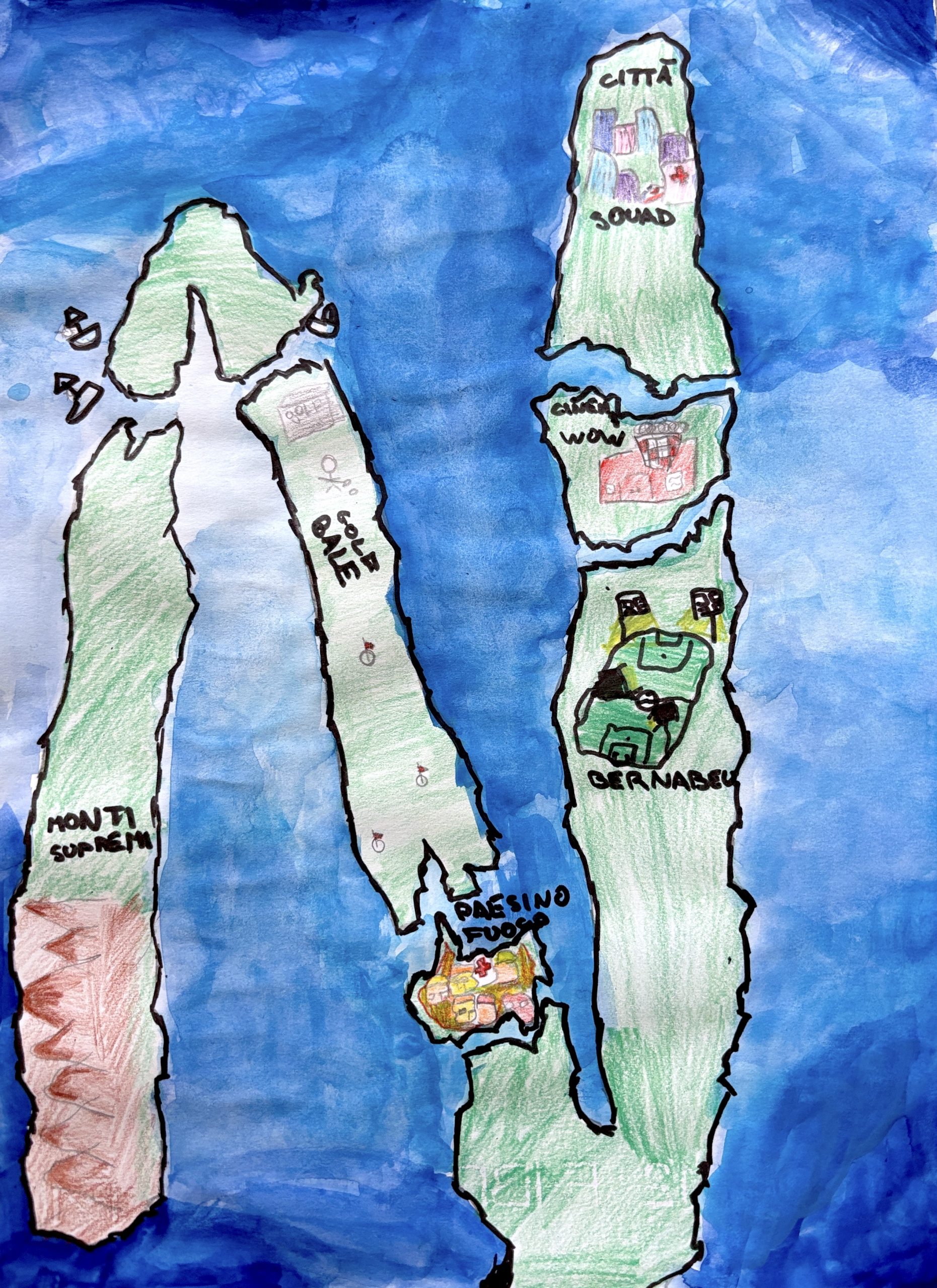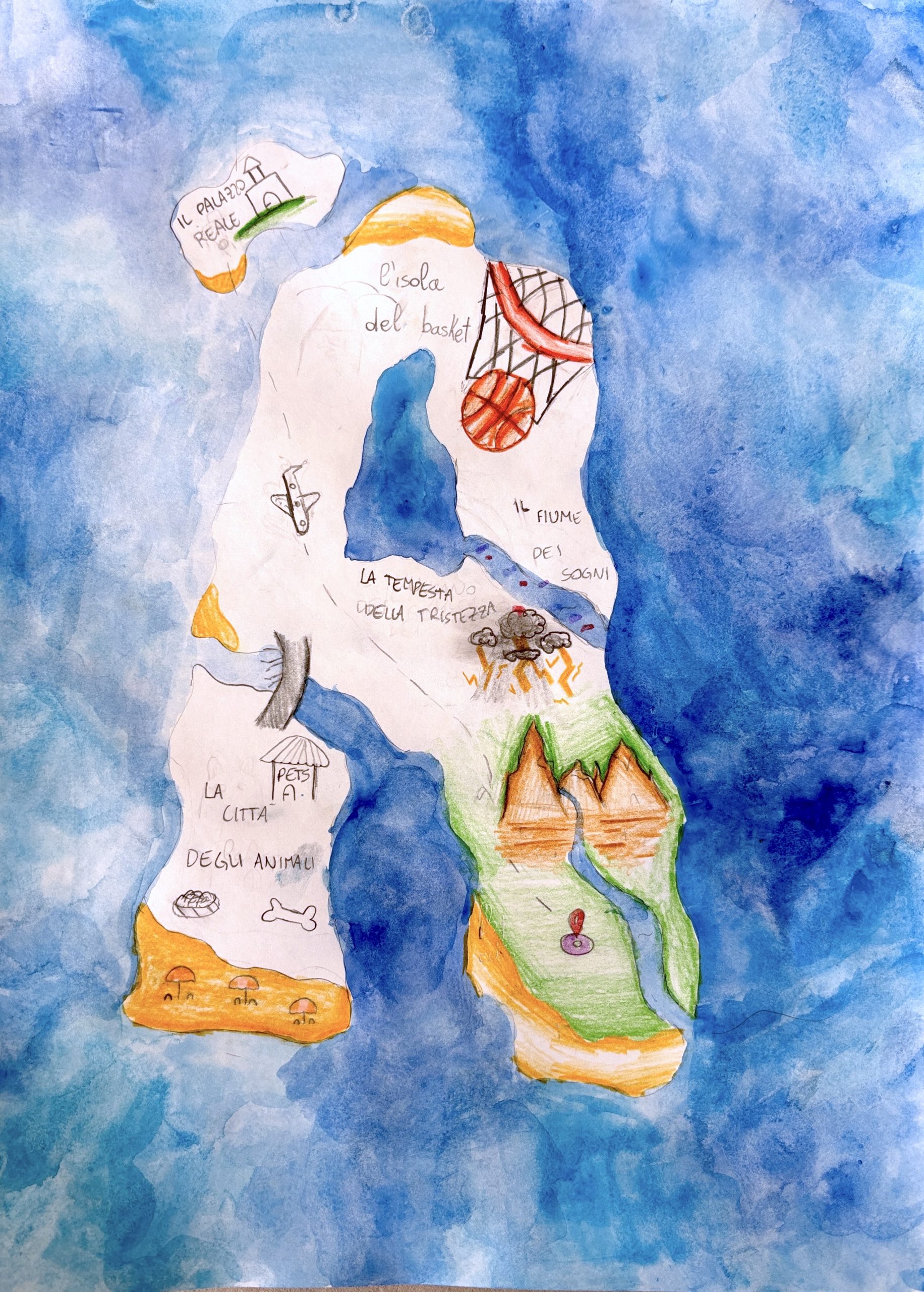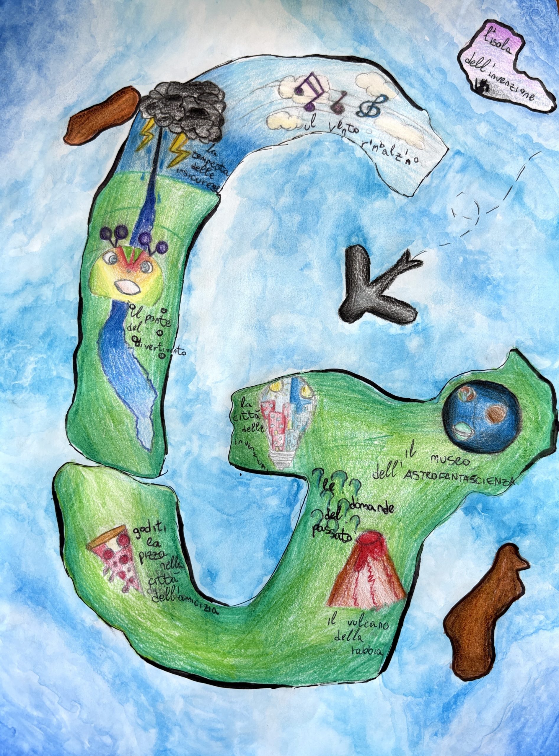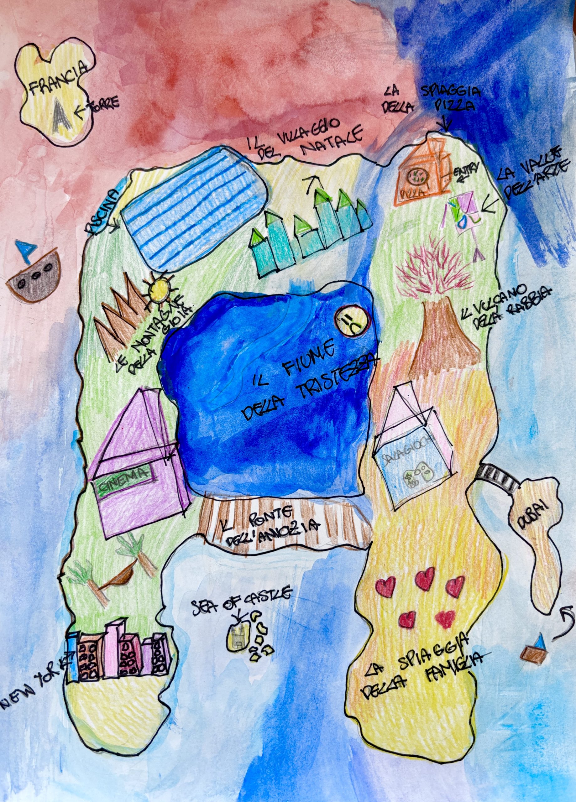We began with a moment of reflection. On the back of the sheet of paper, we wrote down all the things we like and that are important to us: passions, friends, dreams, favorite foods, interests at school and outside of school, activities with friends/family, sources of well-being, dreams, emotions (sadness, anger, joy). This list, which we created by answering personal questions, became the heart of our island. Then we moved on to the creative phase, matching these words with geographical locations or landscape features. We tried to transform each passion into a piece of map or toponym (such as a mountain, a valley, a bay, a building), matching each interest with a place (natural or man-made) and giving it a creative name. Thus, for example, “The Valley of Bicycles,” “The Mountain of Notes,” or “The City of Gymnastics” were born on our island.