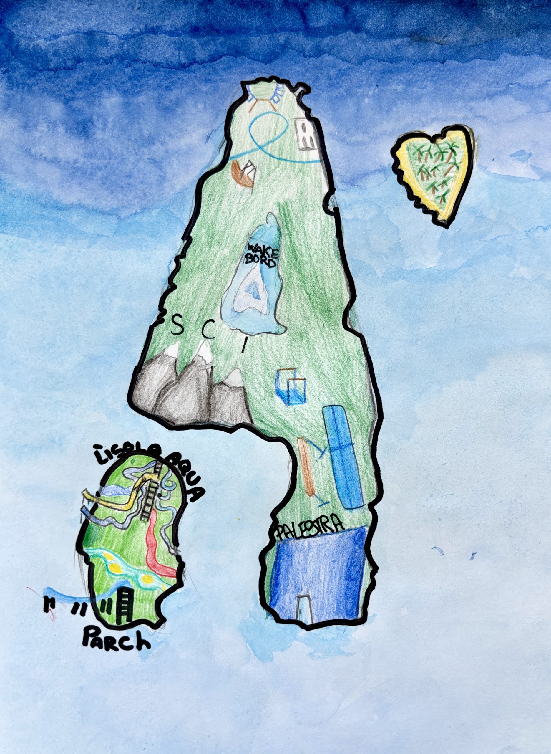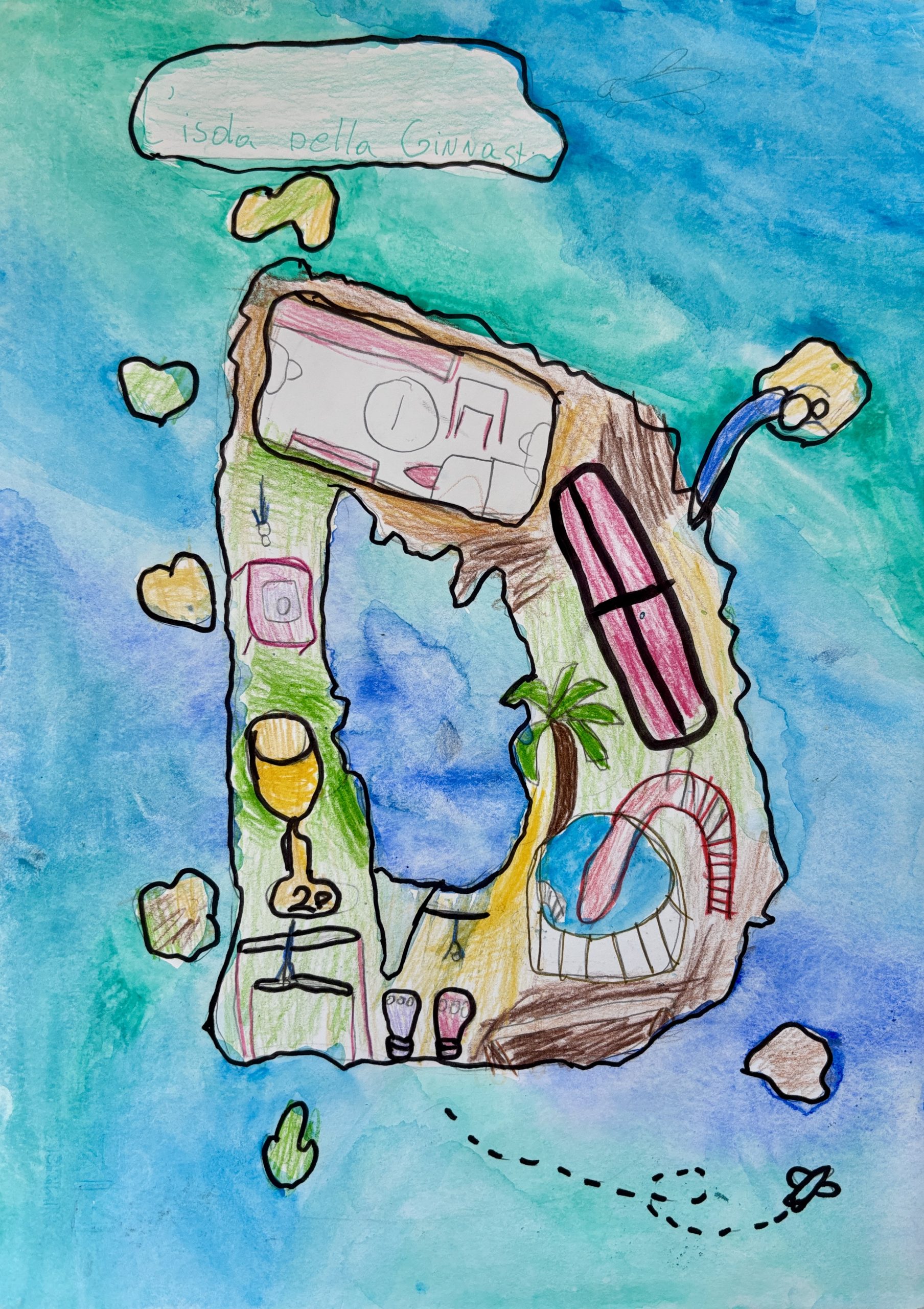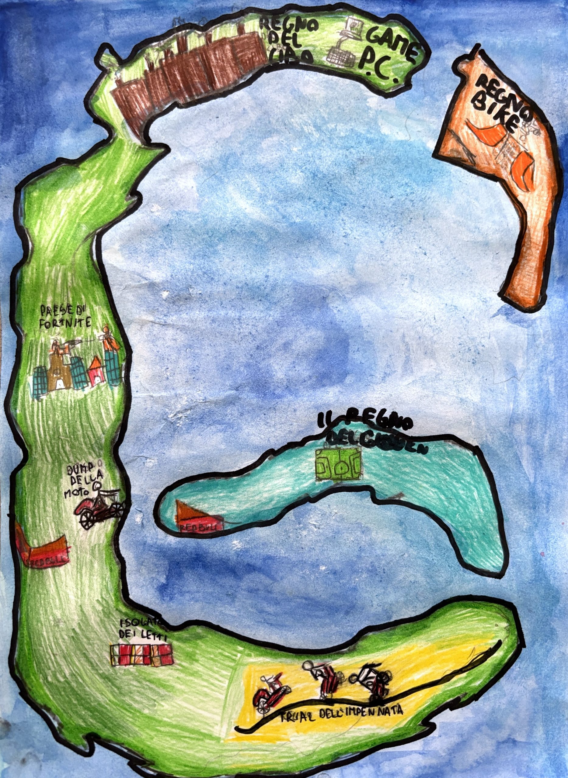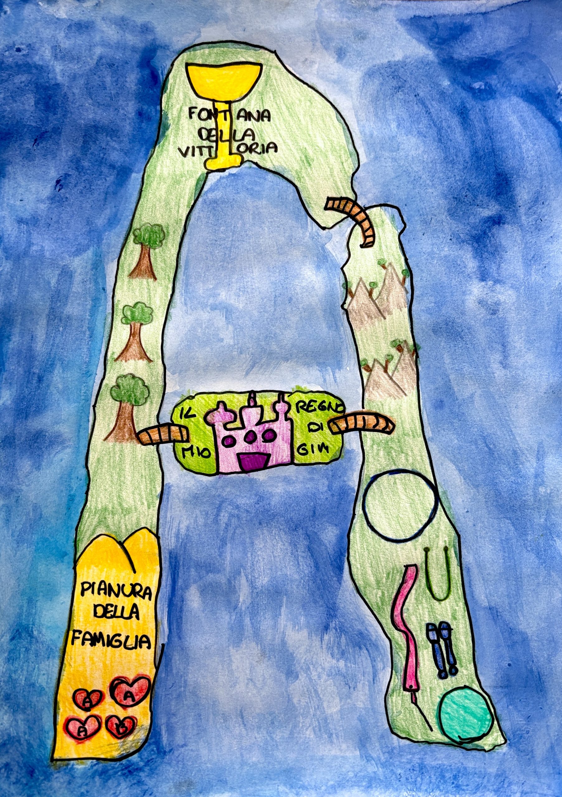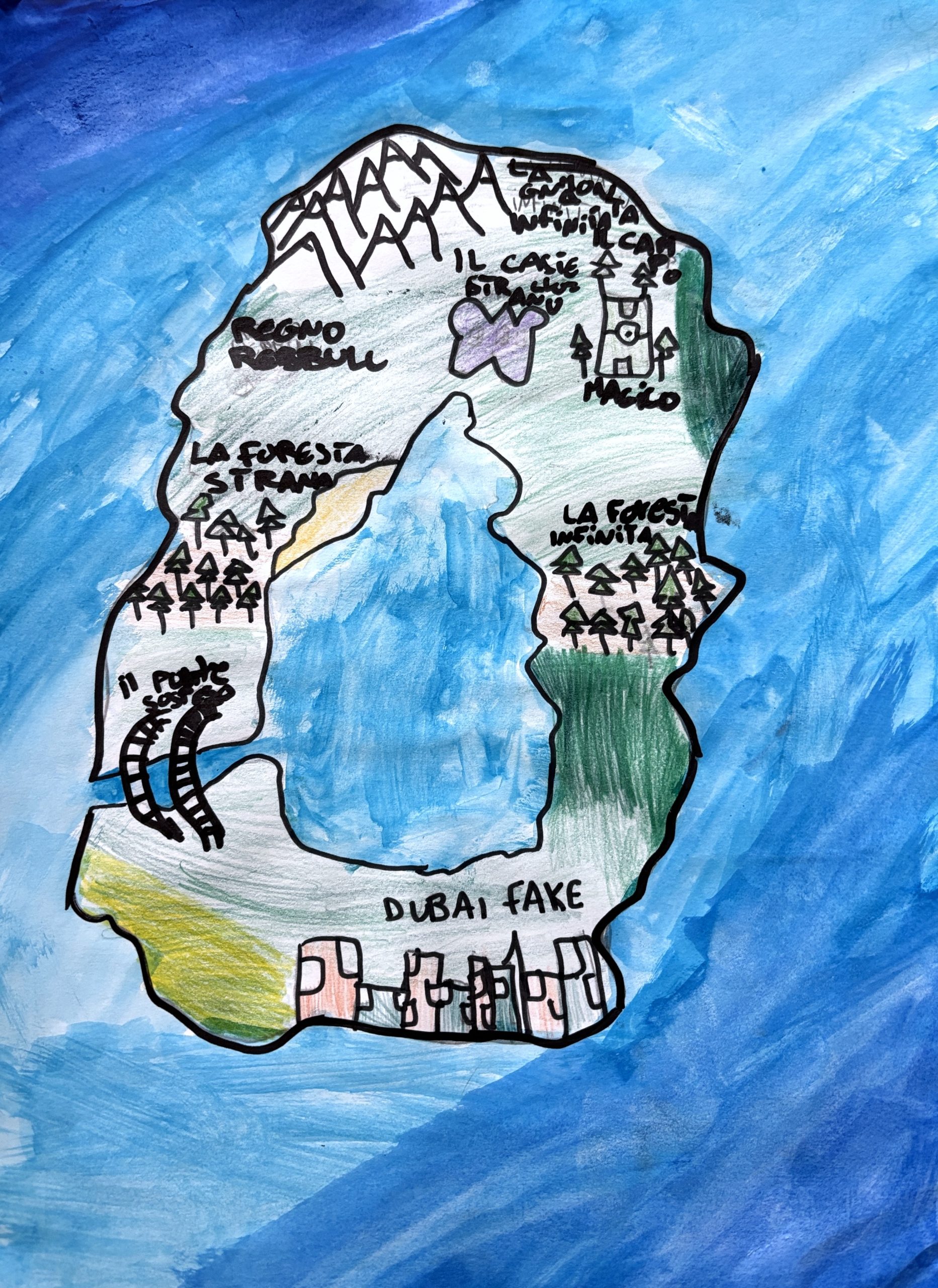 We began with a moment of reflection. On the back of the sheet of paper, we wrote down all the things we like and that are important to us: passions, friends, dreams, favorite foods, interests at school and outside of school, activities with friends/family, sources of well-being, dreams, emotions (sadness, anger, joy). This list, which we created by answering personal questions, became the heart of our island. Then we moved on to the creative phase, matching these words with geographical locations or landscape features. We tried to transform each passion into a piece of map or toponym (such as a mountain, a valley, a bay, a building), matching each interest with a place (natural or man-made) and giving it a creative name. Thus, for example, “The Valley of Bicycles,” “The Mountain of Notes,” or “The City of Gymnastics” were born on our island.