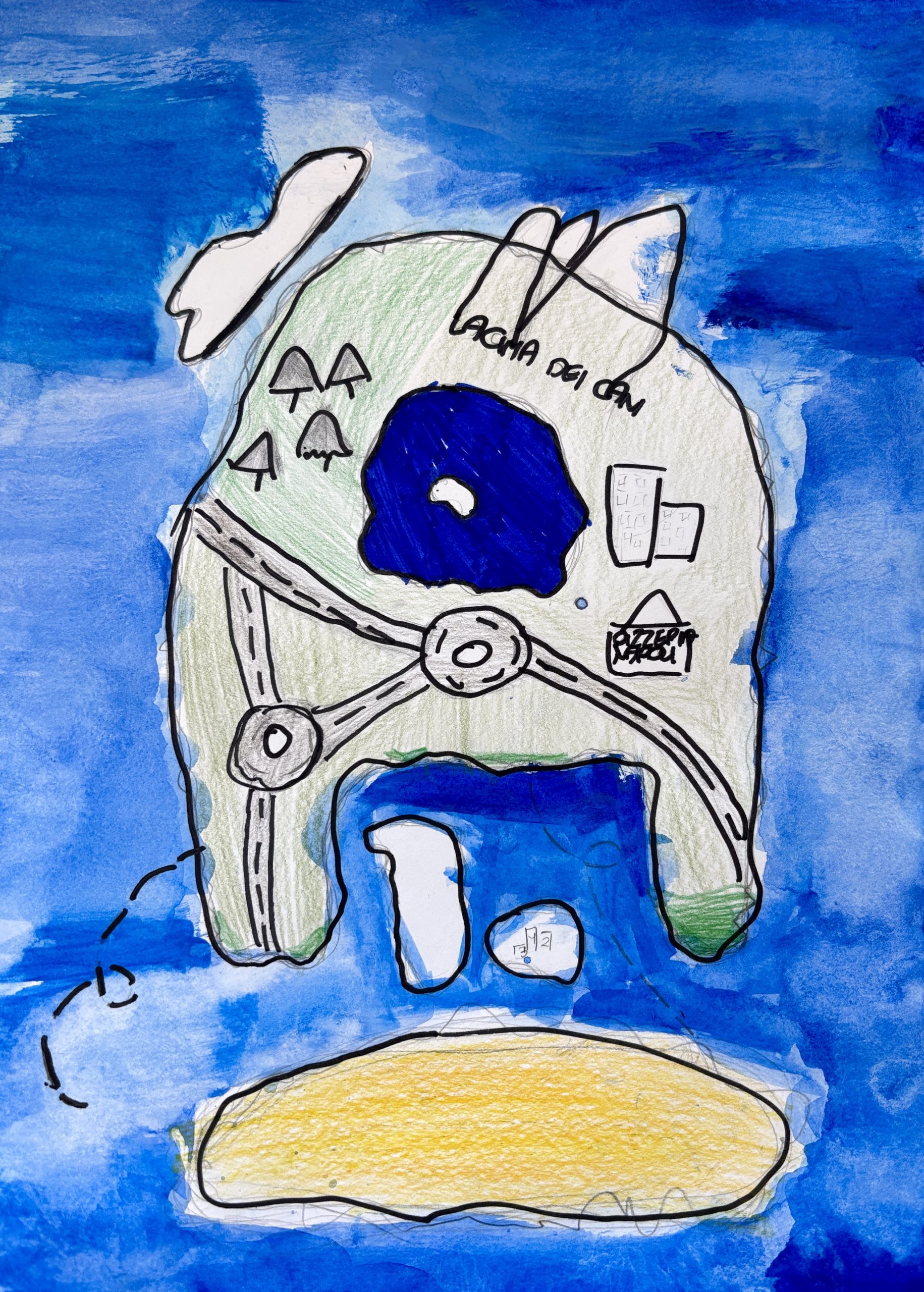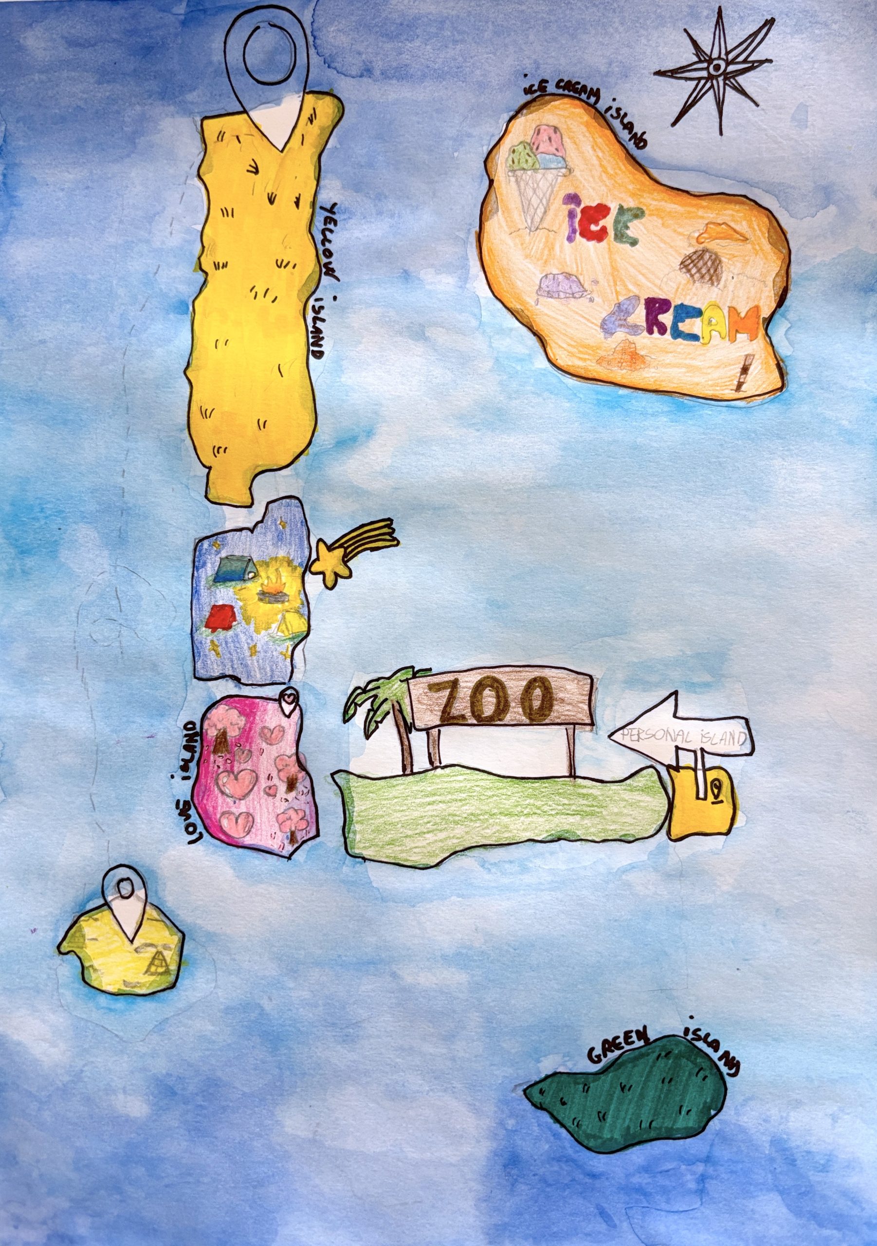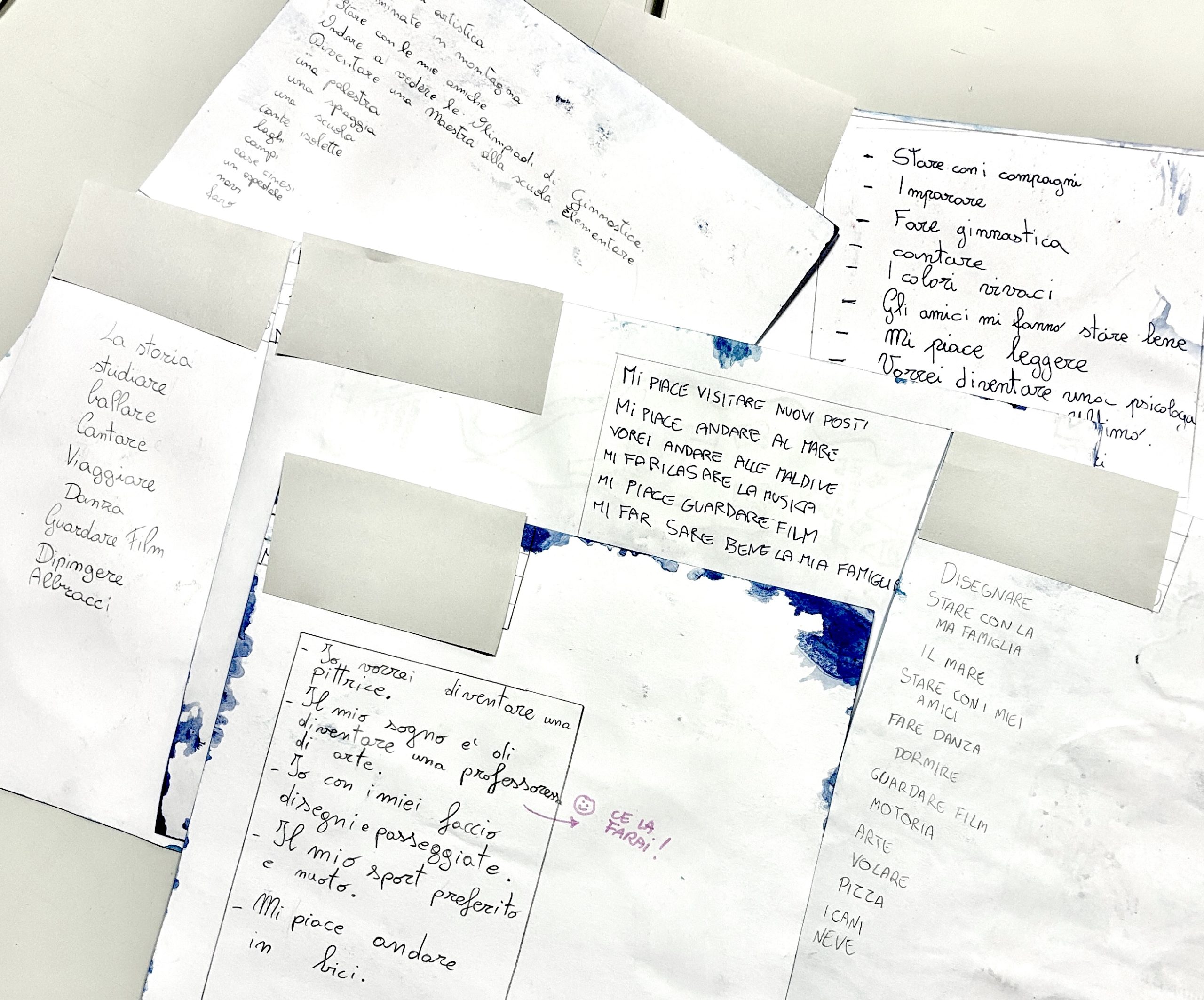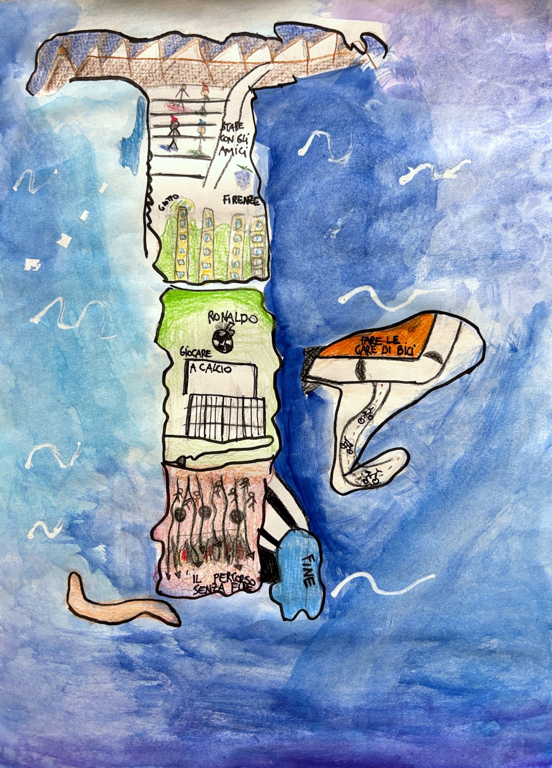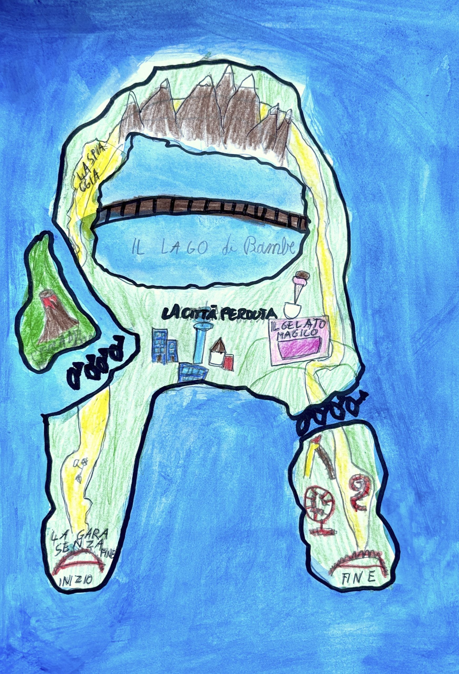 We began with a moment of reflection. On the back of the sheet of paper, we wrote down all the things we like and that are important to us: passions, friends, dreams, favorite foods, interests at school and outside of school, activities with friends/family, sources of well-being, dreams, emotions (sadness, anger, joy). This list, which we created by answering personal questions, became the heart of our island. Then we moved on to the creative phase, matching these words with geographical locations or landscape features. We tried to transform each passion into a piece of map or toponym (such as a mountain, a valley, a bay, a building), matching each interest with a place (natural or man-made) and giving it a creative name. Thus, for example, “The Valley of Bicycles,” “The Mountain of Notes,” or “The City of Gymnastics” were born on our island.