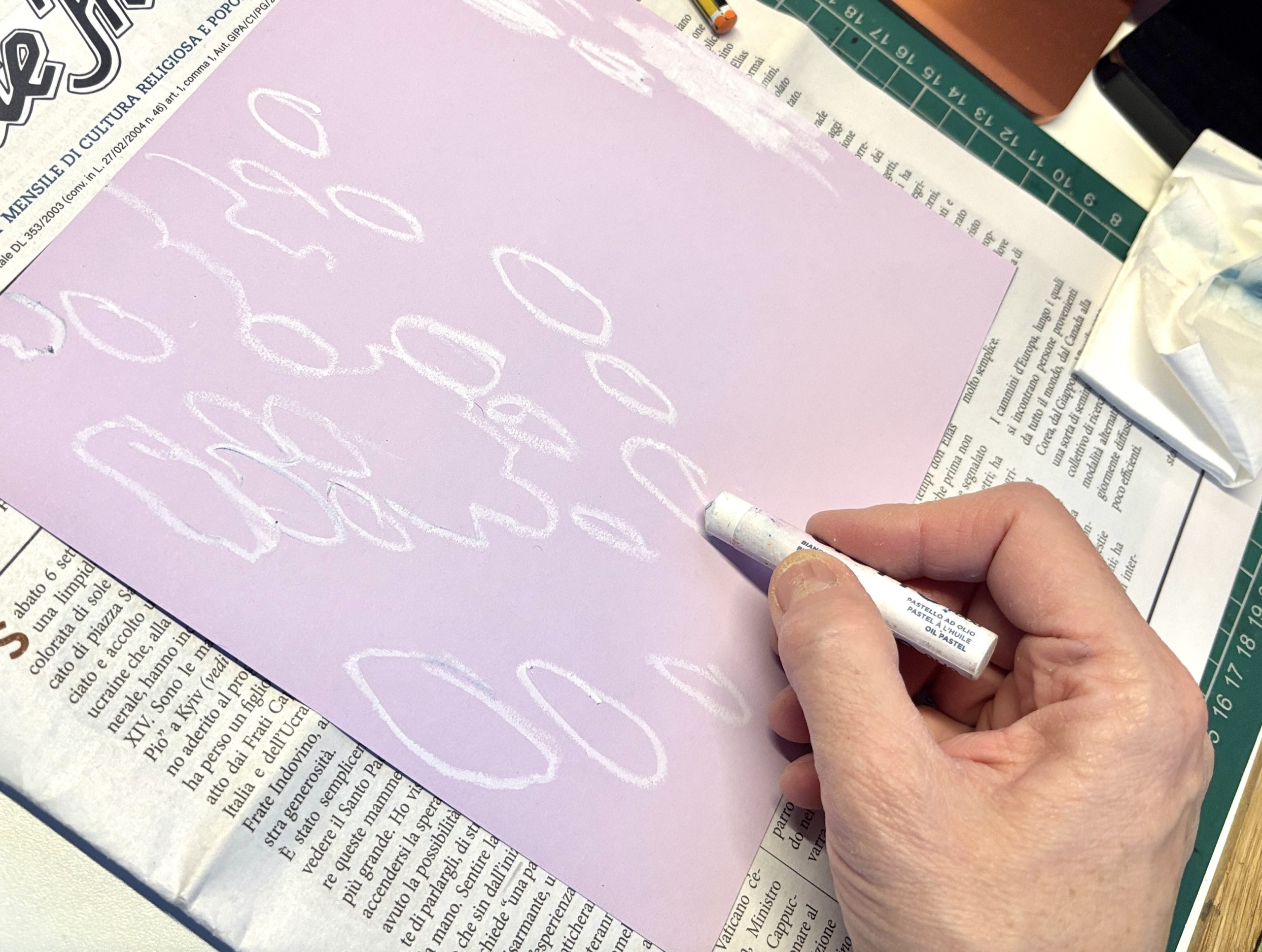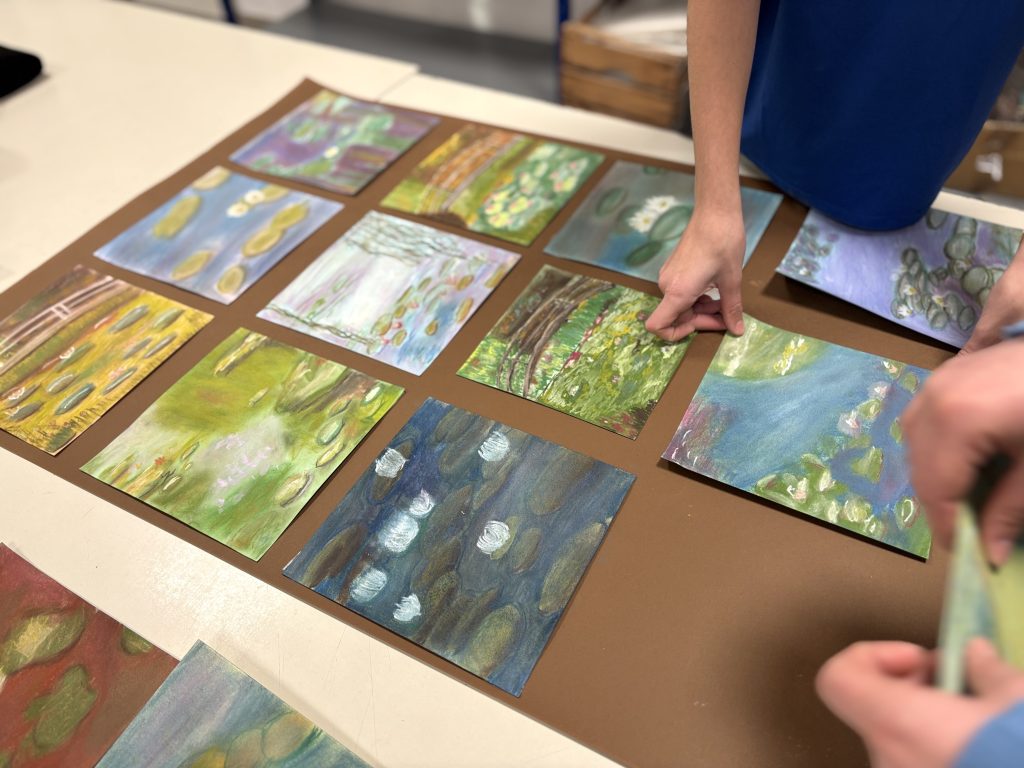 To begin, each of us chose a specific detail from Monet’s masterpieces. We sketched the main shapes of the composition onto colored cardstock in soft tones like yellow, violet, green, and light blue, which served as a chromatic base for our work.