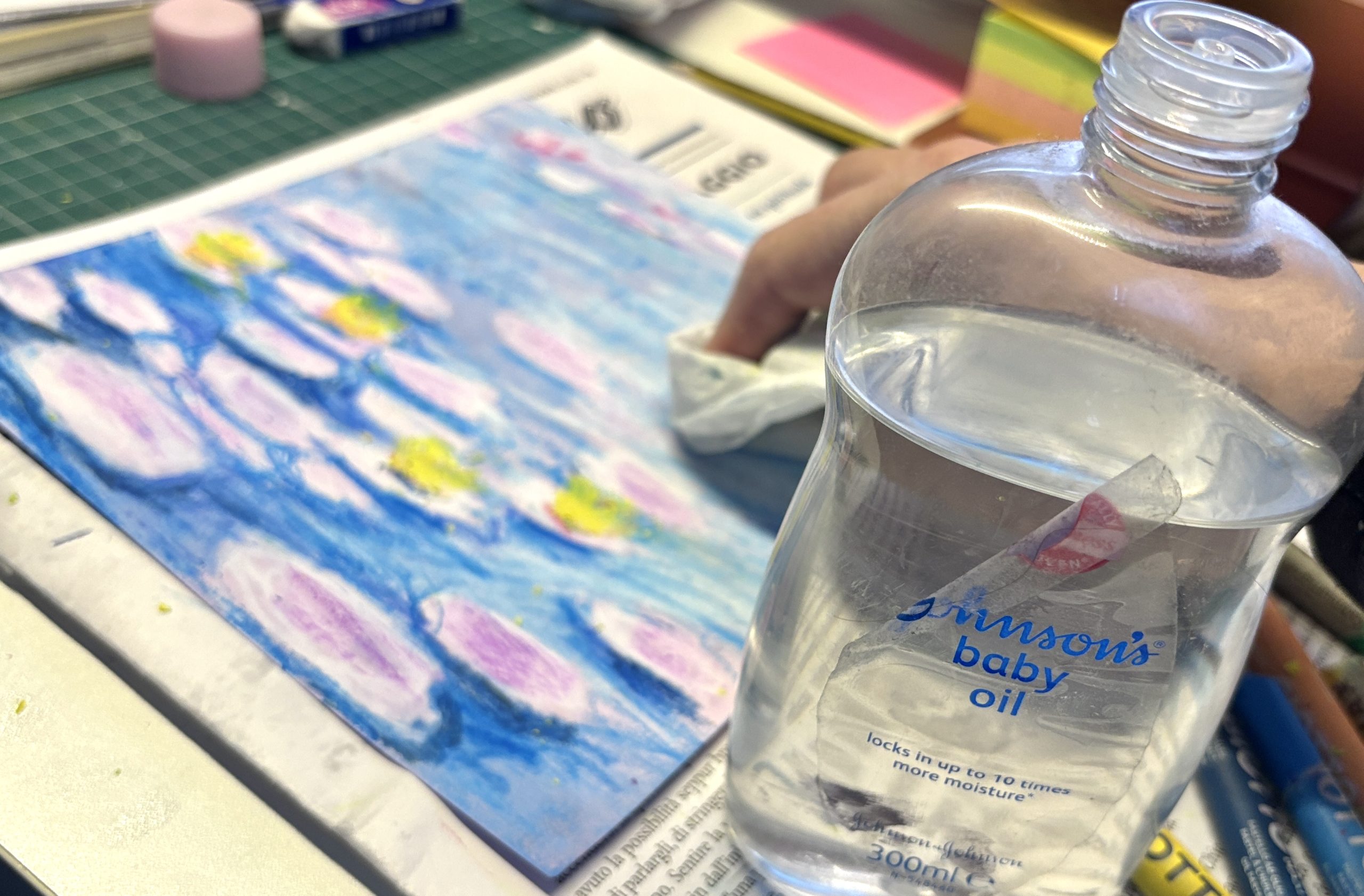 Materials: Hairspray or drawing fixative, Full-color images of Monet’s paintings (printed or digital), Colored cardstock (pastel shades), oil pastels, Baby oil, Paper tissues