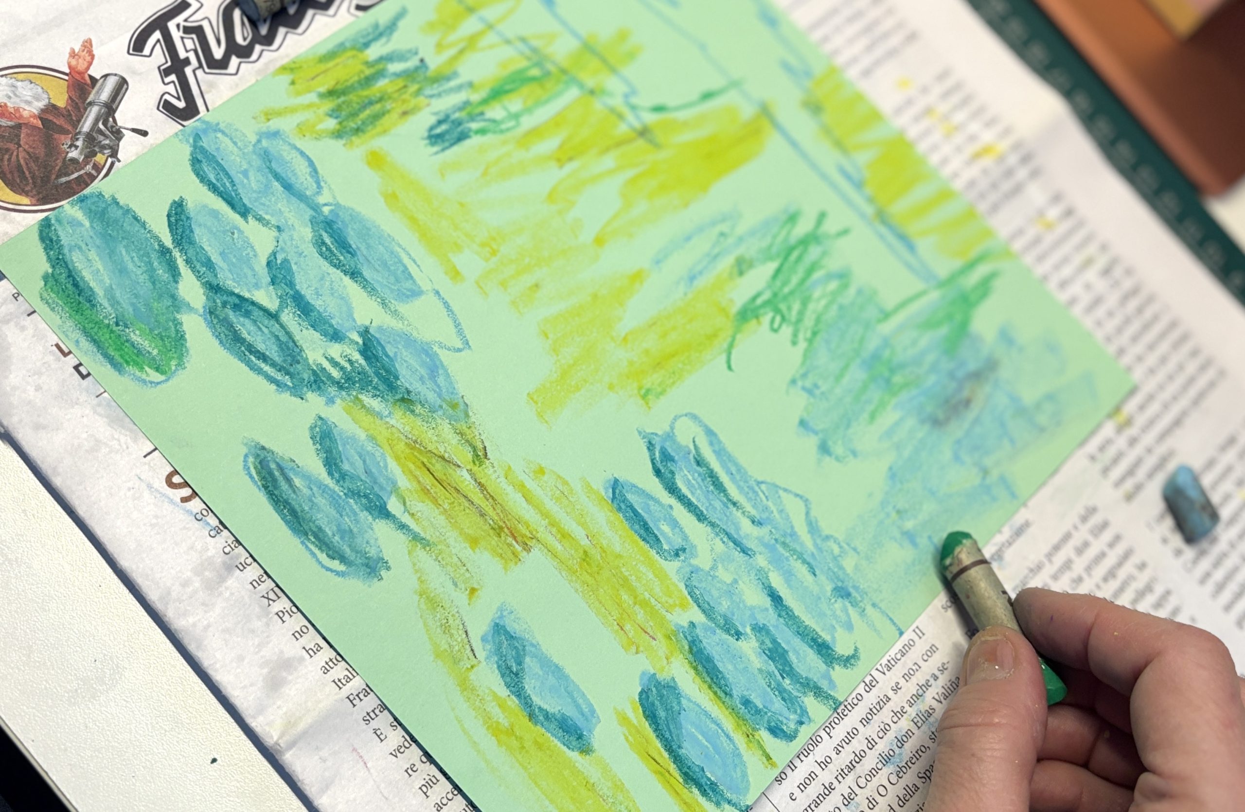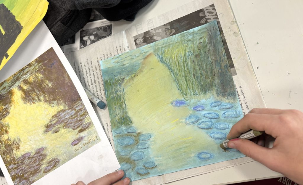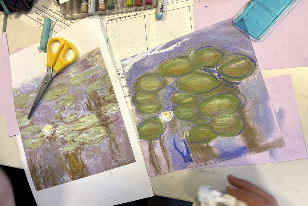 In this workshop, we explored the chromatic universe of Claude Monet, focusing on his famous Water Lilies series. This activity allowed us to develop observation skills and a sensitivity for capturing atmospheric nuances, working on competencies related to visual perception and color reproduction. By using different types of pastels, we tackled the themes of light and reflection, gaining a practical understanding of Impressionist painting and texture management.