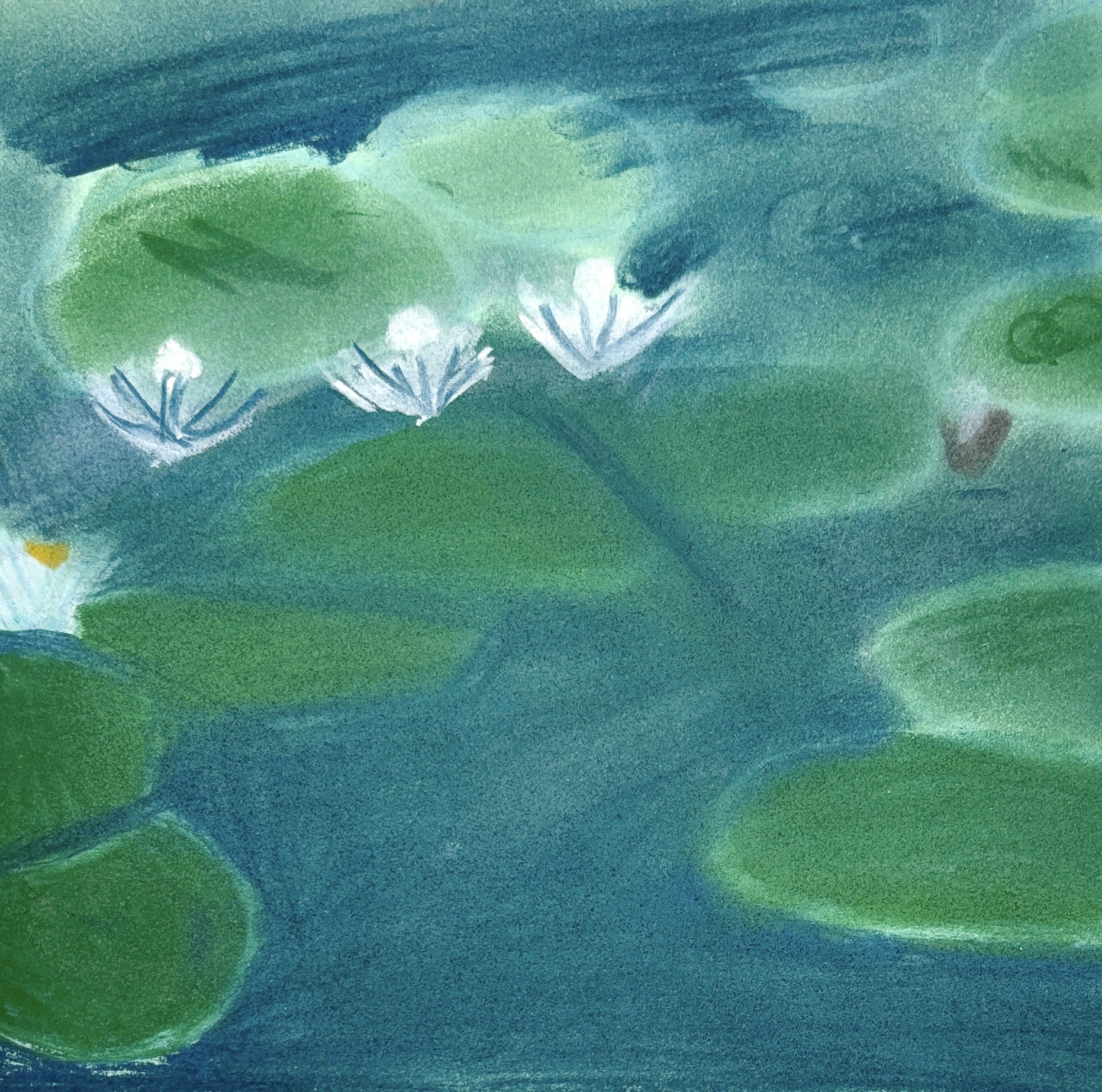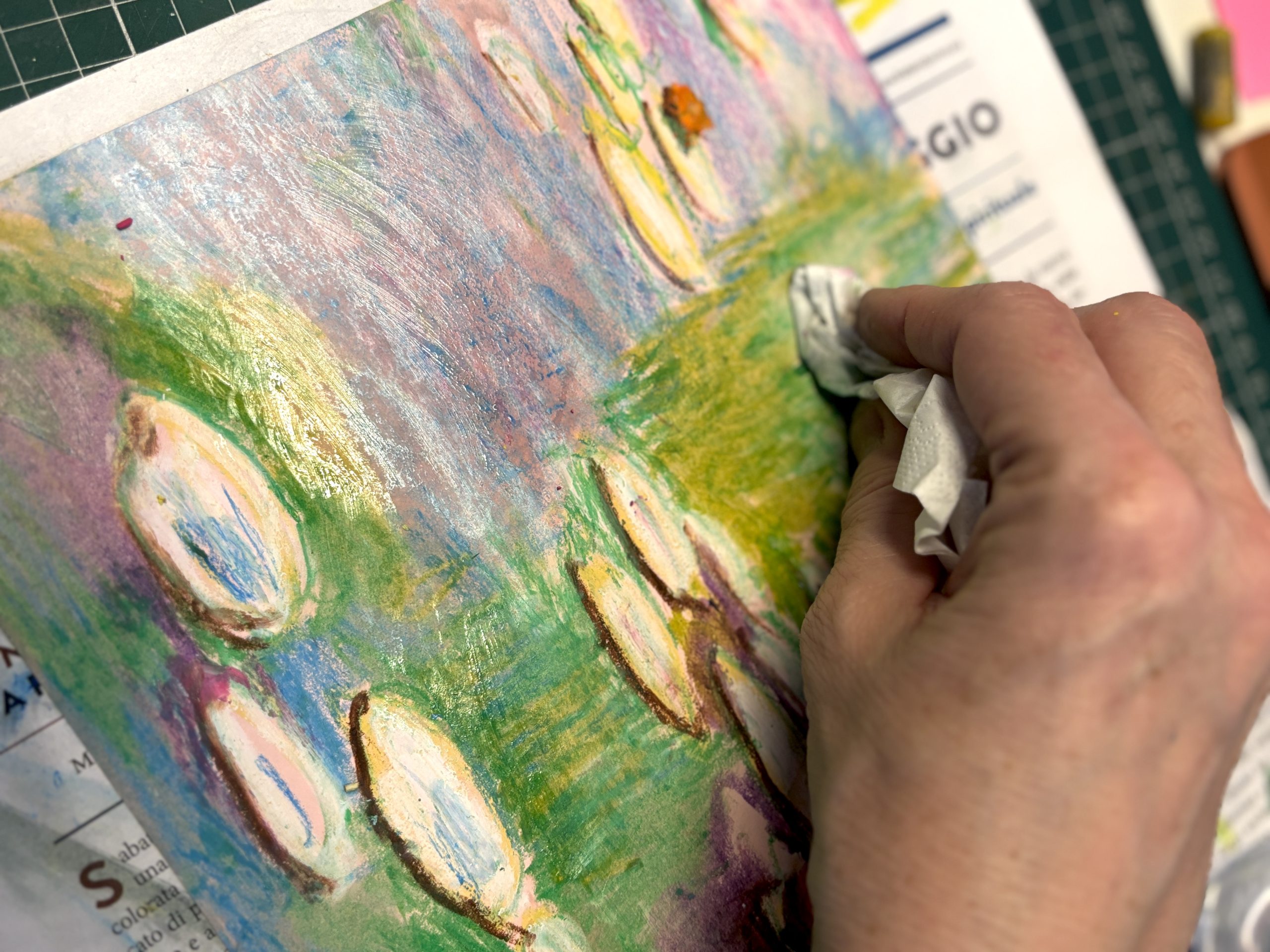 To make the colors even more fluid, we used baby oil. By spreading the oil onto the paper with a tissue, we dissolved and merged the colors together, achieving incredible effects of transparency and softness. Here are our finished Water Lilies, full of light and color.