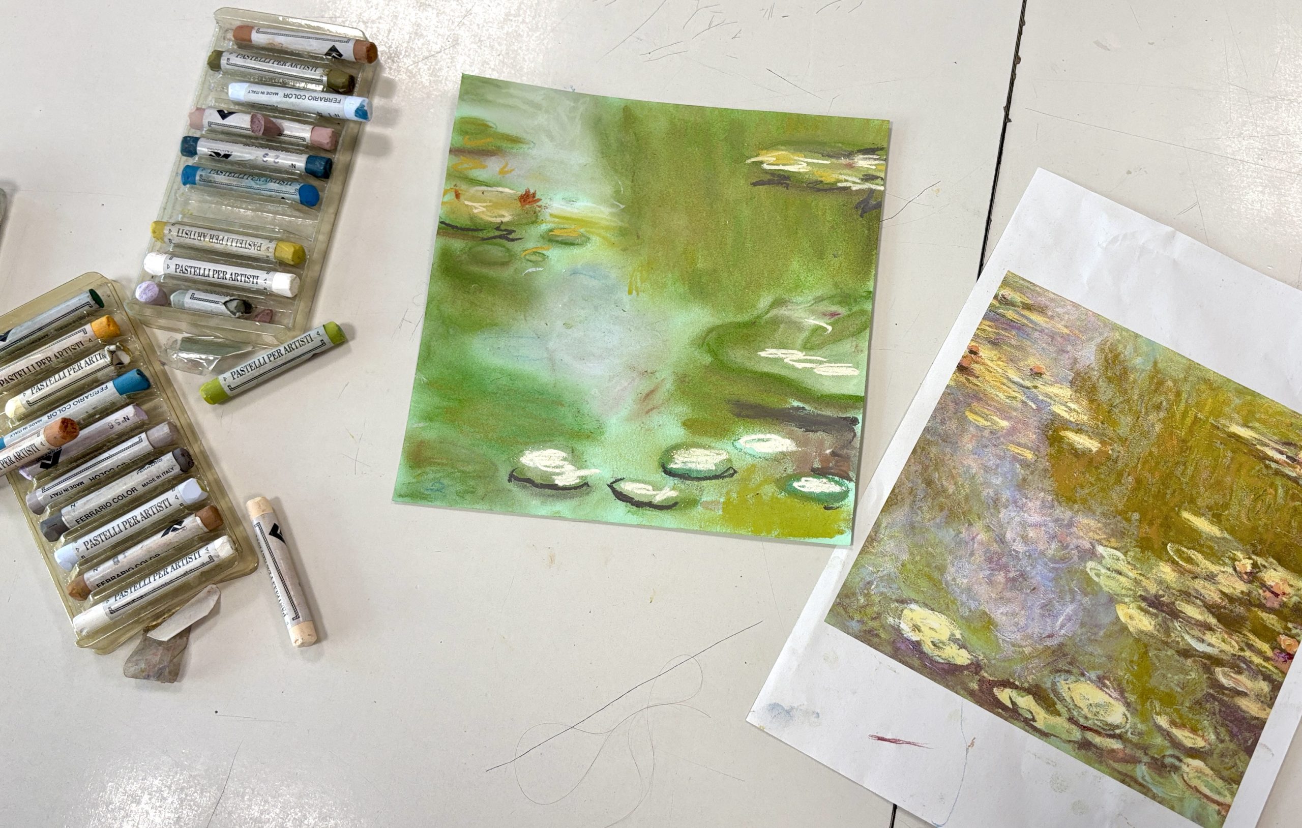 And here are our works created with soft pastels: a magical play of transparencies inspired by Monet.