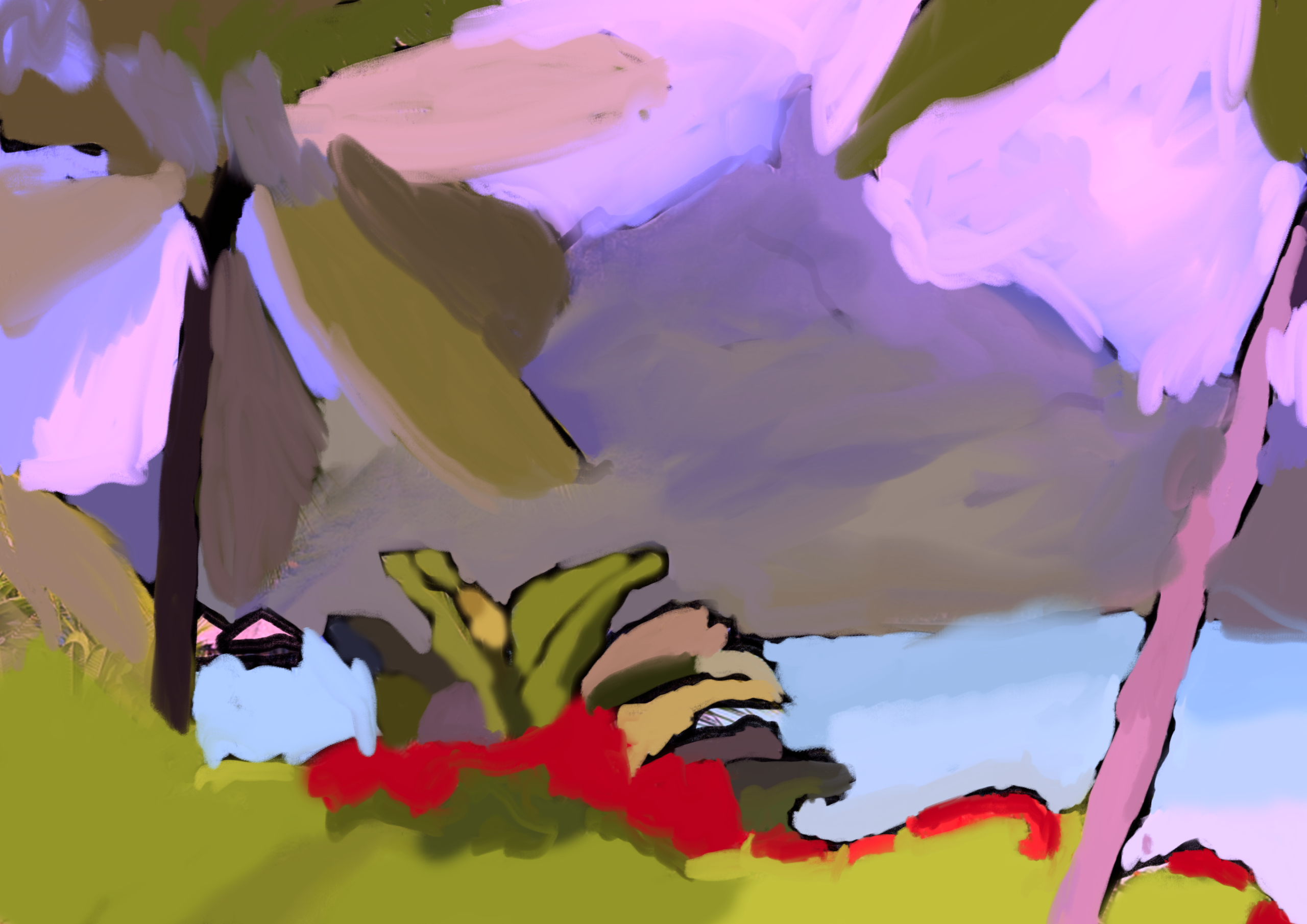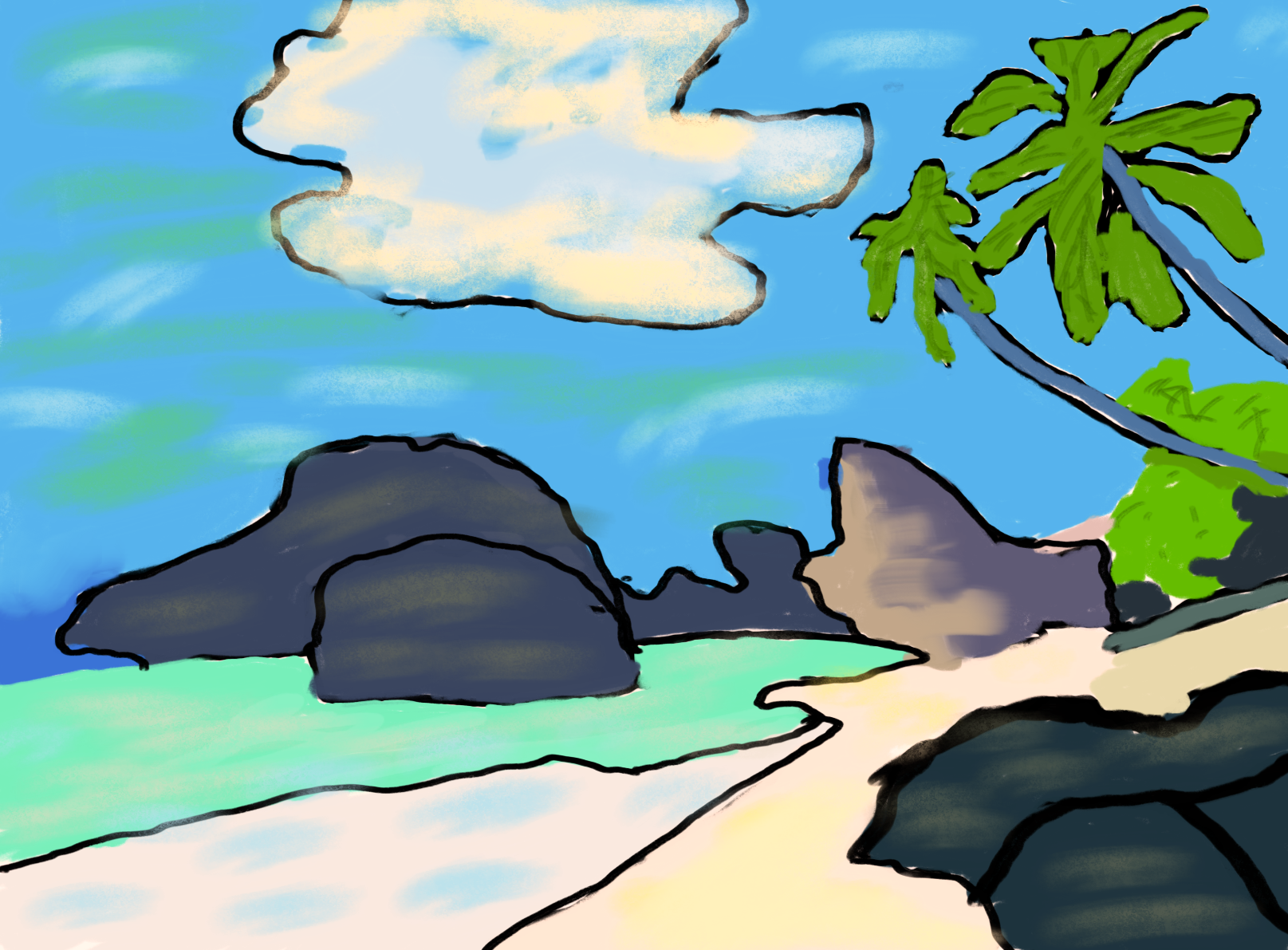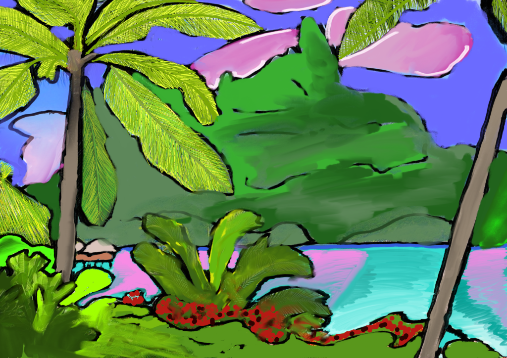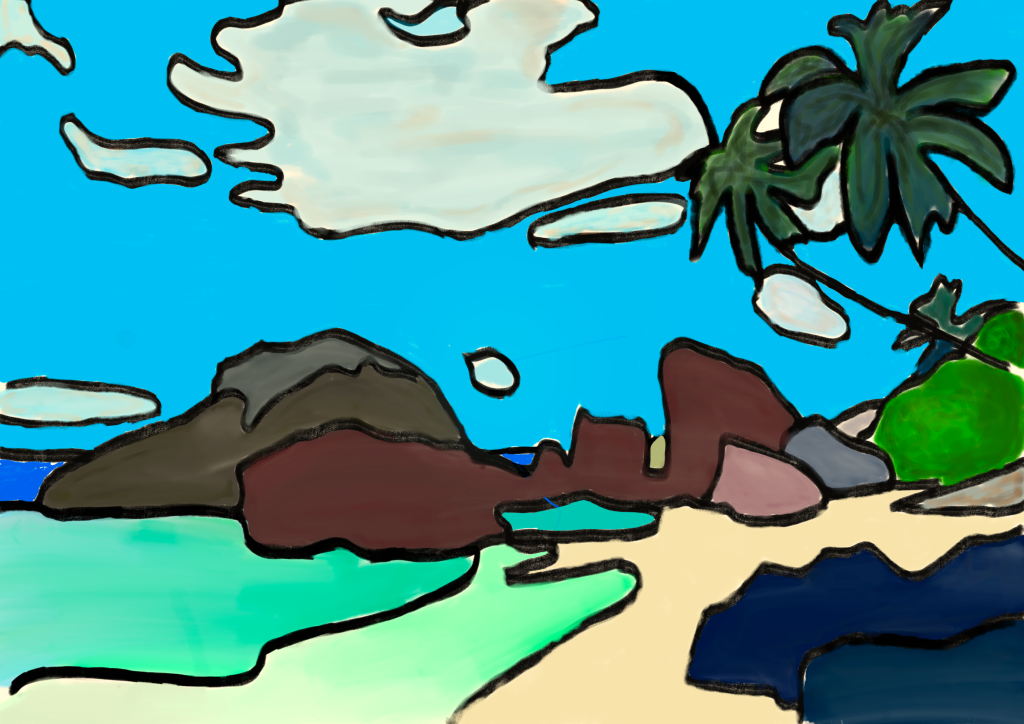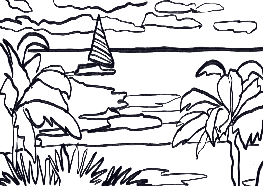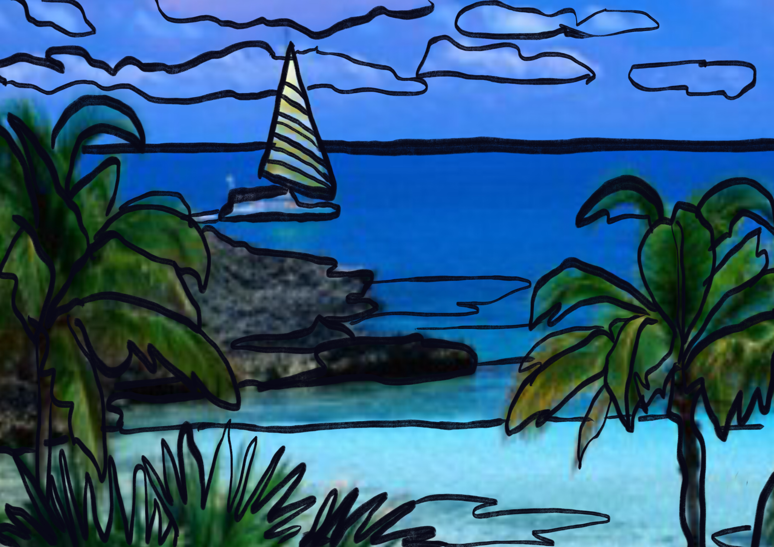 We started by choosing a photograph of a tropical landscape with a striking composition. After importing it into Sketchbook, we created a new layer above the image. Using a sharp, precise black line, we began to simplify the shapes. We removed unnecessary details to focus only on the main outlines, just as Gauguin did with his synthetic style.