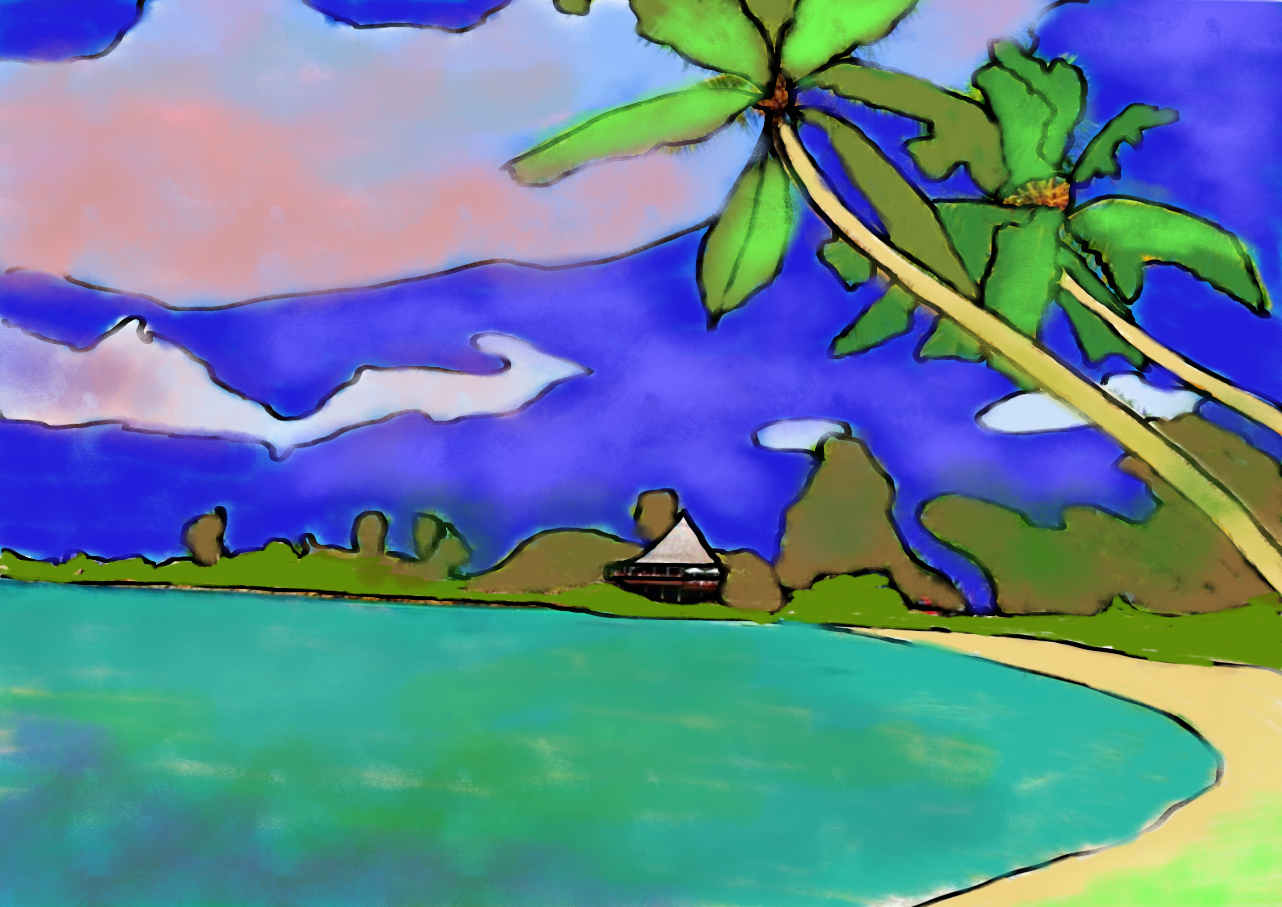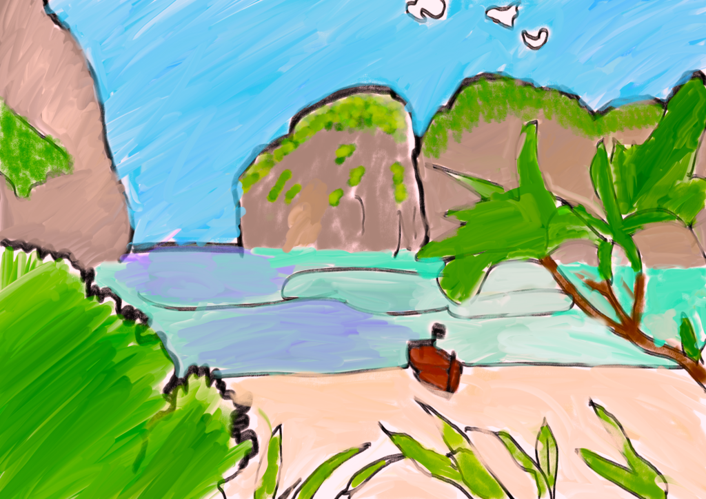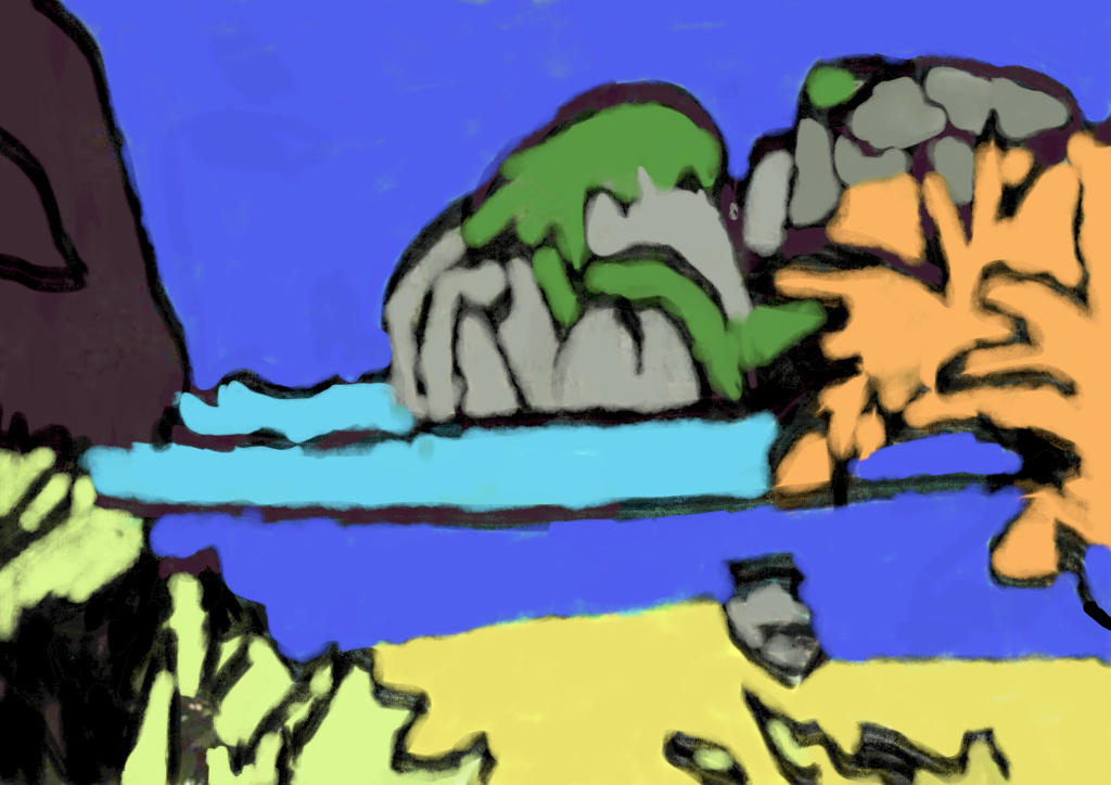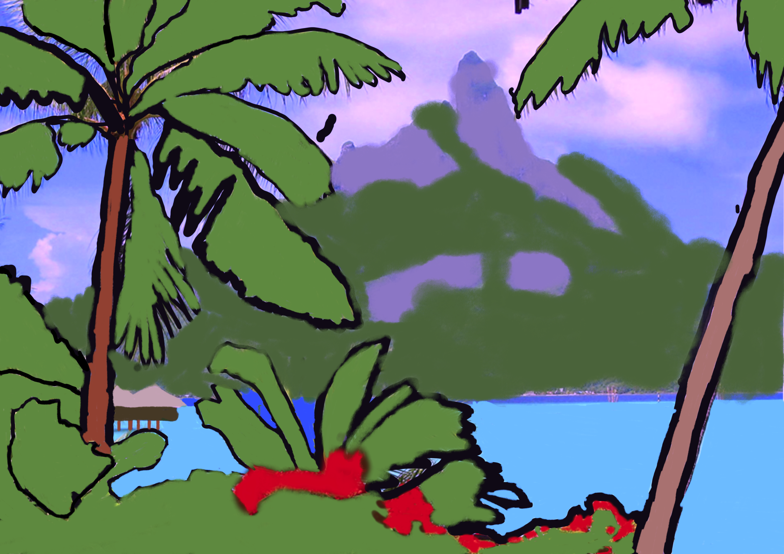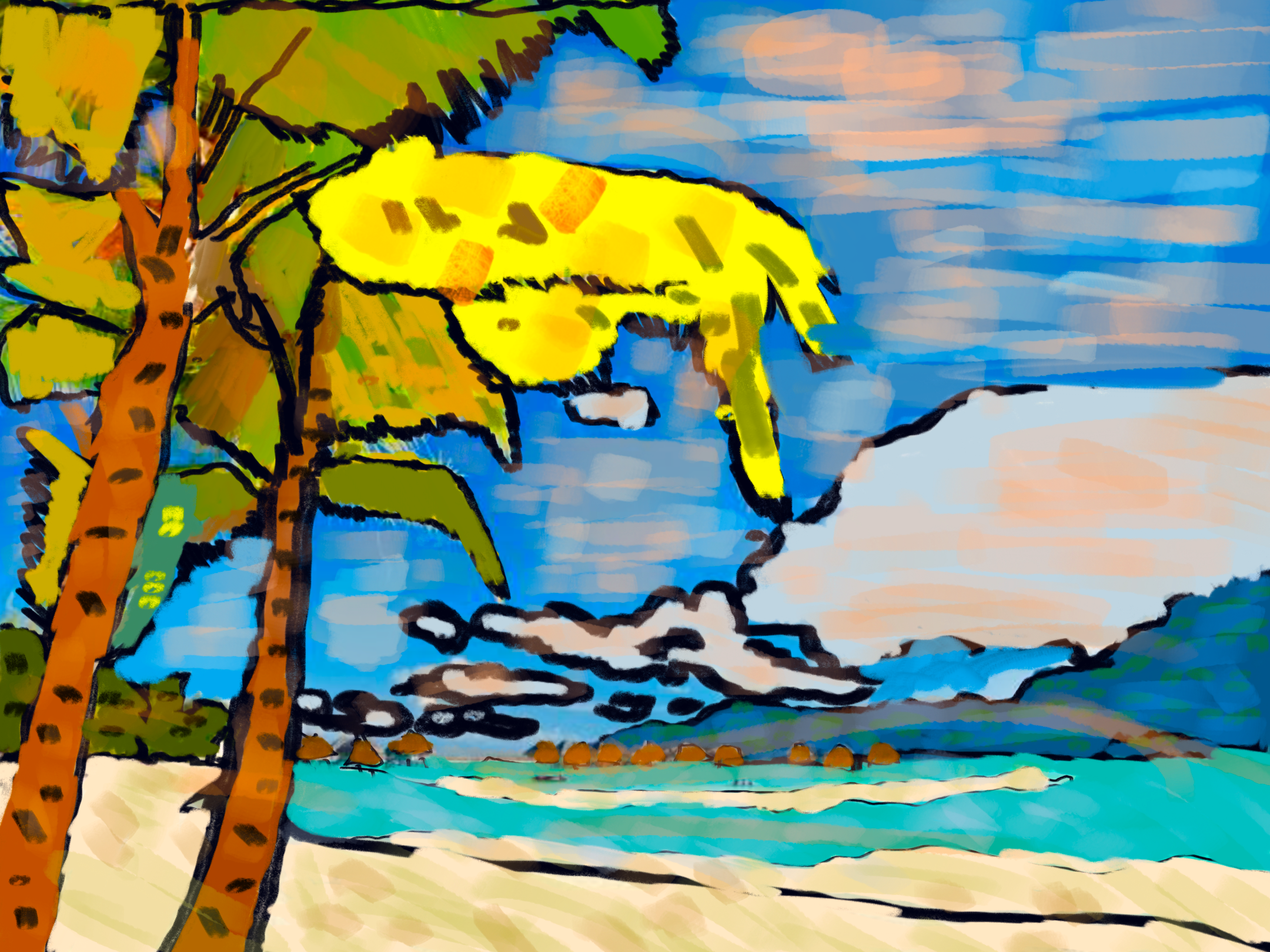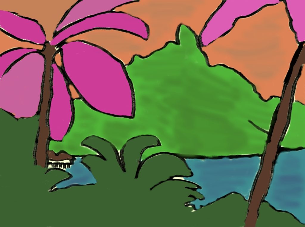 We started by choosing a photograph of a tropical landscape with a striking composition. After importing it into Sketchbook, we created a new layer above the image. Using a sharp, precise black line, we began to simplify the shapes. We removed unnecessary details to focus only on the main outlines, just as Gauguin did with his synthetic style.