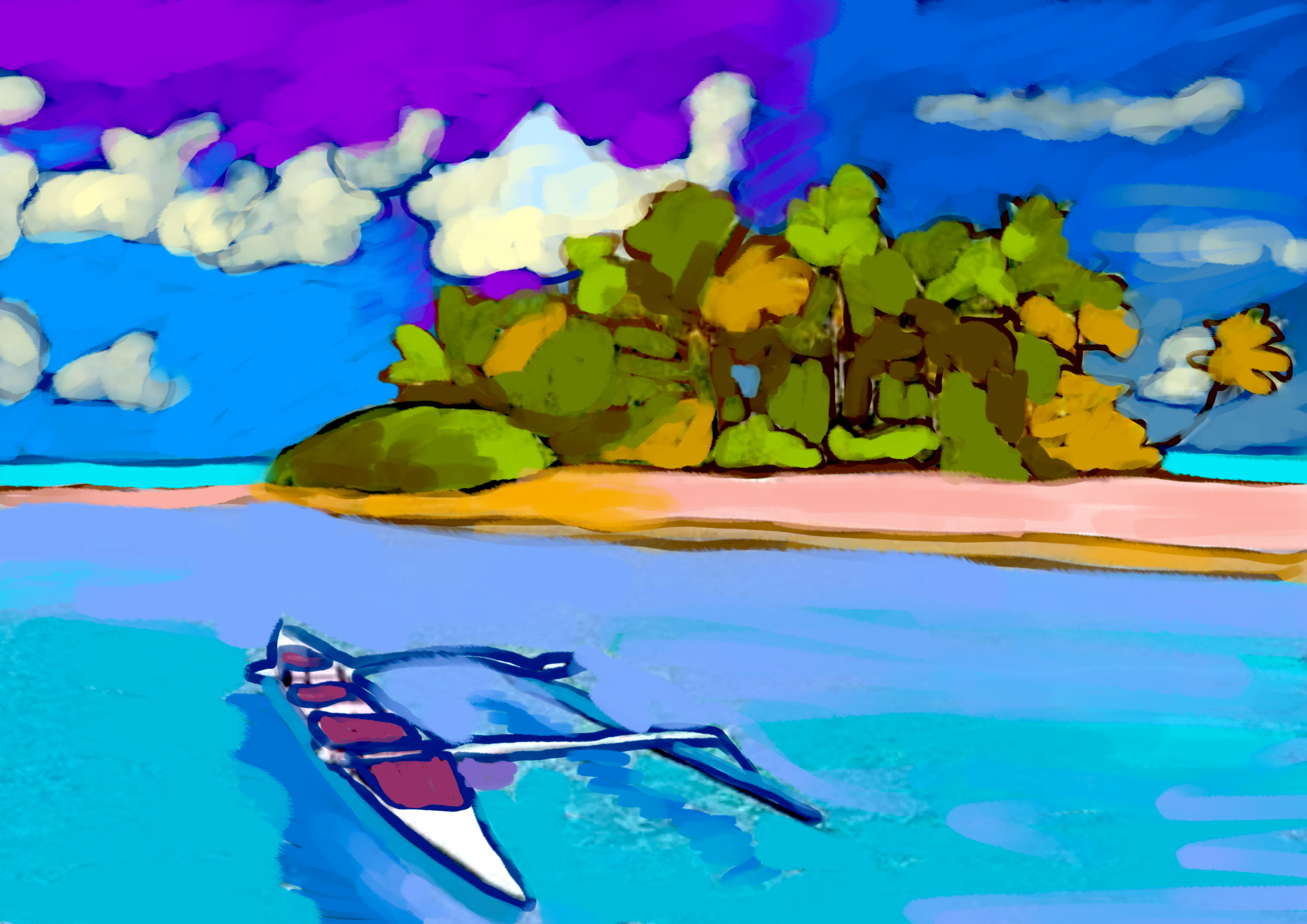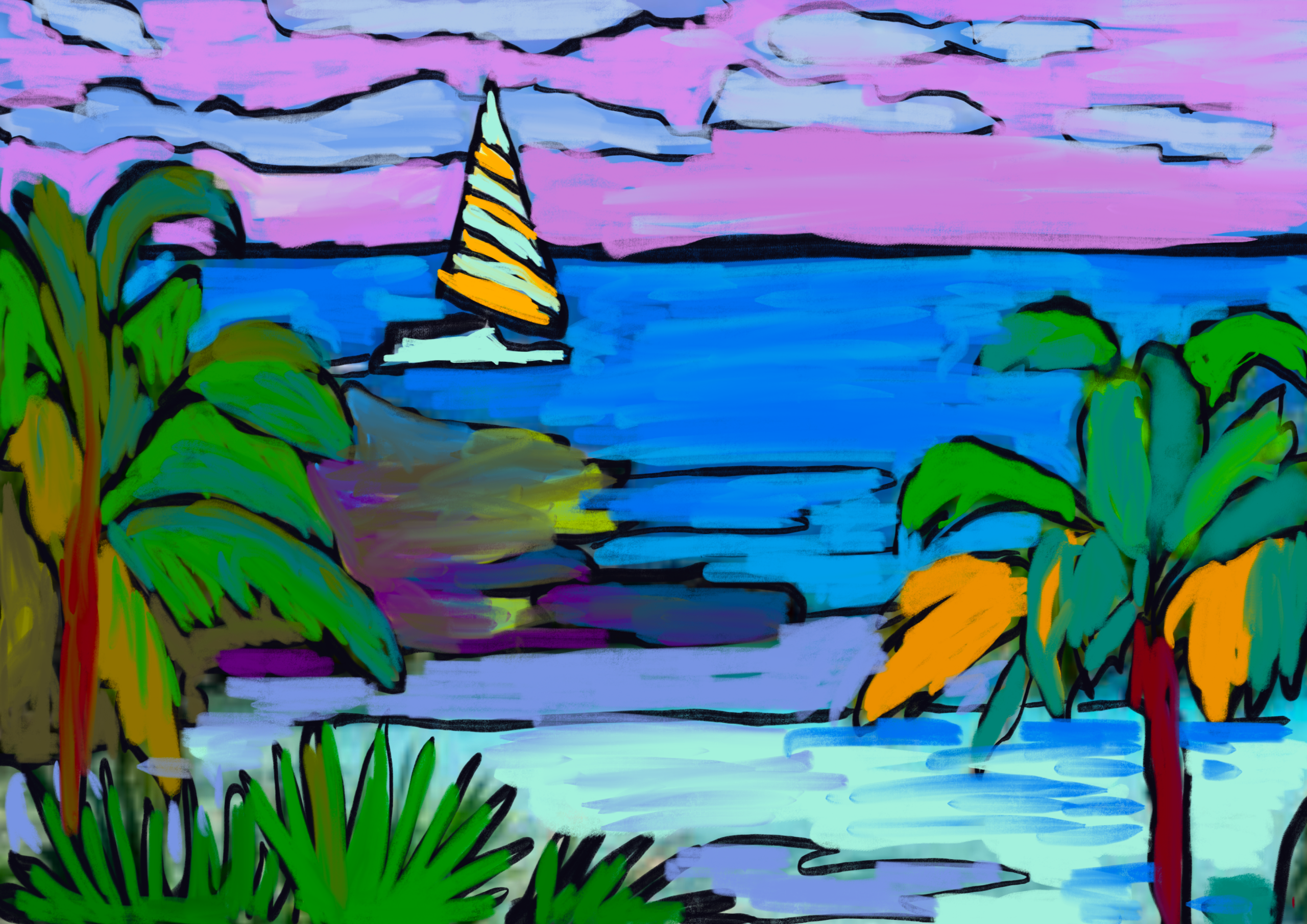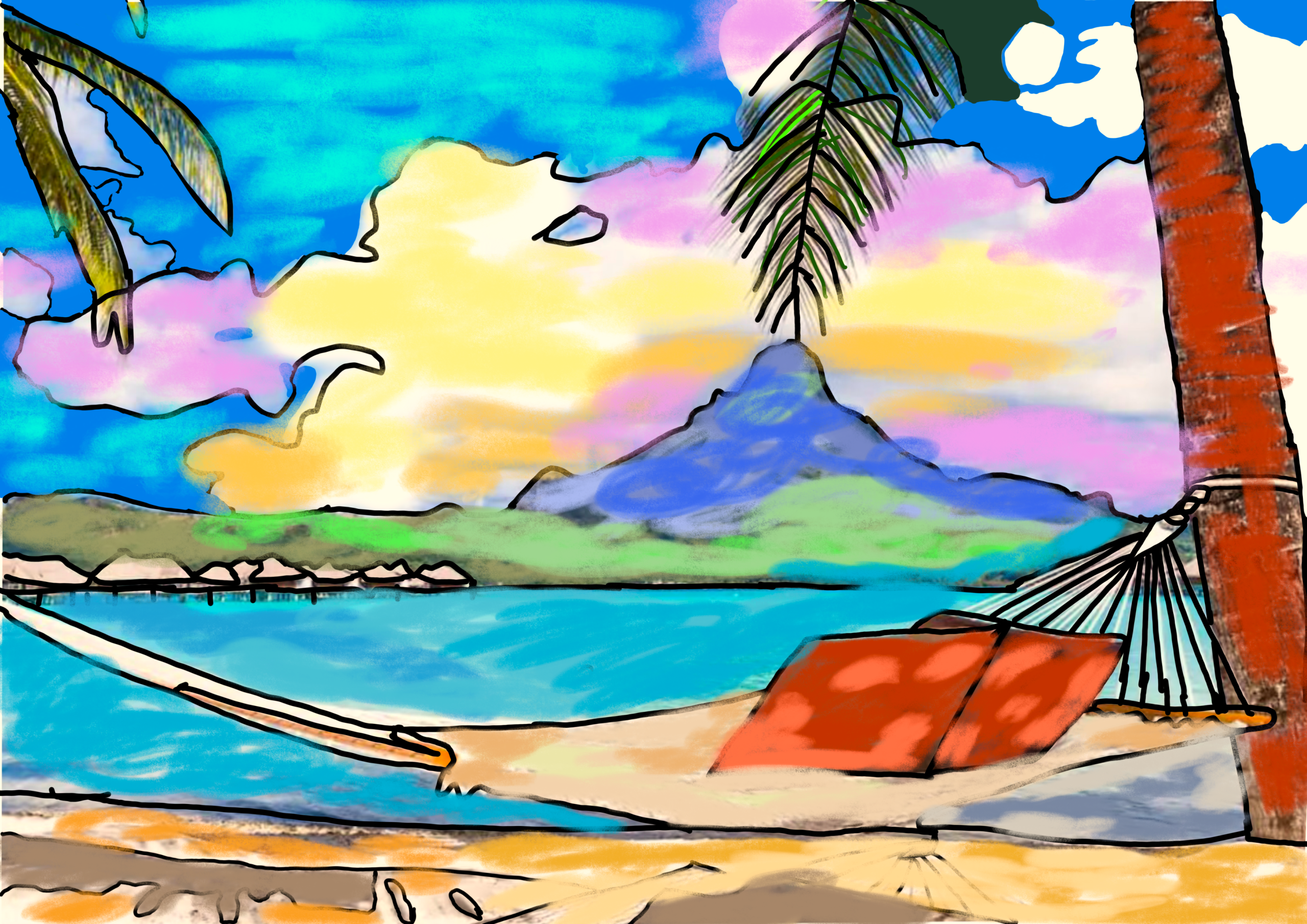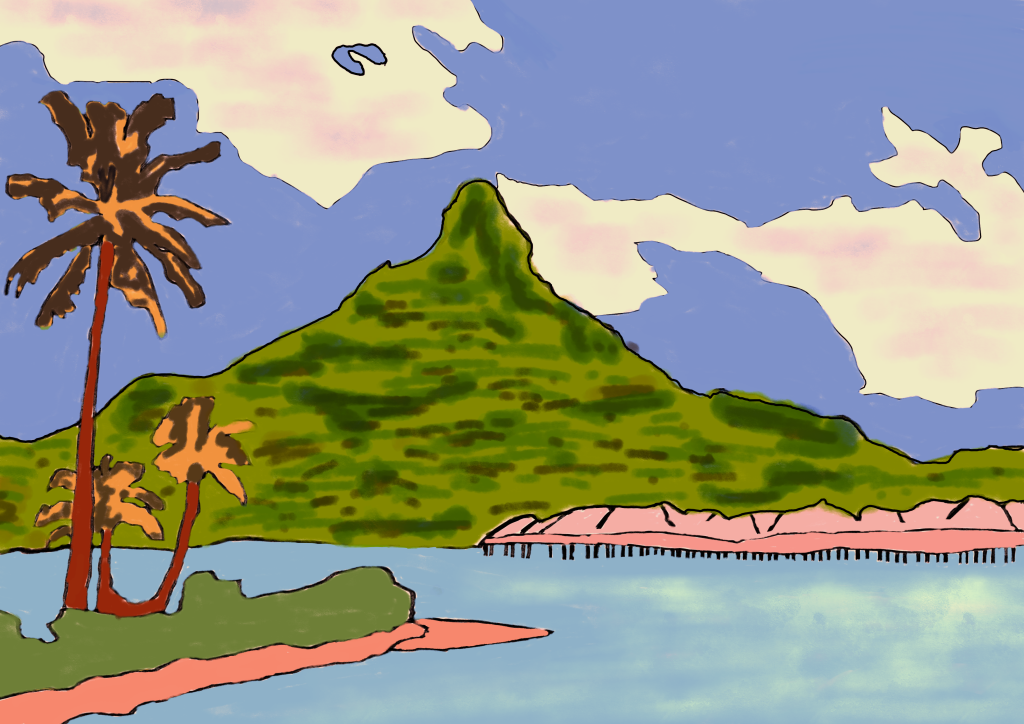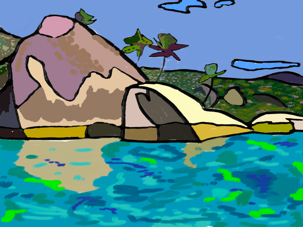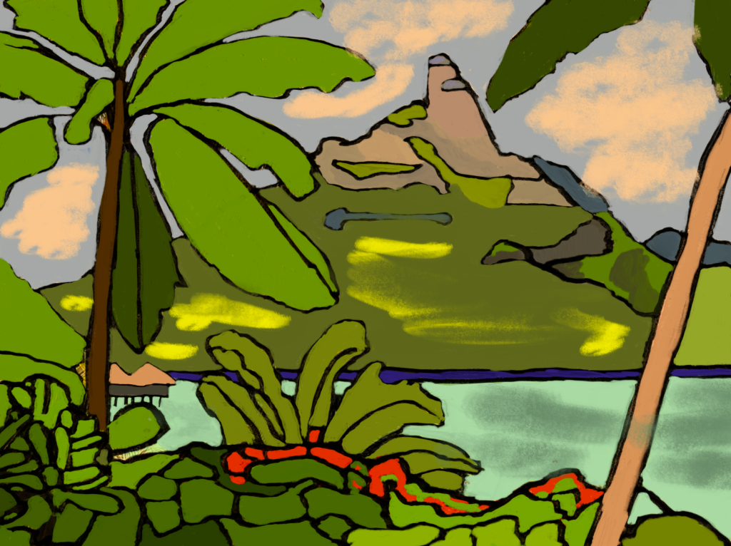 We started by choosing a photograph of a tropical landscape with a striking composition. After importing it into Sketchbook, we created a new layer above the image. Using a sharp, precise black line, we began to simplify the shapes. We removed unnecessary details to focus only on the main outlines, just as Gauguin did with his synthetic style.