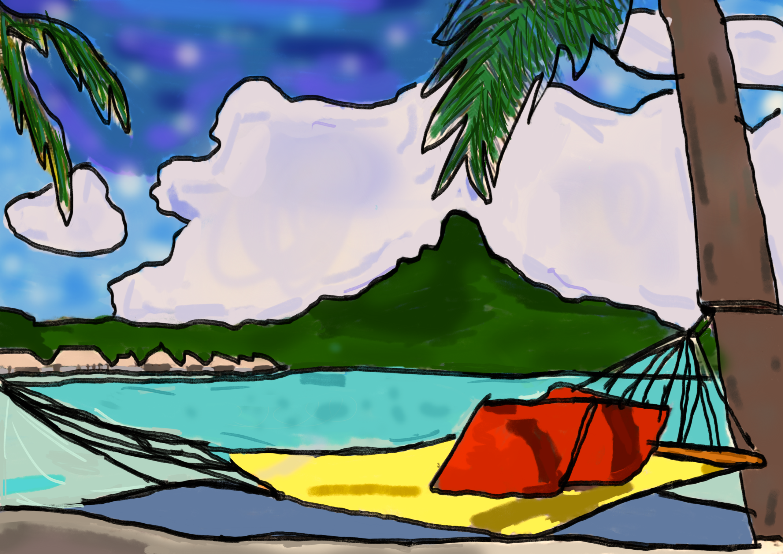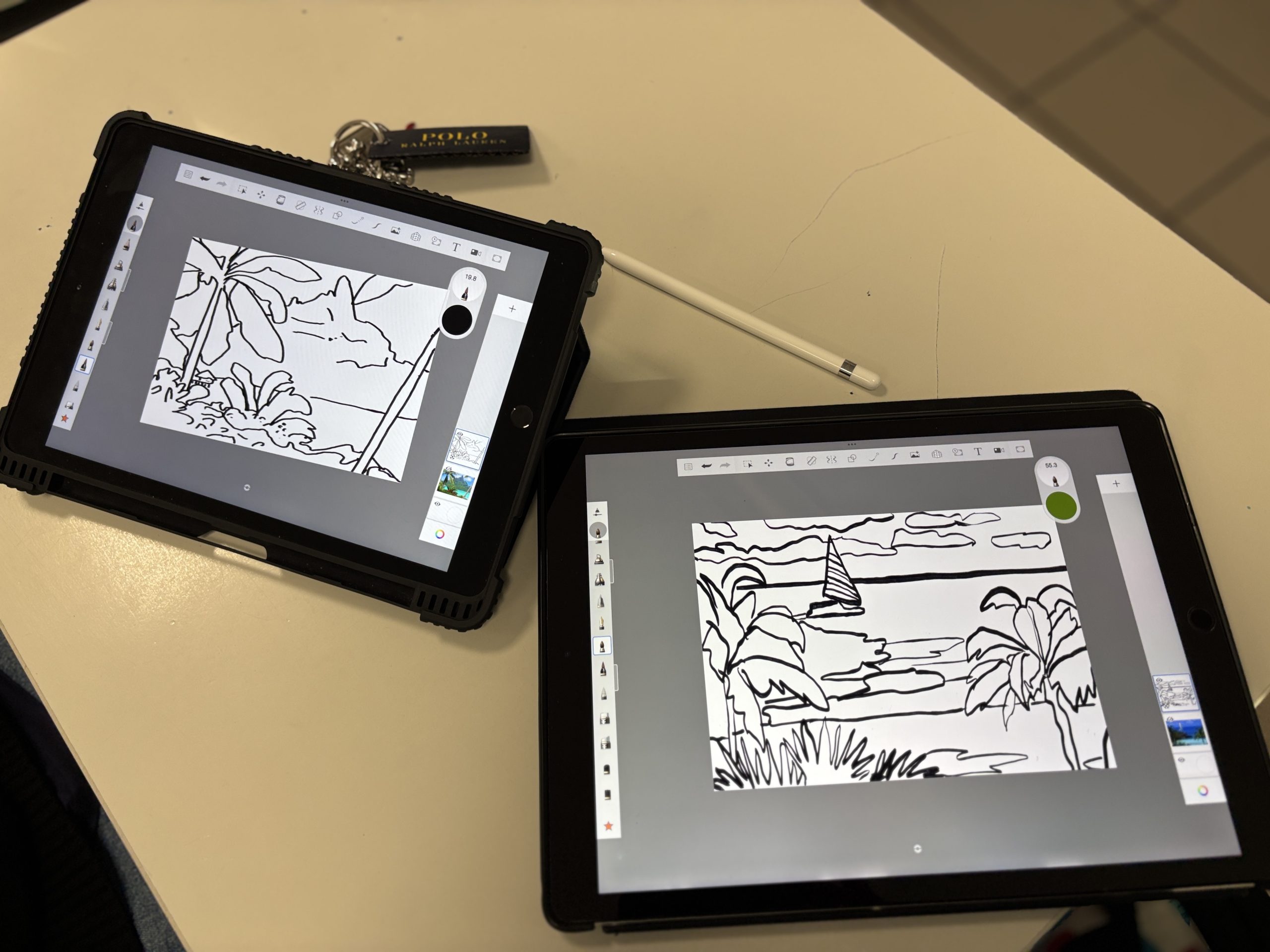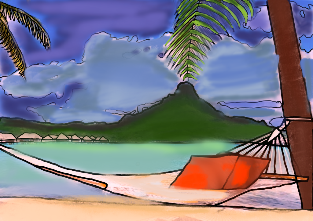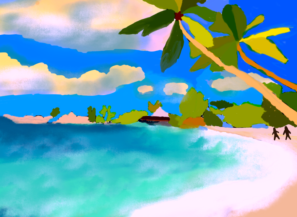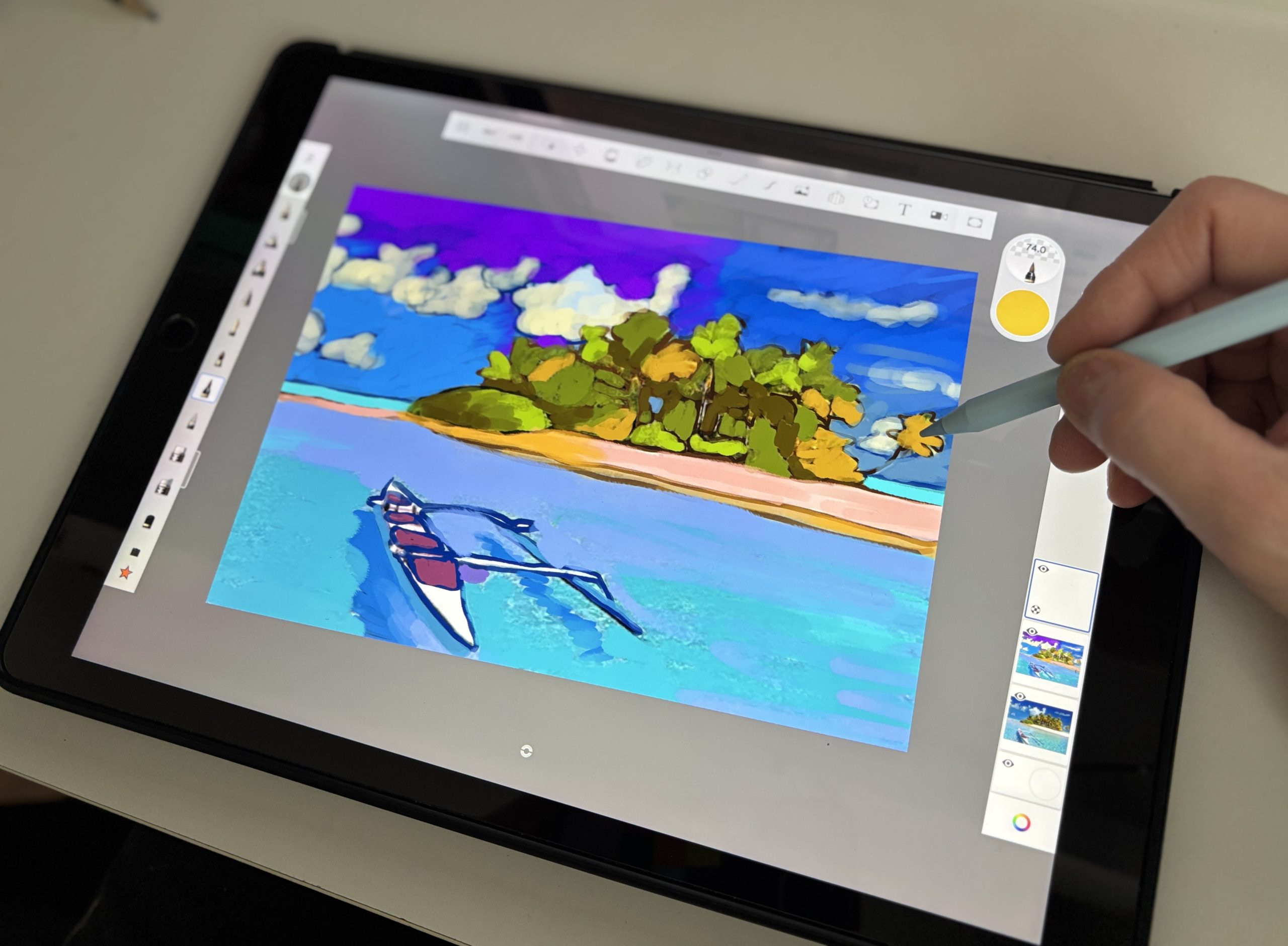 We started by choosing a photograph of a tropical landscape with a striking composition. After importing it into Sketchbook, we created a new layer above the image. Using a sharp, precise black line, we began to simplify the shapes. We removed unnecessary details to focus only on the main outlines, just as Gauguin did with his synthetic style.