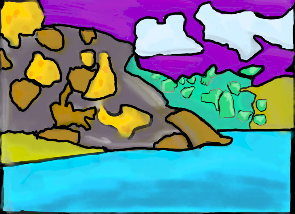 Experimenting with different digital brushes, we applied the color evenly, aiming to create vivid contrasts between different areas of the picture. We discovered that by changing saturation and brightness, we could completely transform the atmosphere of the original landscape, turning it into a magical and personal place.