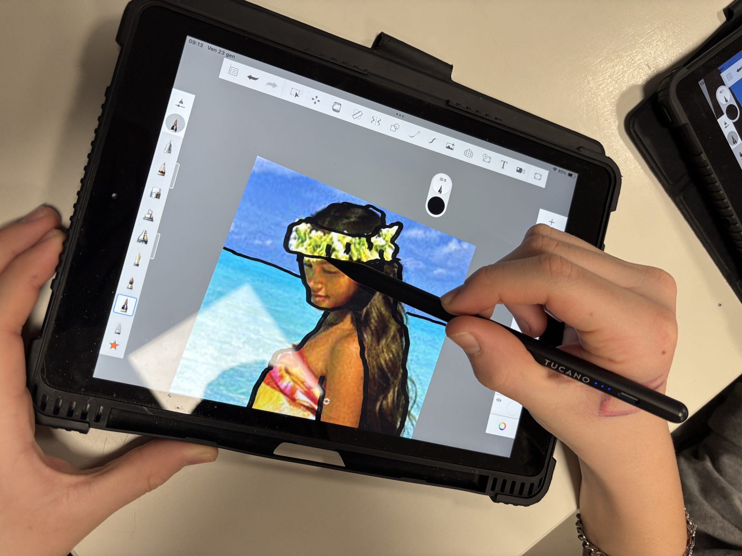 In this workshop, we let ourselves be inspired by the rebellious and visionary figure of Paul Gauguin. We explored how the artist spent his life searching for an untainted purity in the South Seas, translating his emotions into non-naturalistic colors and synthetic forms. Through this activity, we developed digital skills applied to art, learning to observe reality and then reinterpret it subjectively. Our goal was not to copy the real world, but to express what we feel, focusing on visual simplification and the expressive use of technology.