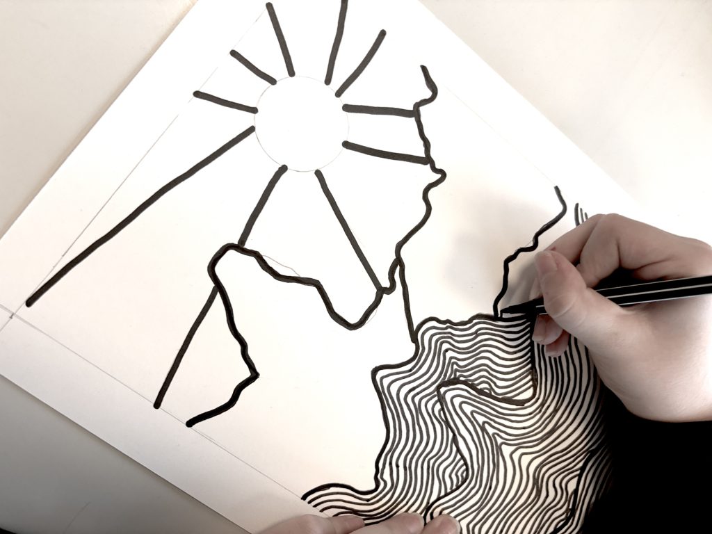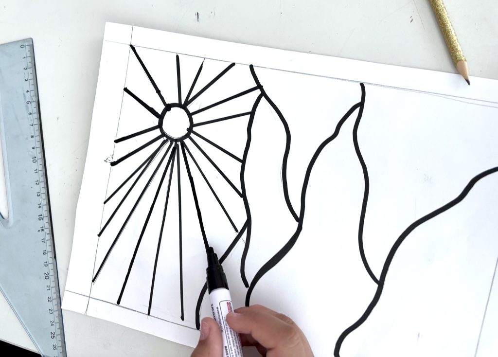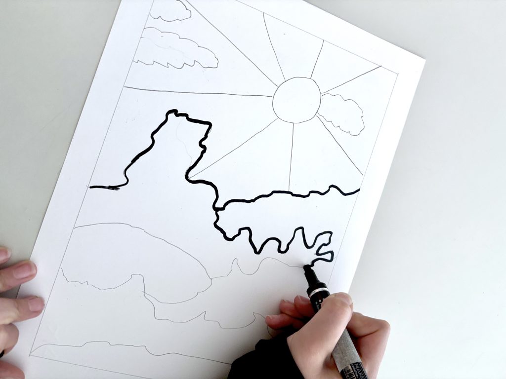 Una volta soddisfatti della composizione, noi abbiamo utilizzato il pennarello nero a punta grossa per delineare i contorni di tutti i livelli del paesaggio, rendendoli netti e visibili. Questo strato spesso serve a separare chiaramente le zone che andremo a riempire.