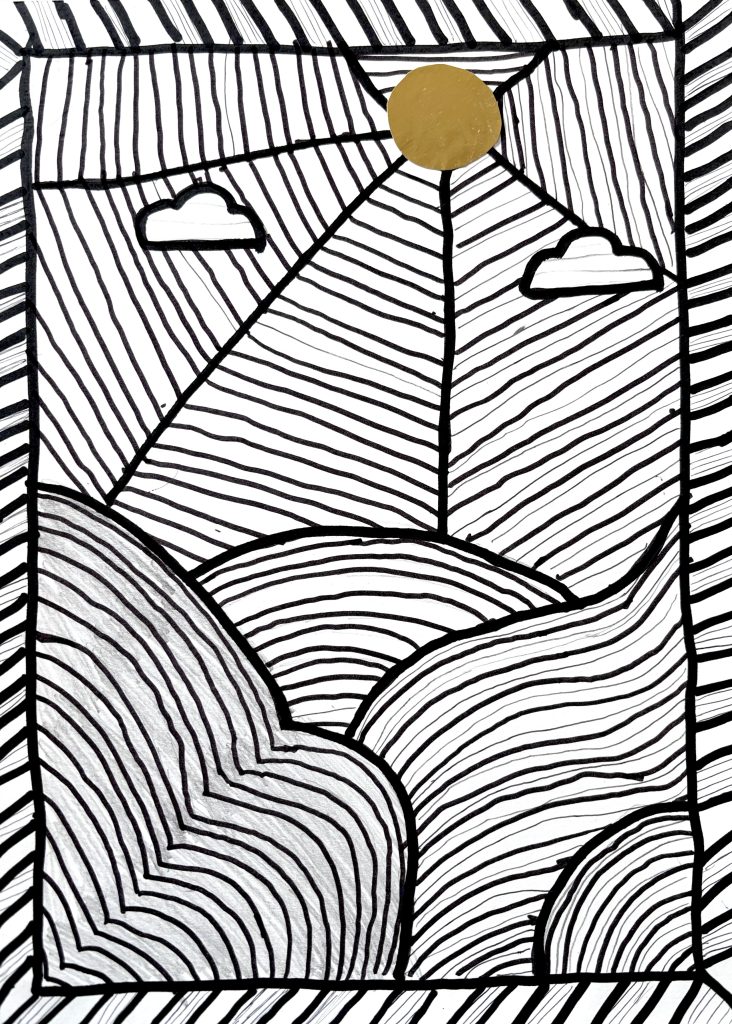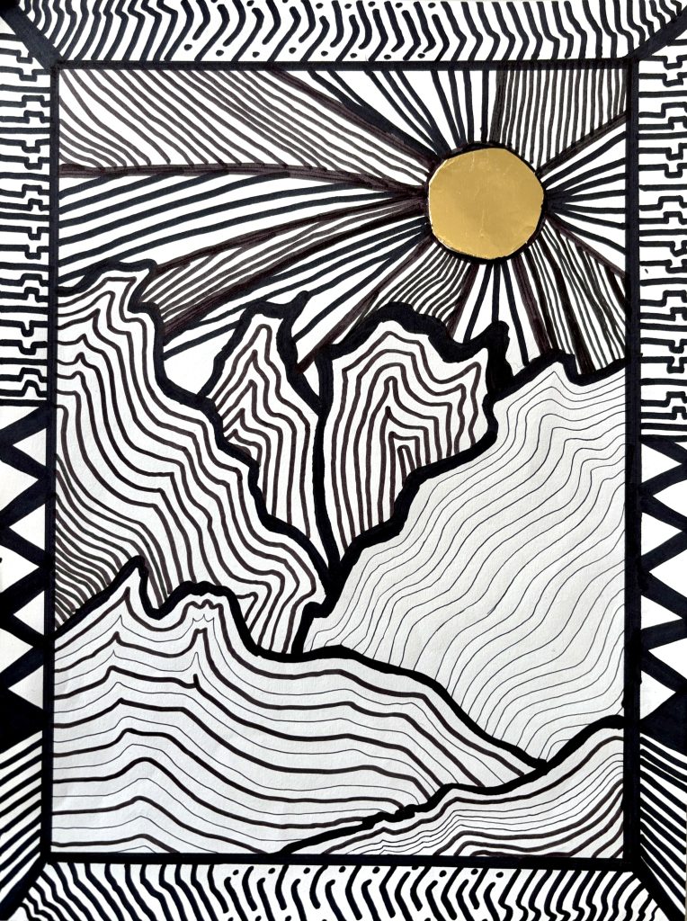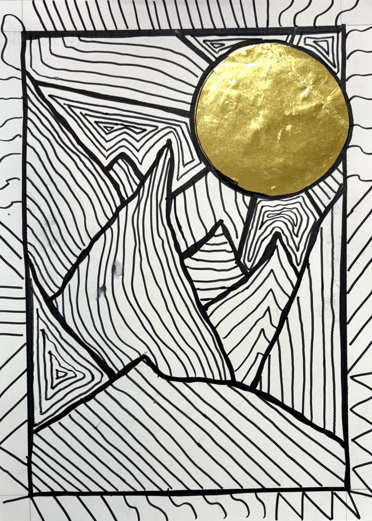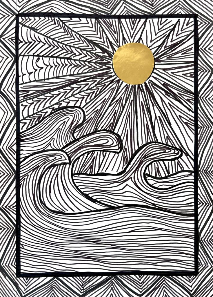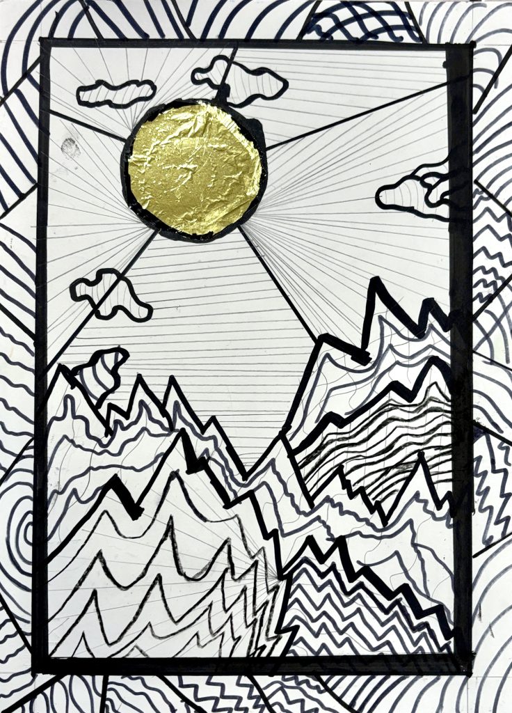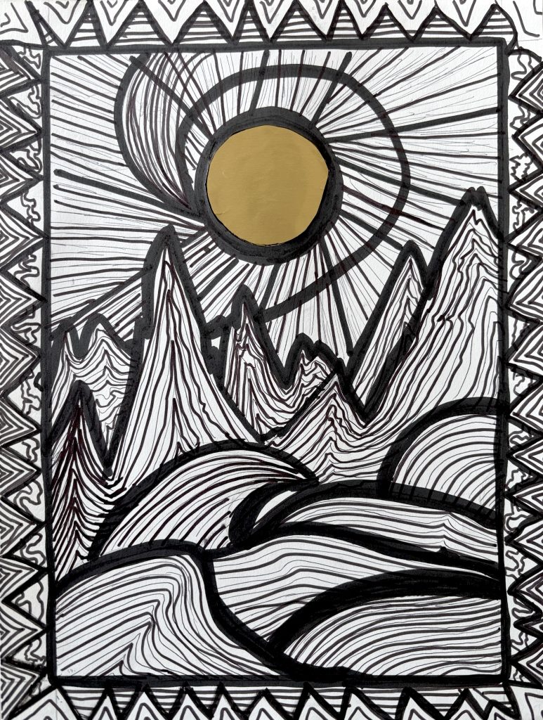 Per concludere, noi abbiamo decorato anche la cornice esterna, riempiendola con motivi semplici fatti sempre di linee parallele nere. Infine, abbiamo aggiunto un punto focale: abbiamo disegnato un Sole o una Luna e lo abbiamo rivestito con la carta stagnola dorata, incollandola con cura. Questo tocco di luce dorata è il contrasto perfetto per l’intensità delle linee nere.
