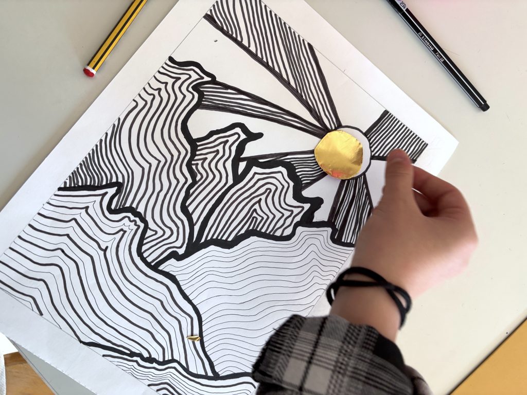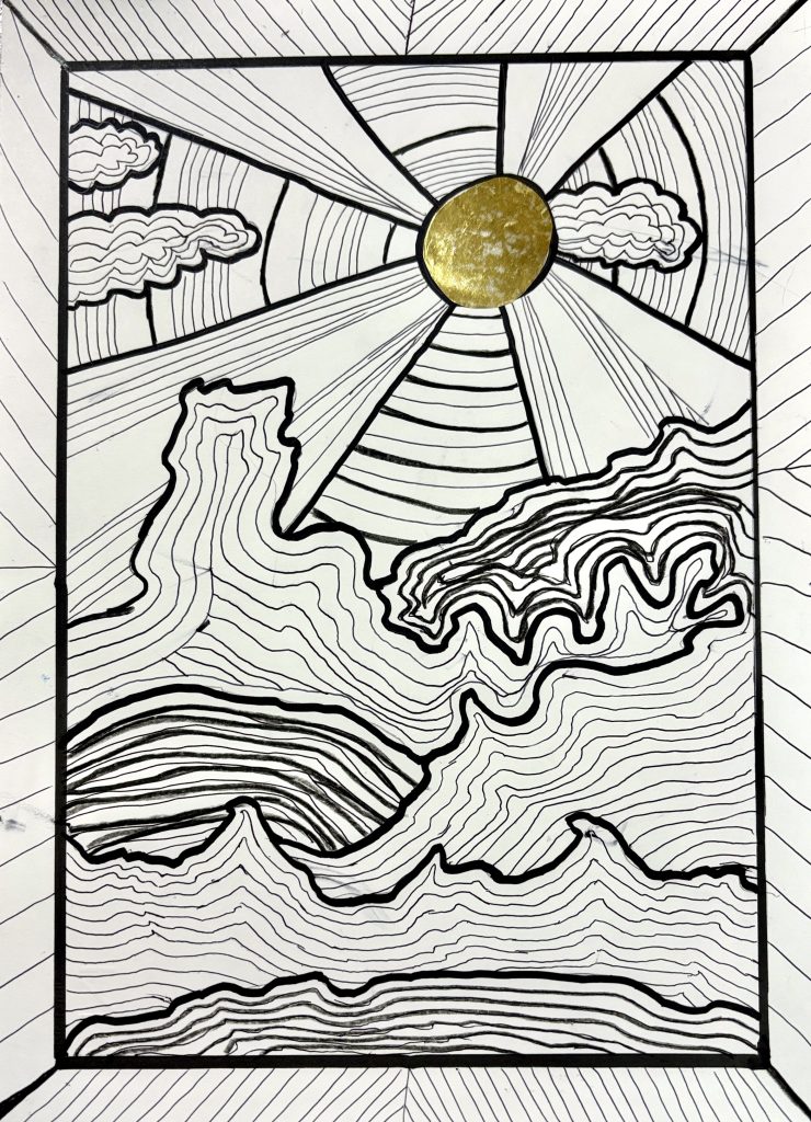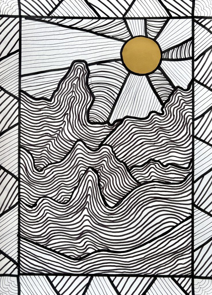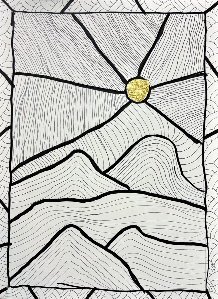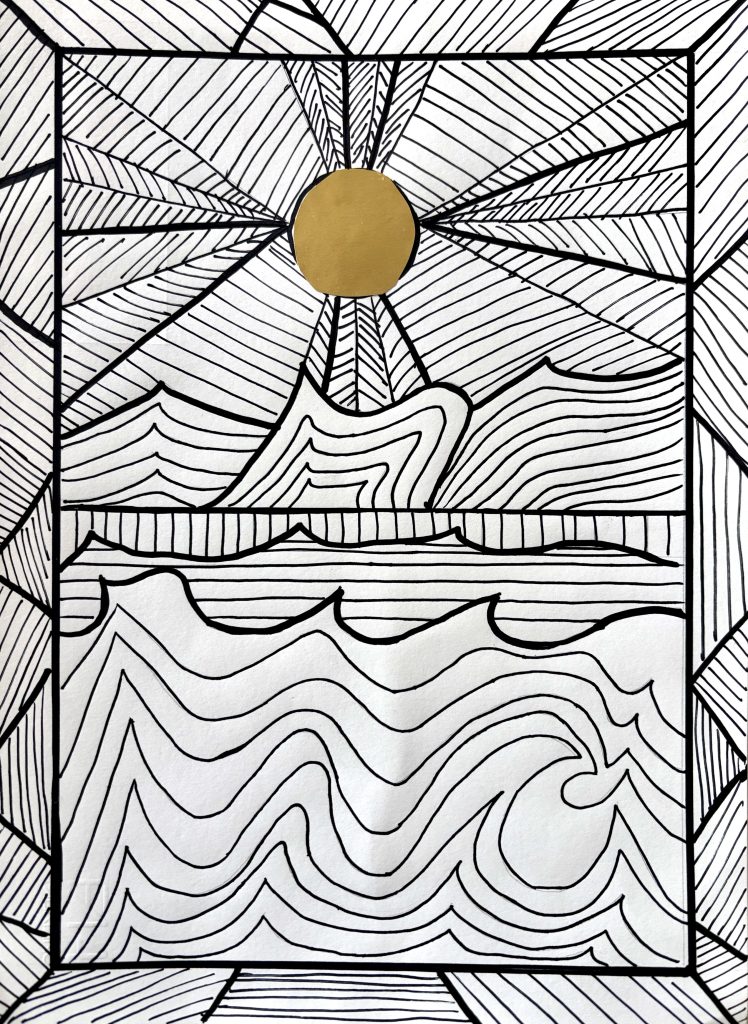 Per concludere, noi abbiamo decorato anche la cornice esterna, riempiendola con motivi semplici fatti sempre di linee parallele nere. Infine, abbiamo aggiunto un punto focale: abbiamo disegnato un Sole o una Luna e lo abbiamo rivestito con la carta stagnola dorata, incollandola con cura. Questo tocco di luce dorata è il contrasto perfetto per l’intensità delle linee nere.