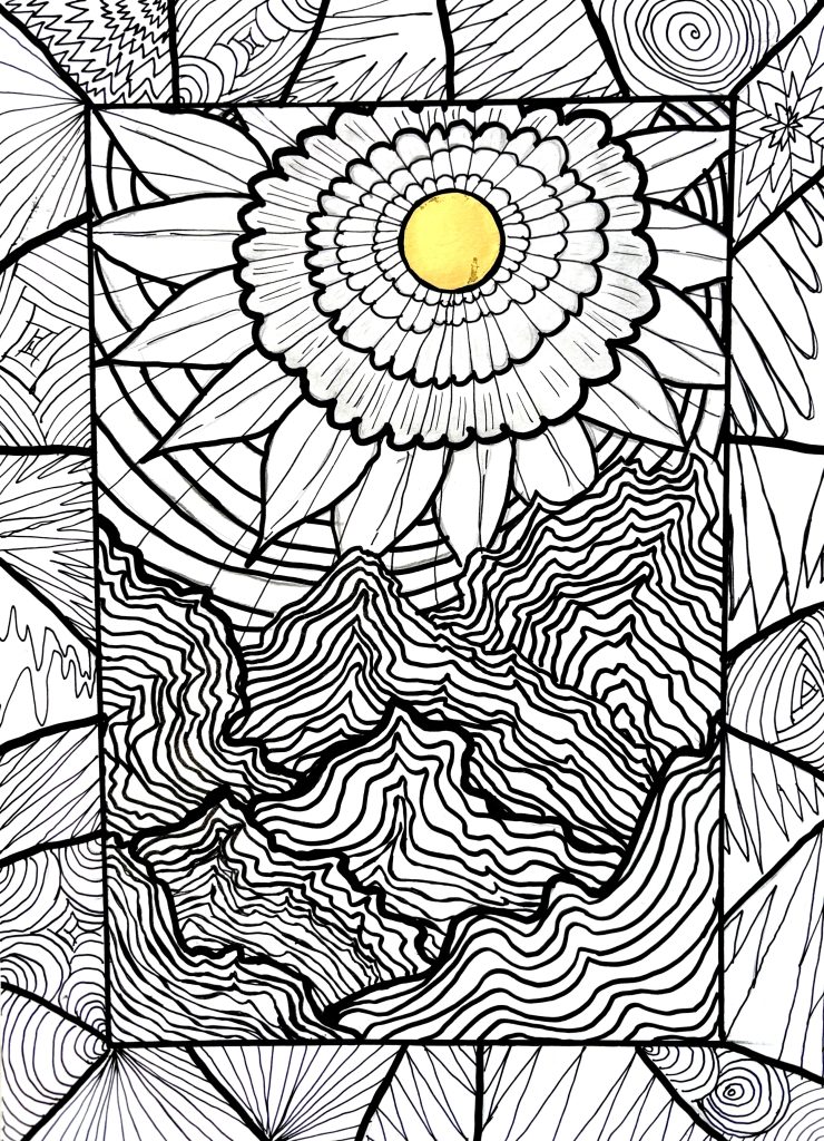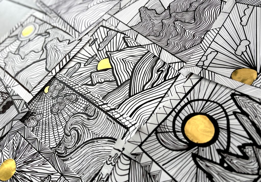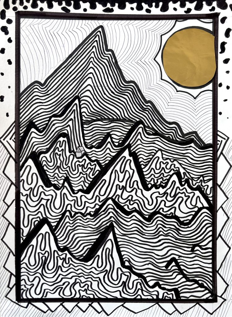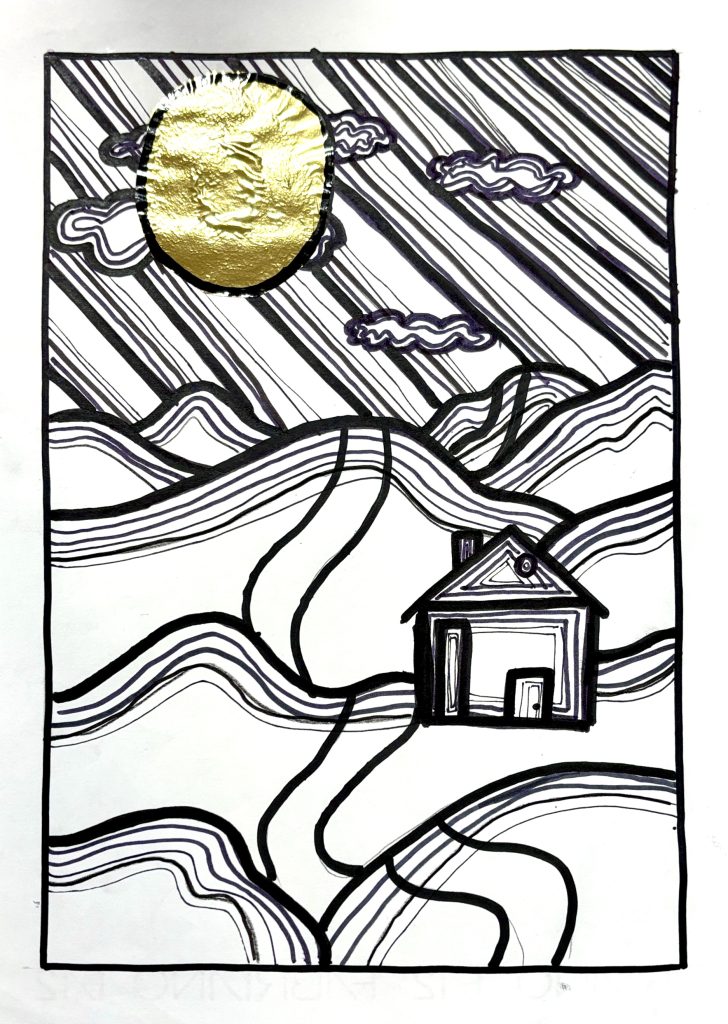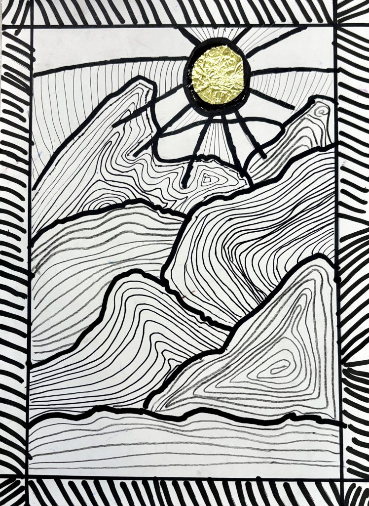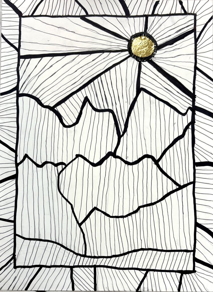 Per concludere, noi abbiamo decorato anche la cornice esterna, riempiendola con motivi semplici fatti sempre di linee parallele nere. Infine, abbiamo aggiunto un punto focale: abbiamo disegnato un Sole o una Luna e lo abbiamo rivestito con la carta stagnola dorata, incollandola con cura. Questo tocco di luce dorata è il contrasto perfetto per l’intensità delle linee nere.