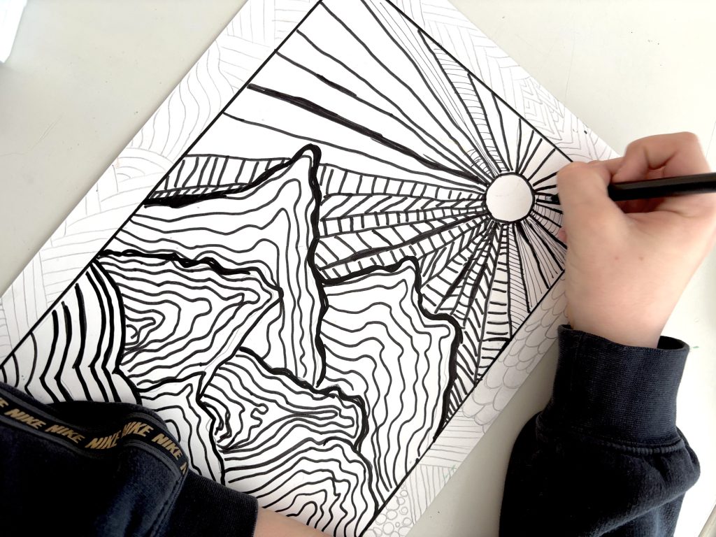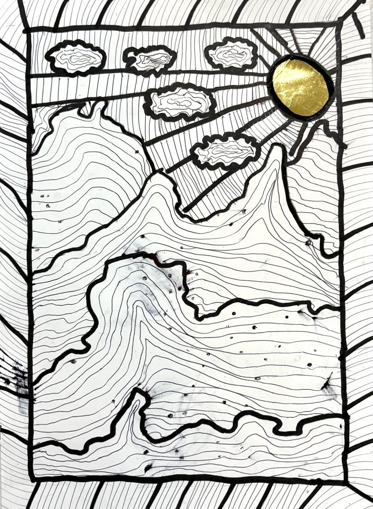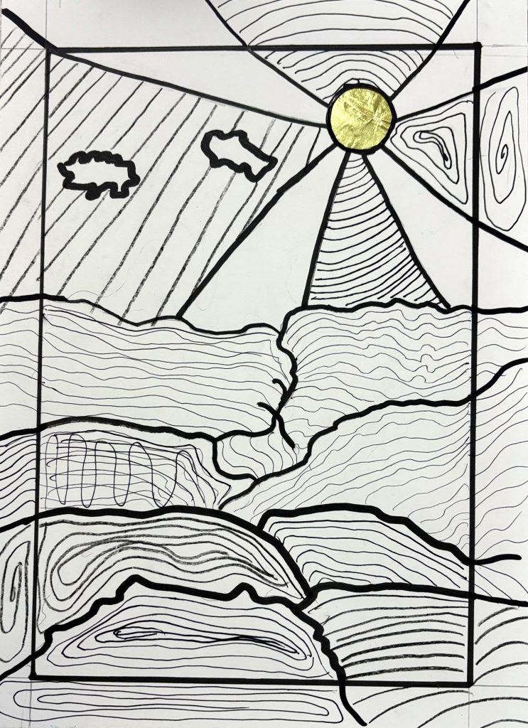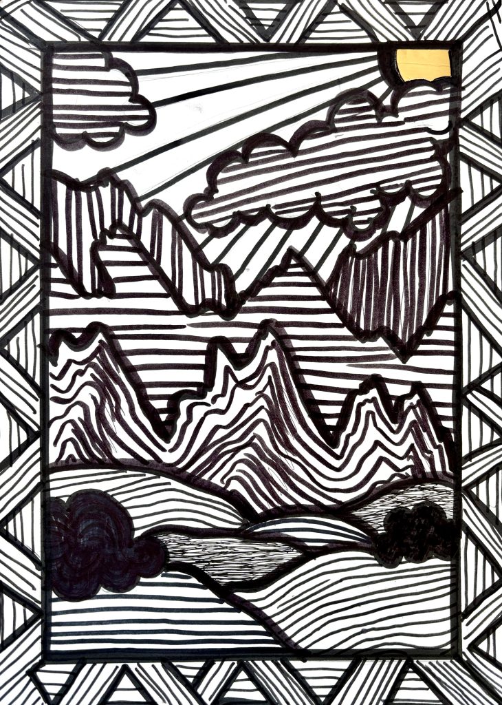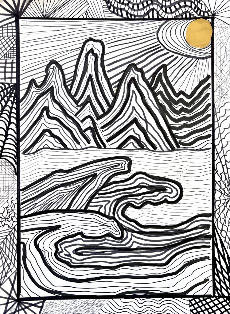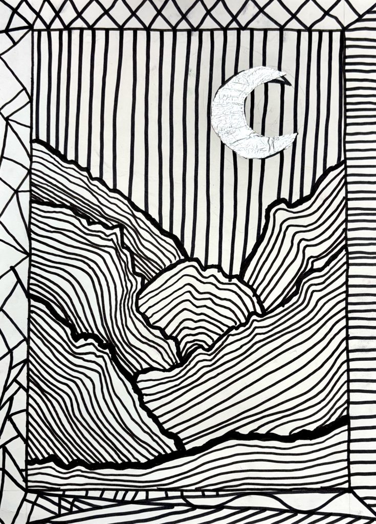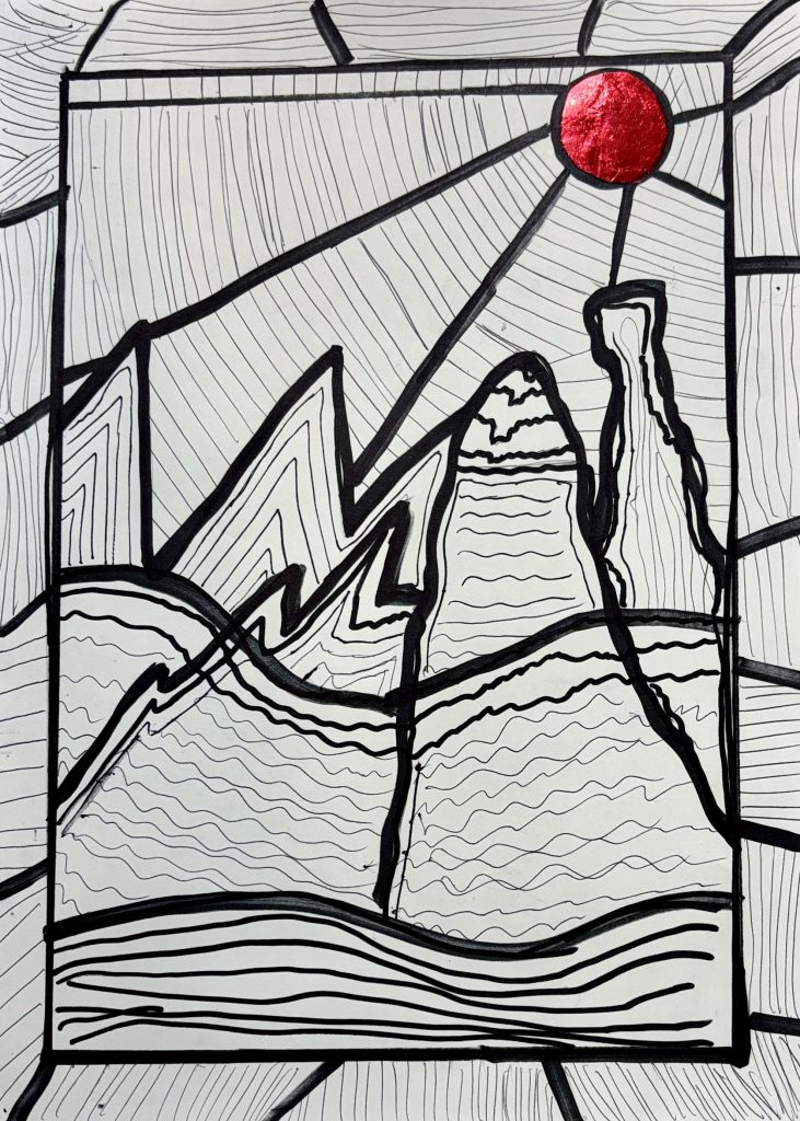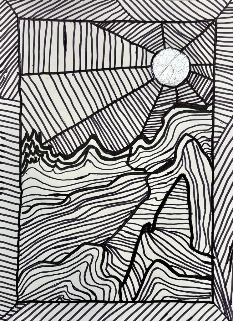 Con le classi di prima media abbiamo fatto un laboratorio su uno degli elementi fondamentali dell’arte: la Linea. Il nostro obiettivo era trasformare un semplice paesaggio in una composizione dinamica, usando solo linee parallele di colore nero. Questa attività ha potenziato la nostra sensibilità grafica, la capacità di gestire il contrasto e la profondità spaziale, offrendoci al contempo un modo per esplorare la varietà dei materiali. L’idea viene da Stephanie Villiotis, una collega americana della Pennsylvania: potete trovare il suo sito a questo link.
