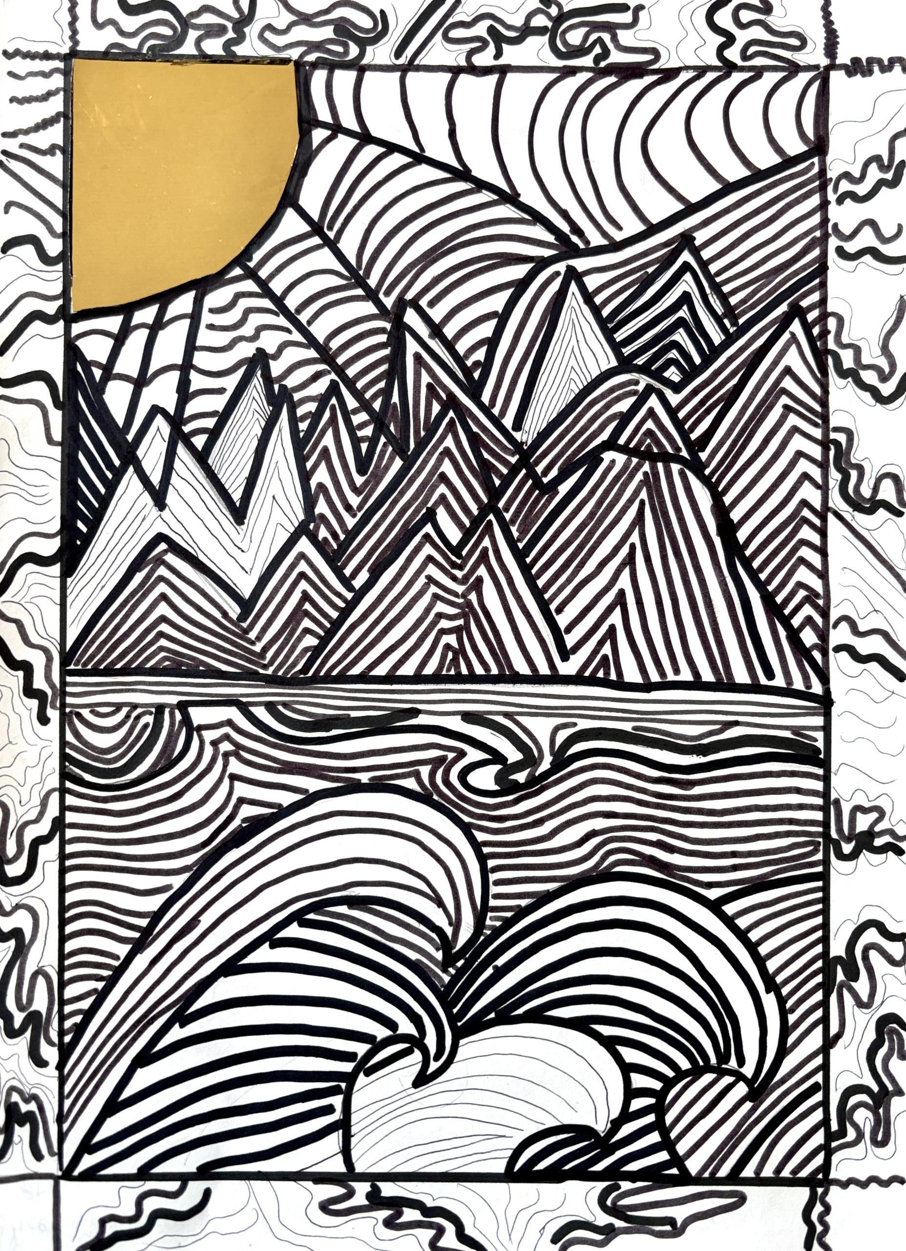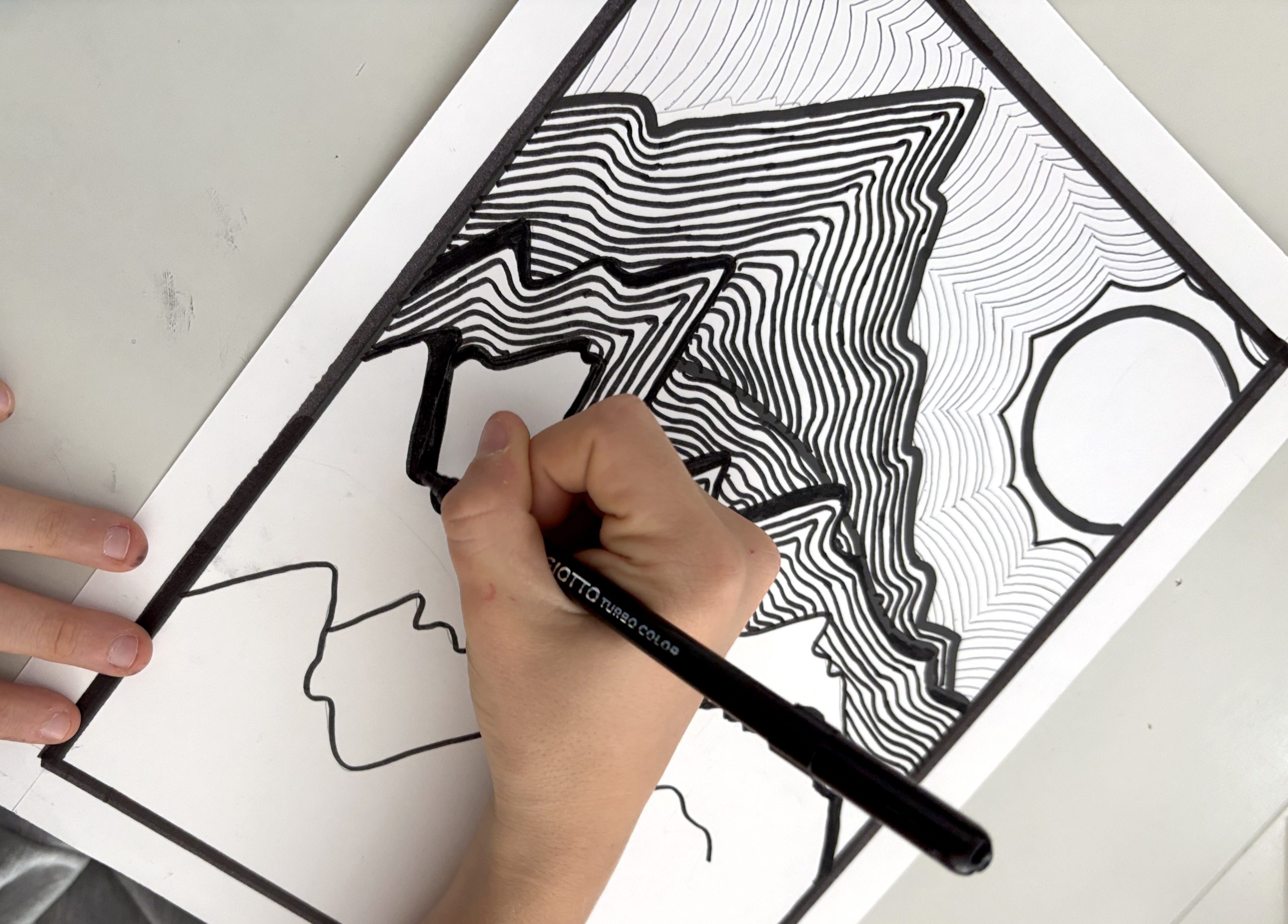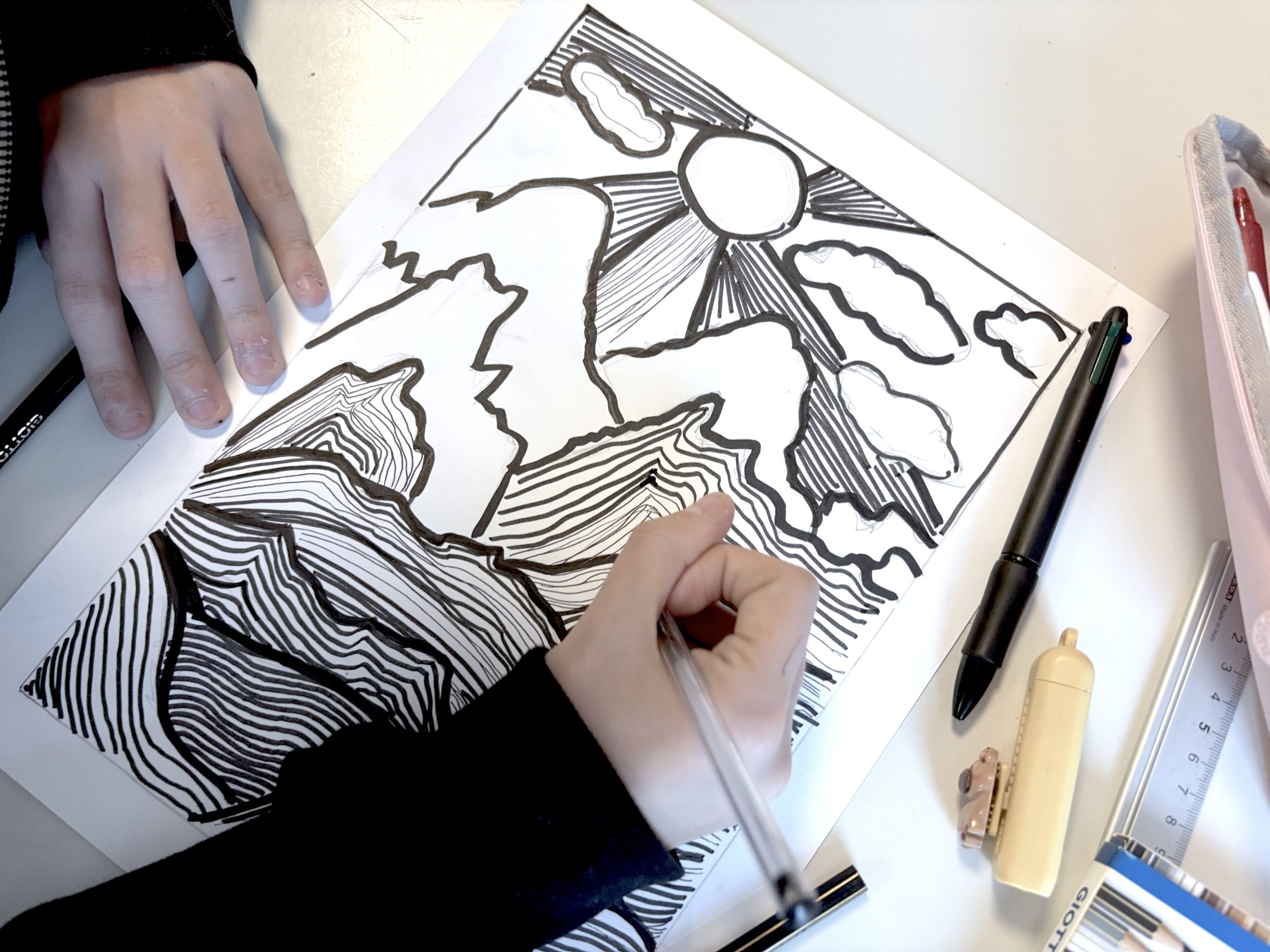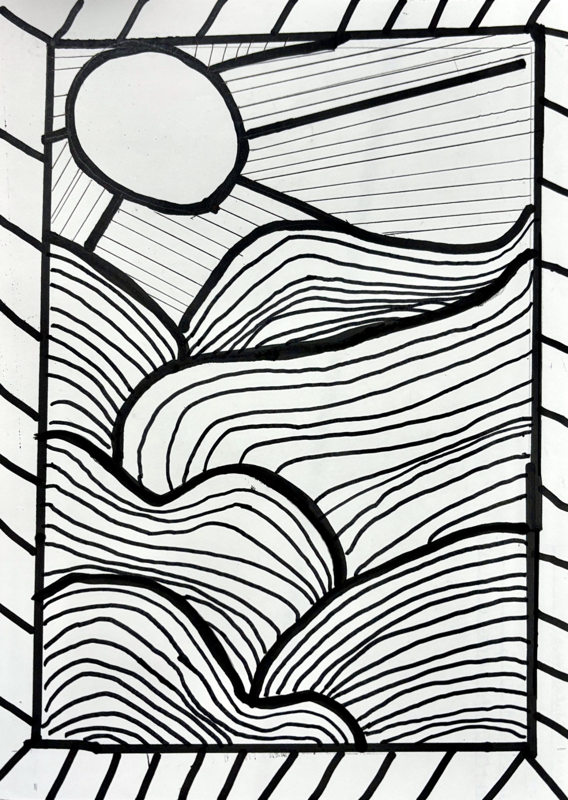Con le classi di prima media abbiamo fatto un laboratorio su uno degli elementi fondamentali dell’arte: la Linea. Il nostro obiettivo era trasformare un semplice paesaggio in una composizione dinamica, usando solo linee parallele di colore nero. Questa attività ha potenziato la nostra sensibilità grafica, la capacità di gestire il contrasto e la profondità spaziale, offrendoci al contempo un modo per esplorare la varietà dei materiali. L’idea viene da Stephanie Villiotis, una collega americana della Pennsylvania: potete trovare il suo sito a questo link.