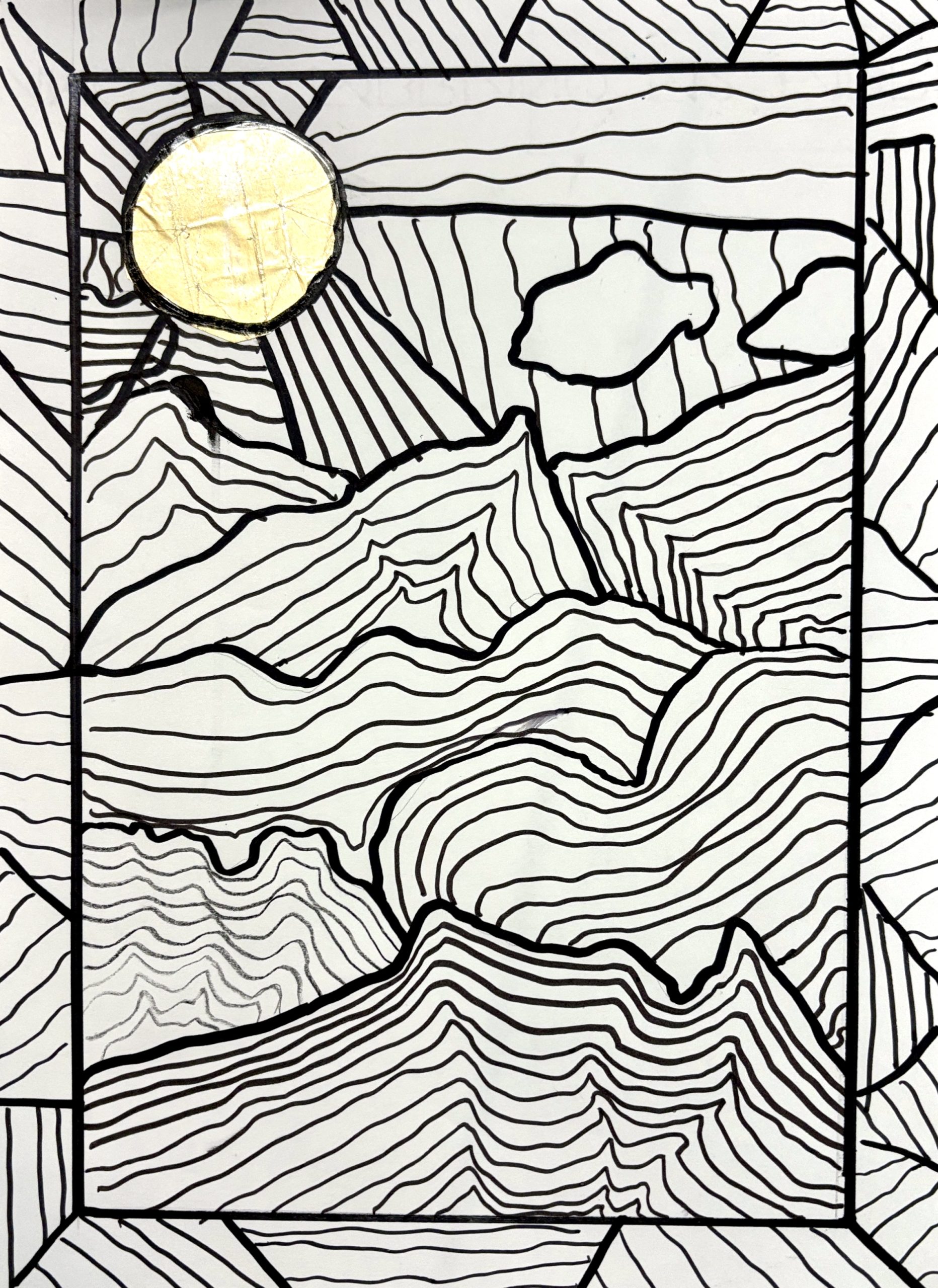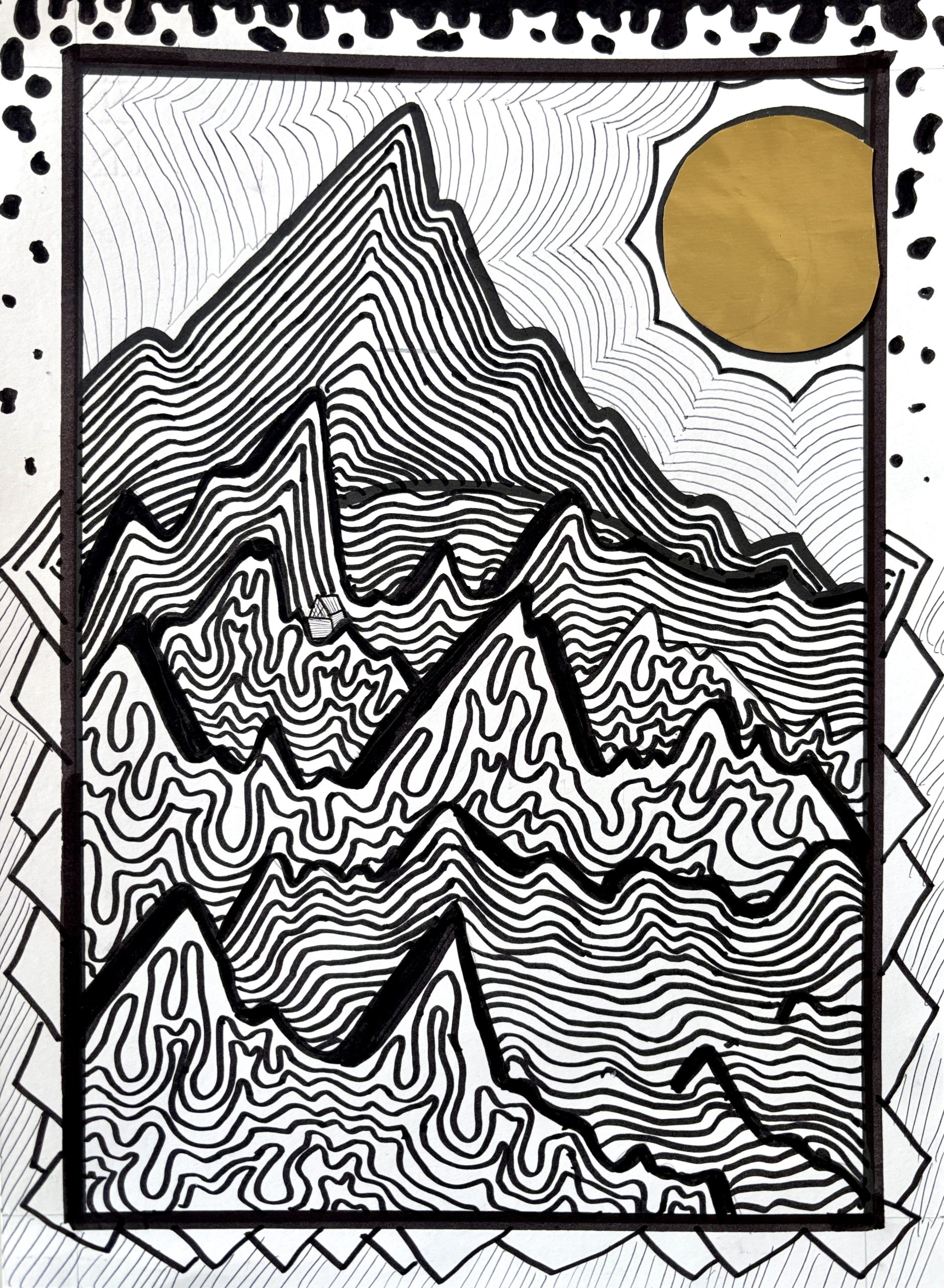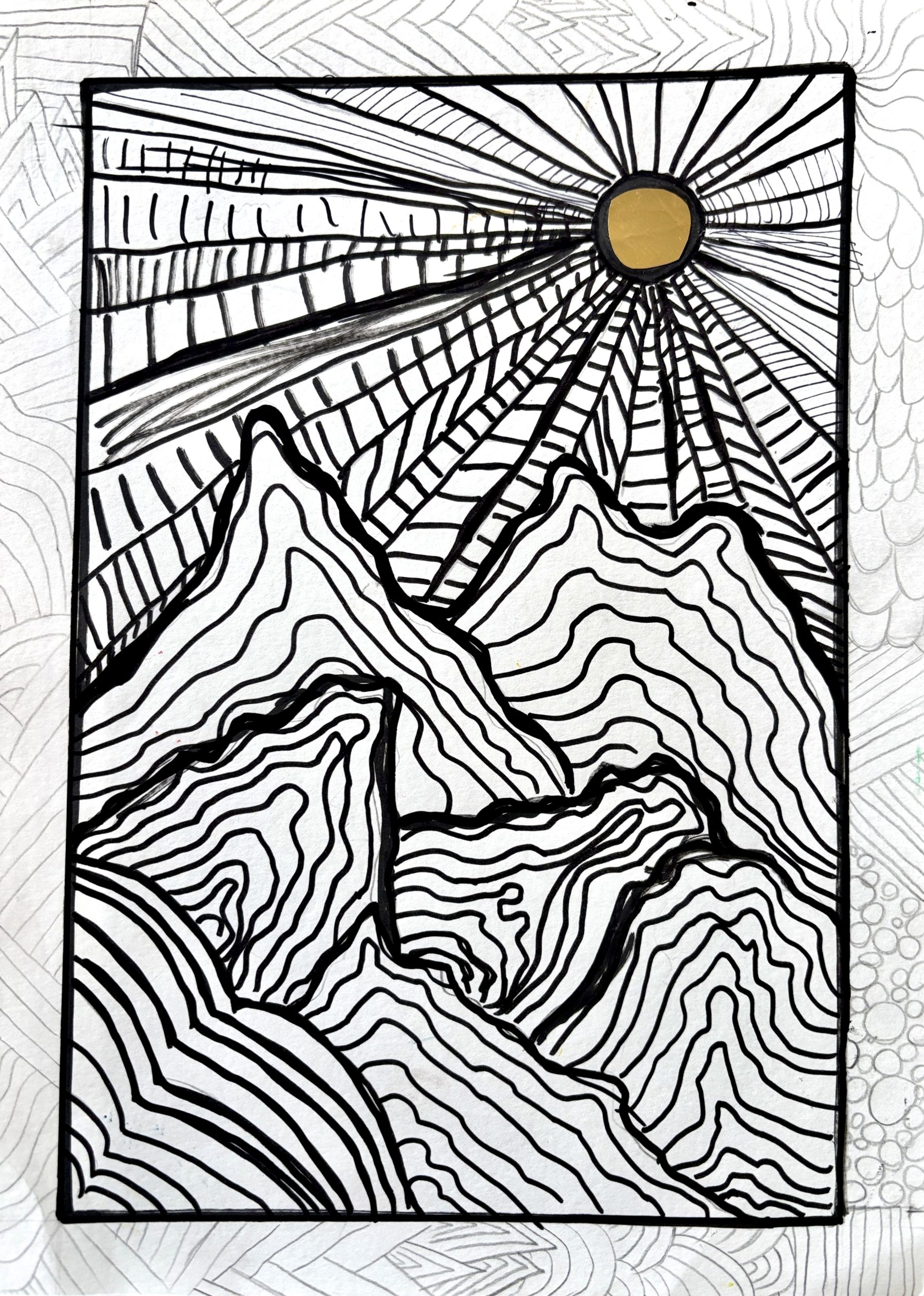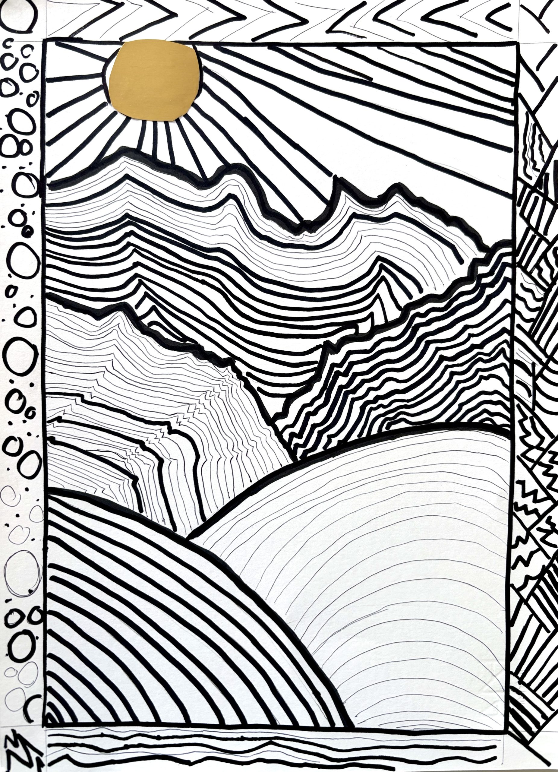 Con le classi di prima media abbiamo fatto un laboratorio su uno degli elementi fondamentali dell’arte: la Linea. Il nostro obiettivo era trasformare un semplice paesaggio in una composizione dinamica, usando solo linee parallele di colore nero. Questa attività ha potenziato la nostra sensibilità grafica, la capacità di gestire il contrasto e la profondità spaziale, offrendoci al contempo un modo per esplorare la varietà dei materiali. L’idea viene da Stephanie Villiotis, una collega americana della Pennsylvania: potete trovare il suo sito a questo link.