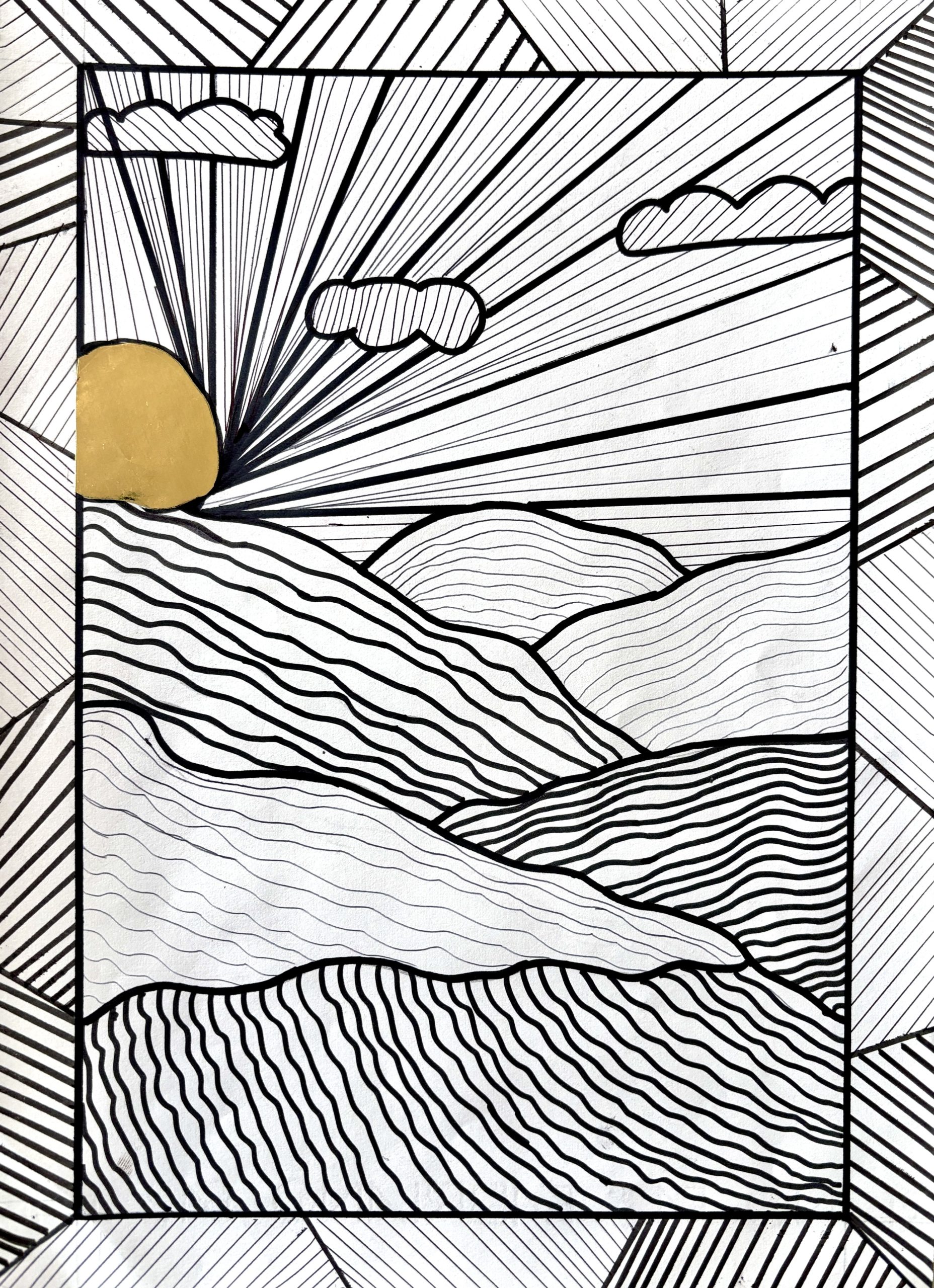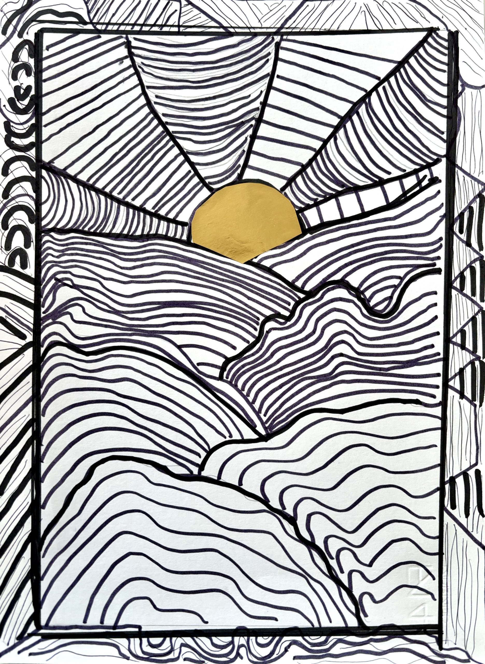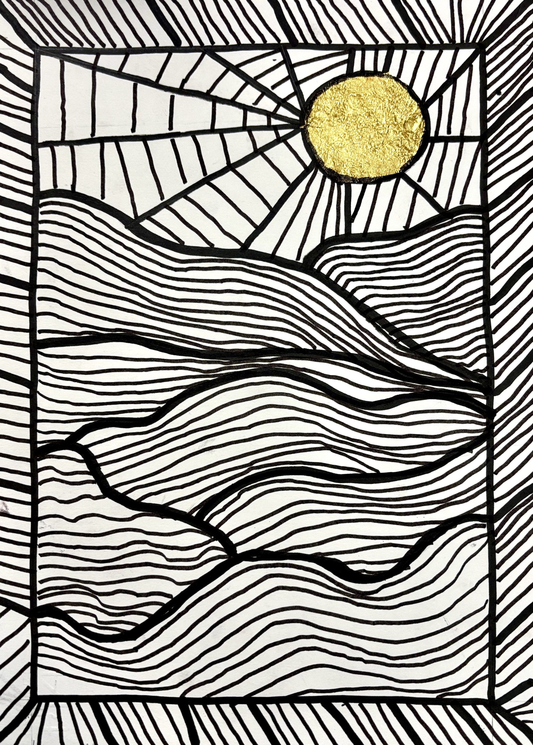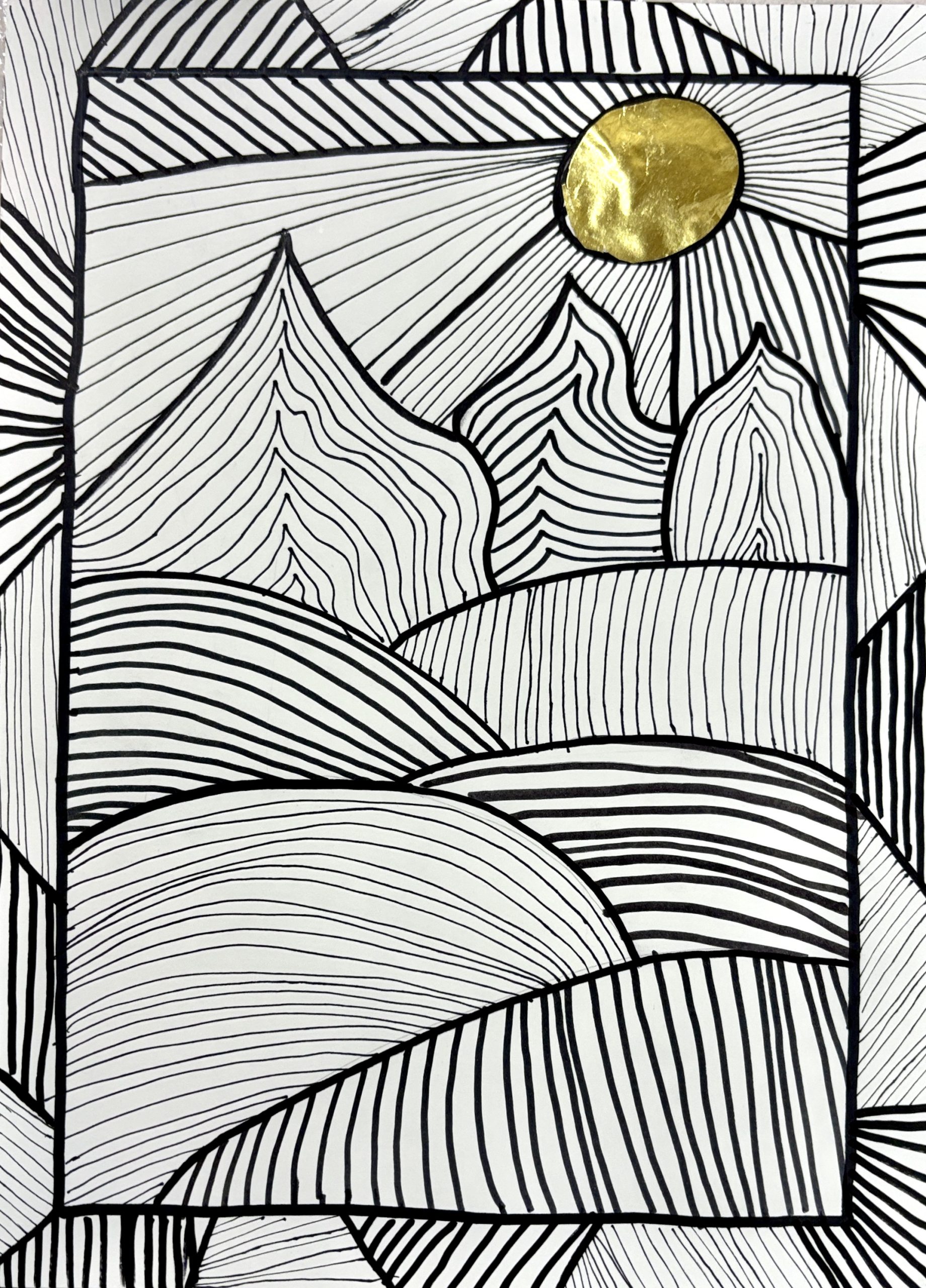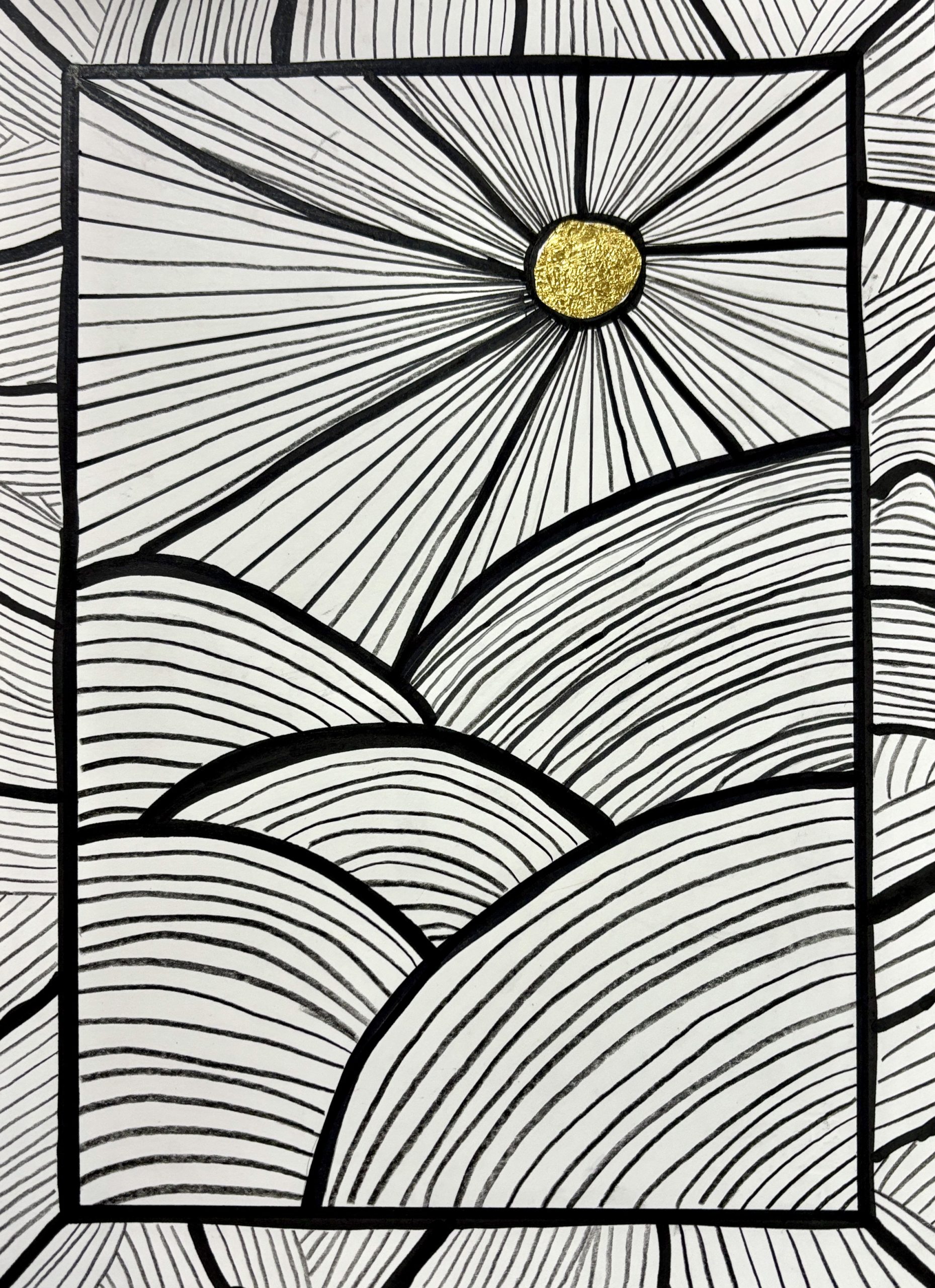 Per concludere, noi abbiamo decorato anche la cornice esterna, riempiendola con motivi semplici fatti sempre di linee parallele nere. Infine, abbiamo aggiunto un punto focale: abbiamo disegnato un Sole o una Luna e lo abbiamo rivestito con la carta stagnola dorata, incollandola con cura. Questo tocco di luce dorata è il contrasto perfetto per l’intensità delle linee nere.