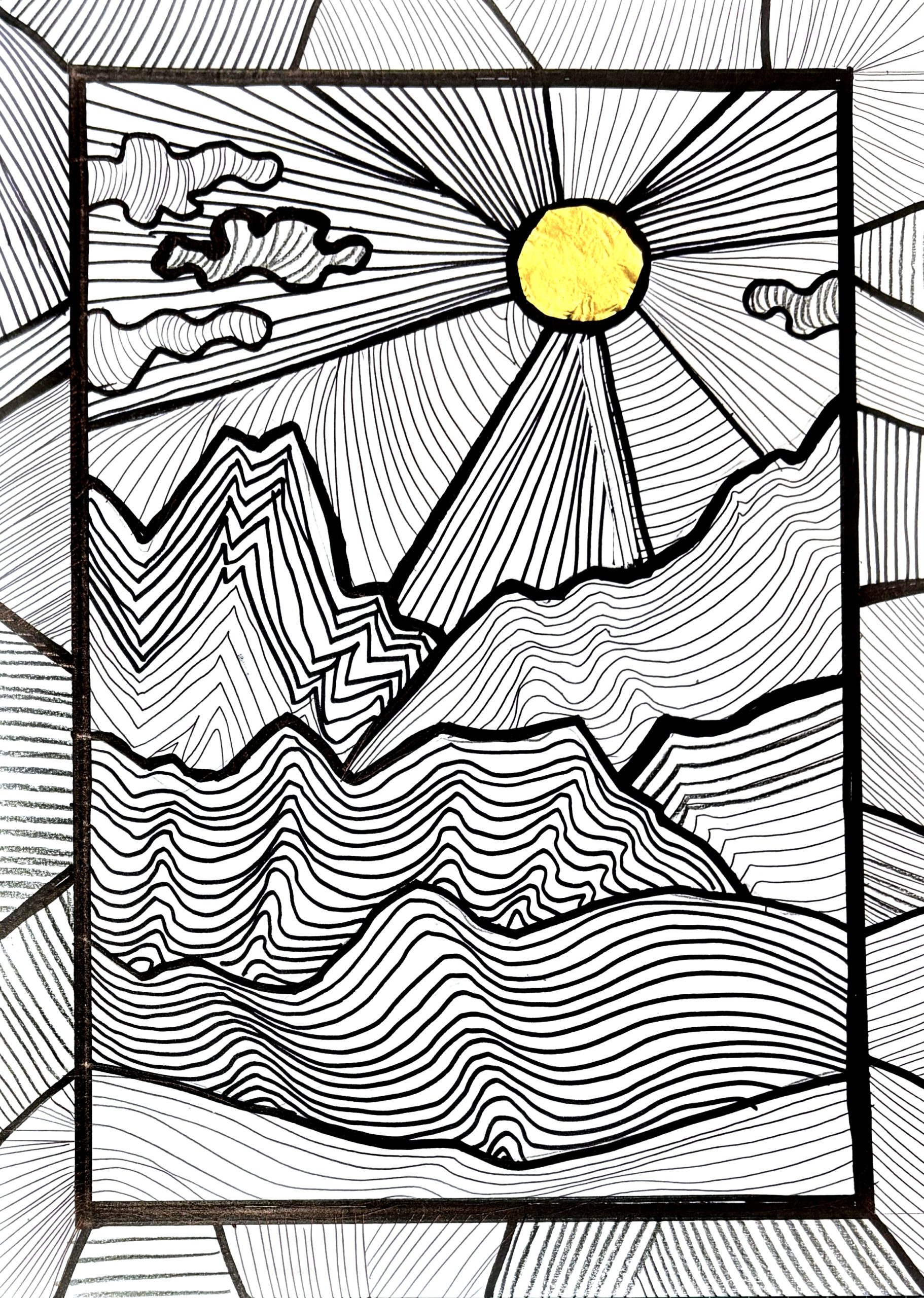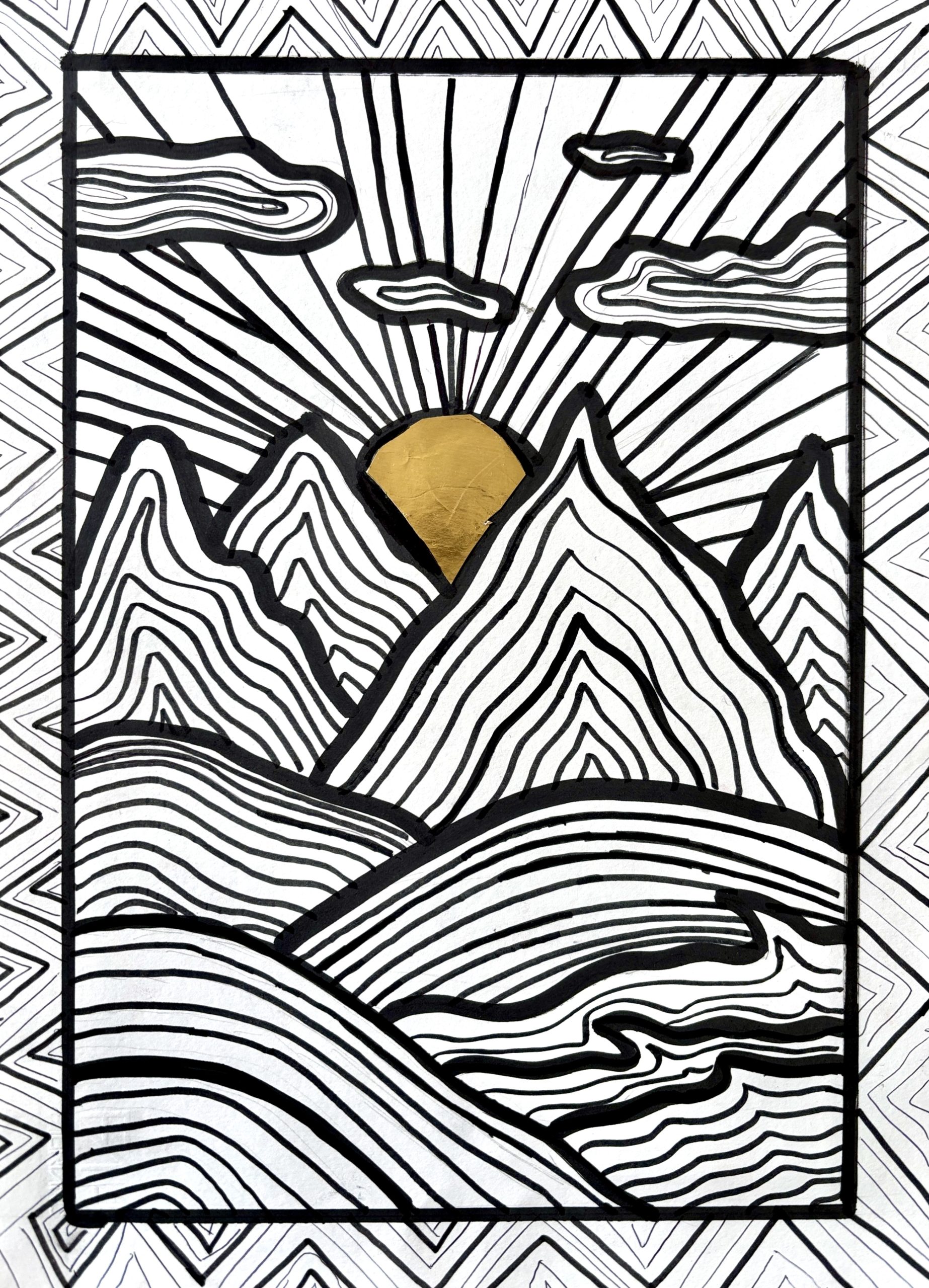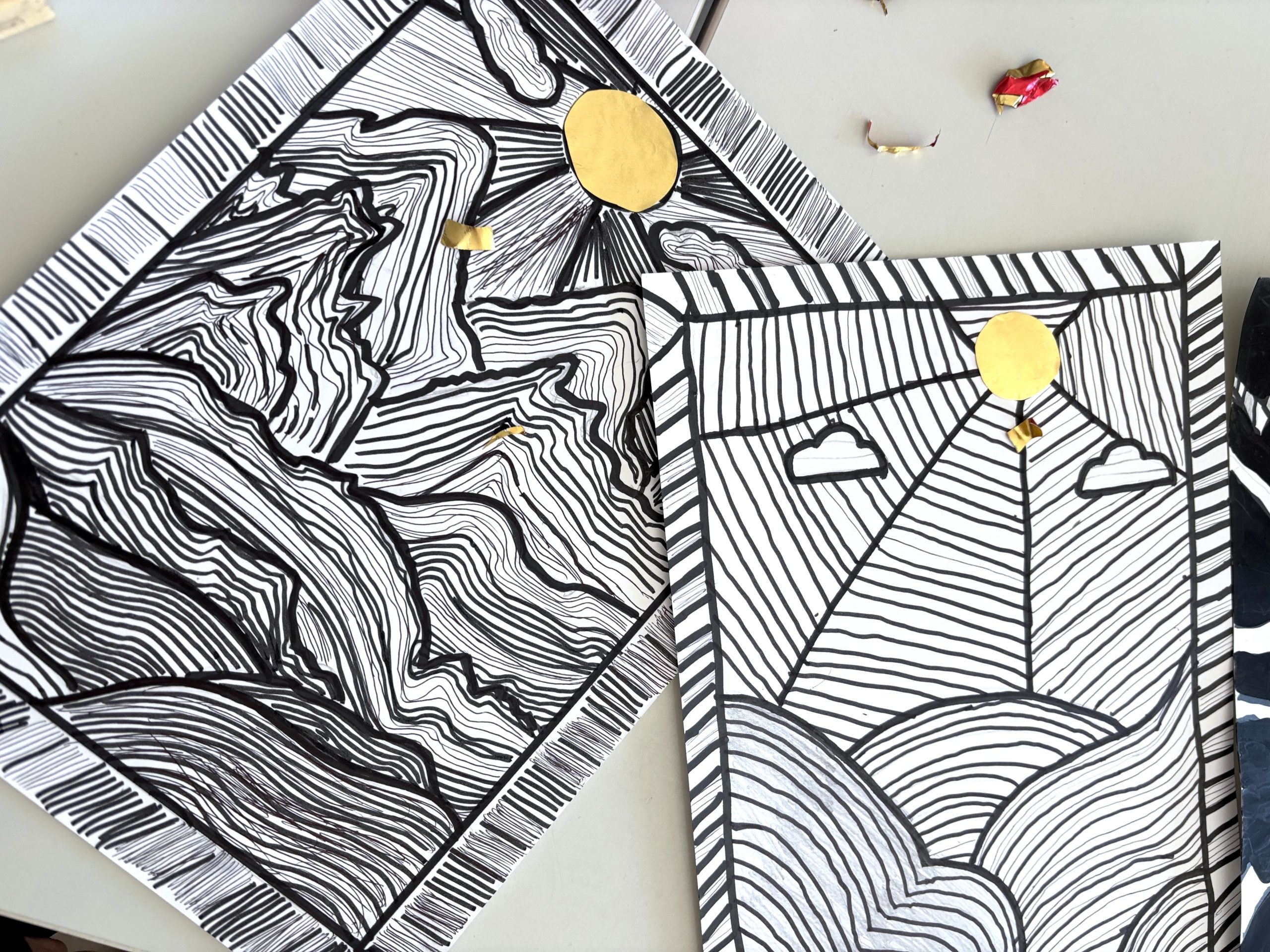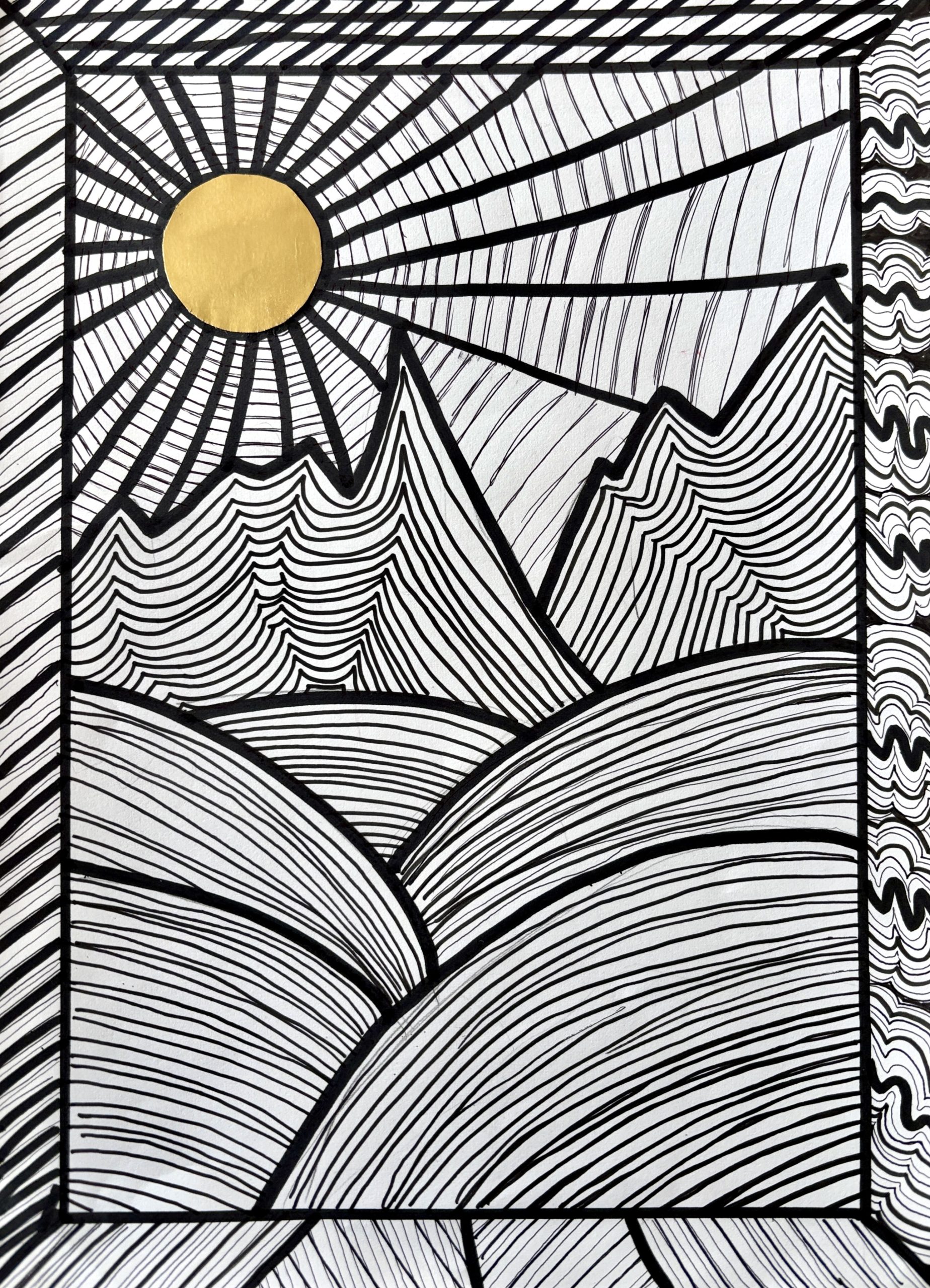 Per concludere, noi abbiamo decorato anche la cornice esterna, riempiendola con motivi semplici fatti sempre di linee parallele nere. Infine, abbiamo aggiunto un punto focale: abbiamo disegnato un Sole o una Luna e lo abbiamo rivestito con la carta stagnola dorata, incollandola con cura. Questo tocco di luce dorata è il contrasto perfetto per l’intensità delle linee nere.