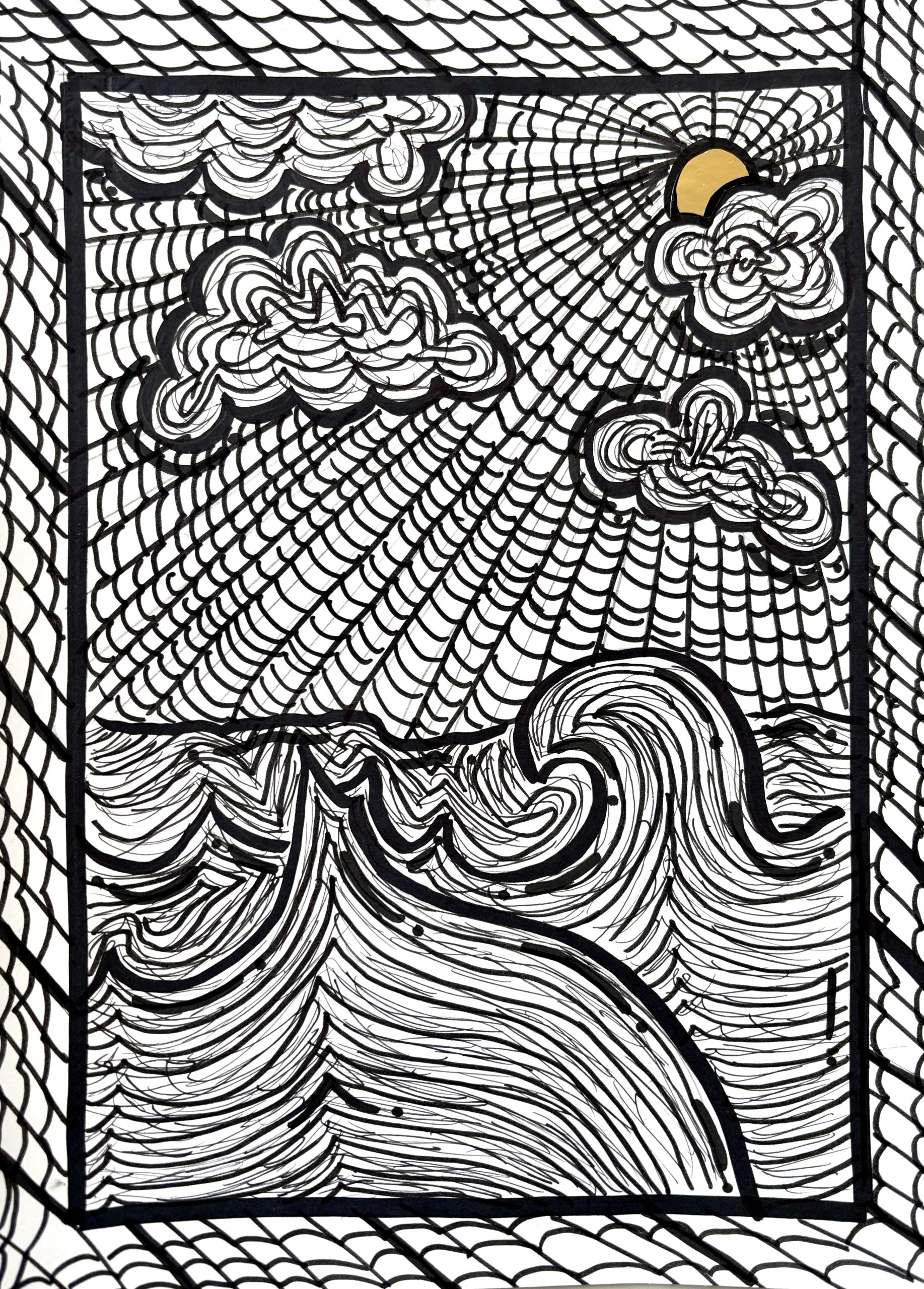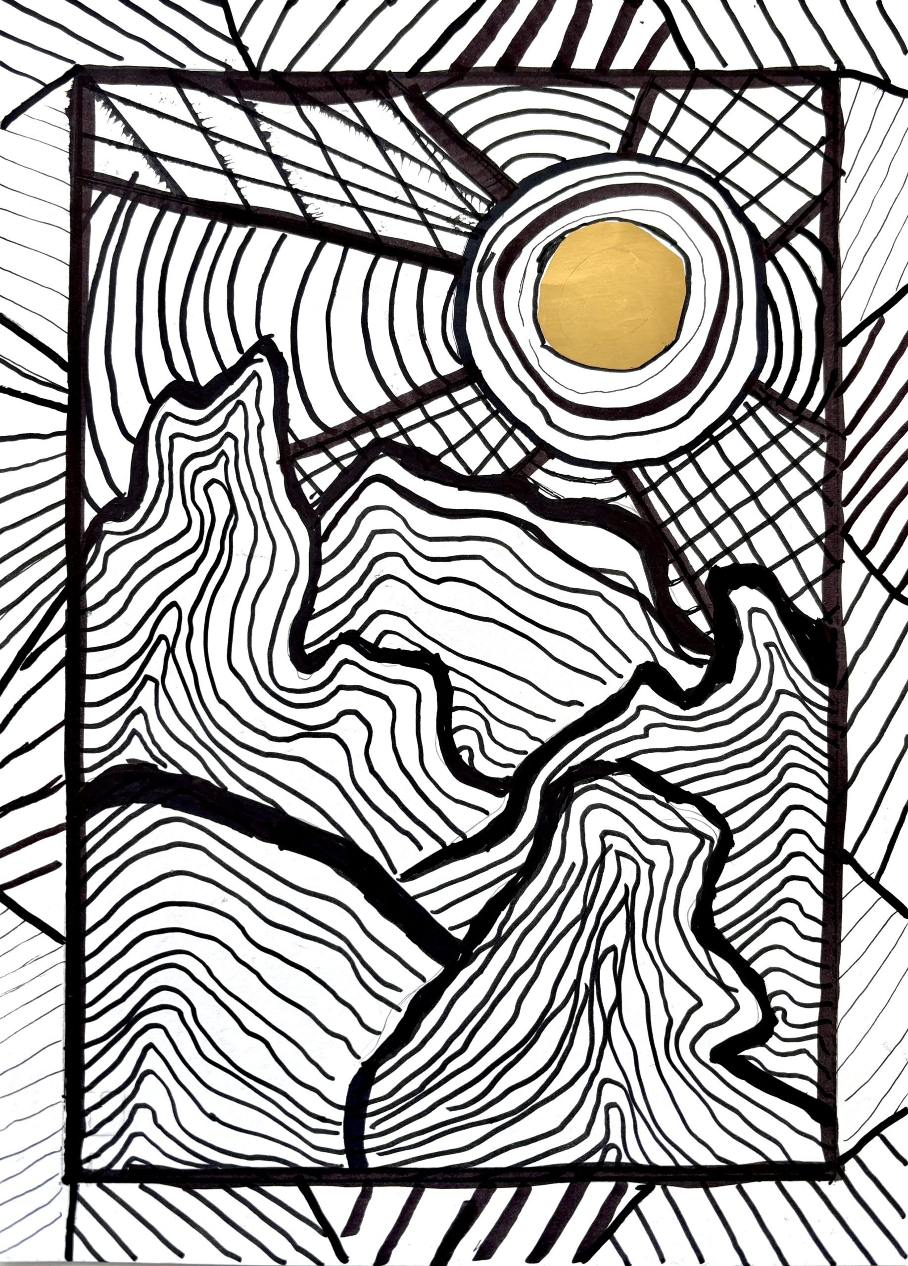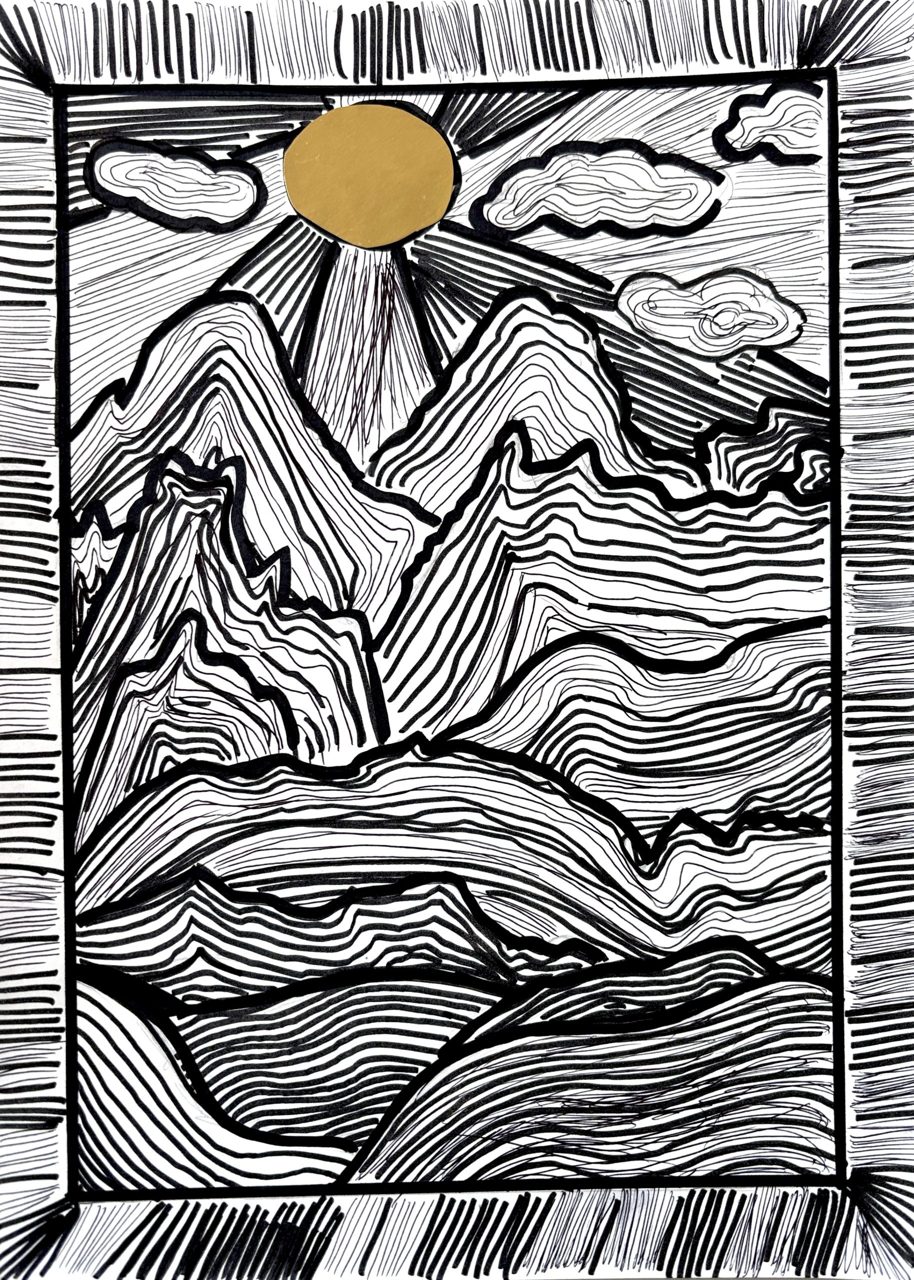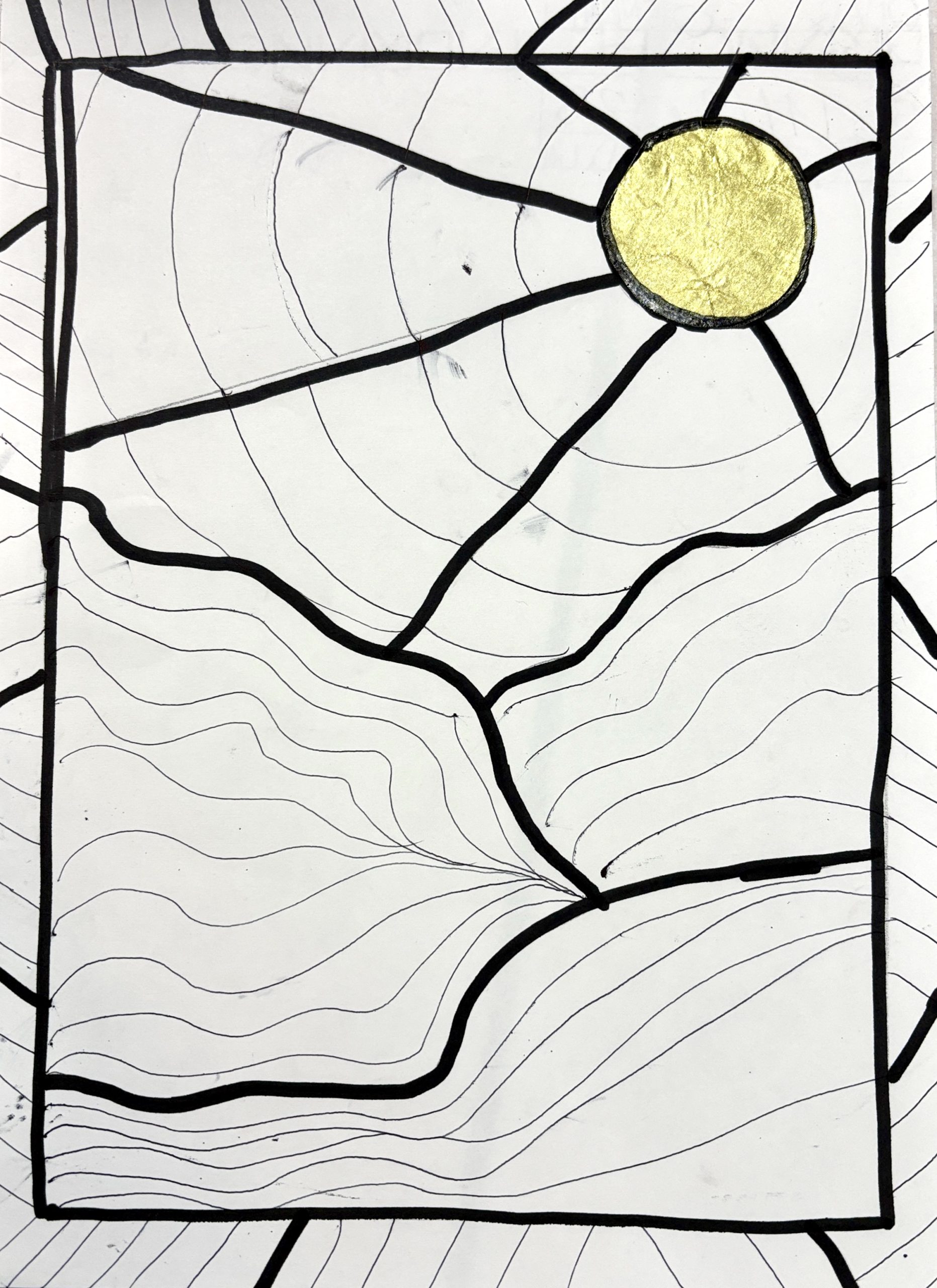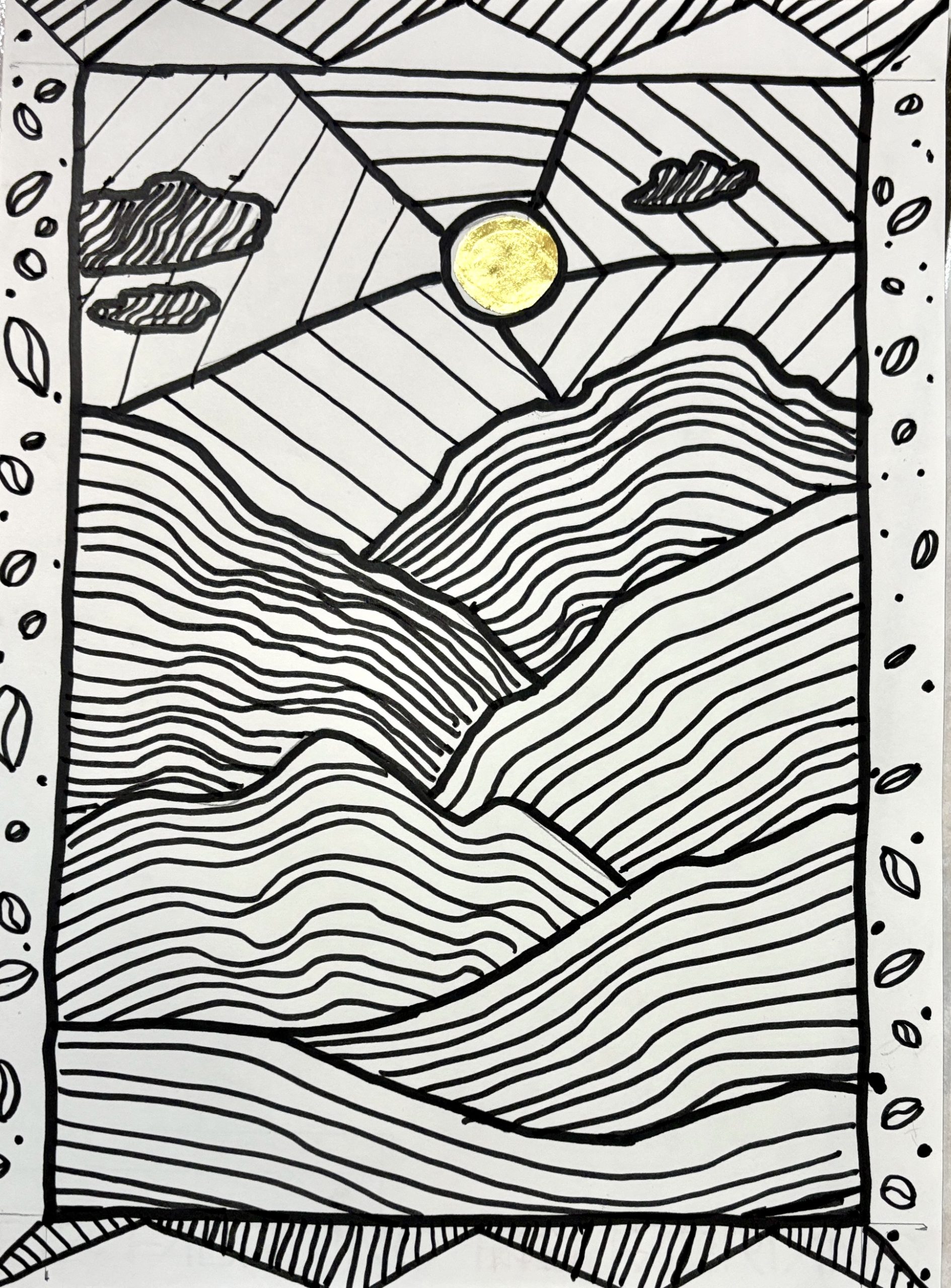 Per concludere, noi abbiamo decorato anche la cornice esterna, riempiendola con motivi semplici fatti sempre di linee parallele nere. Infine, abbiamo aggiunto un punto focale: abbiamo disegnato un Sole o una Luna e lo abbiamo rivestito con la carta stagnola dorata, incollandola con cura. Questo tocco di luce dorata è il contrasto perfetto per l’intensità delle linee nere.