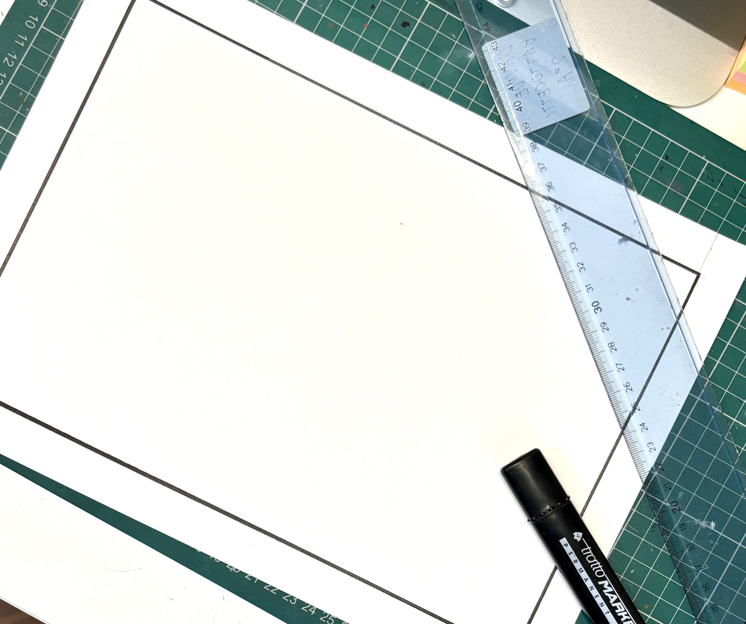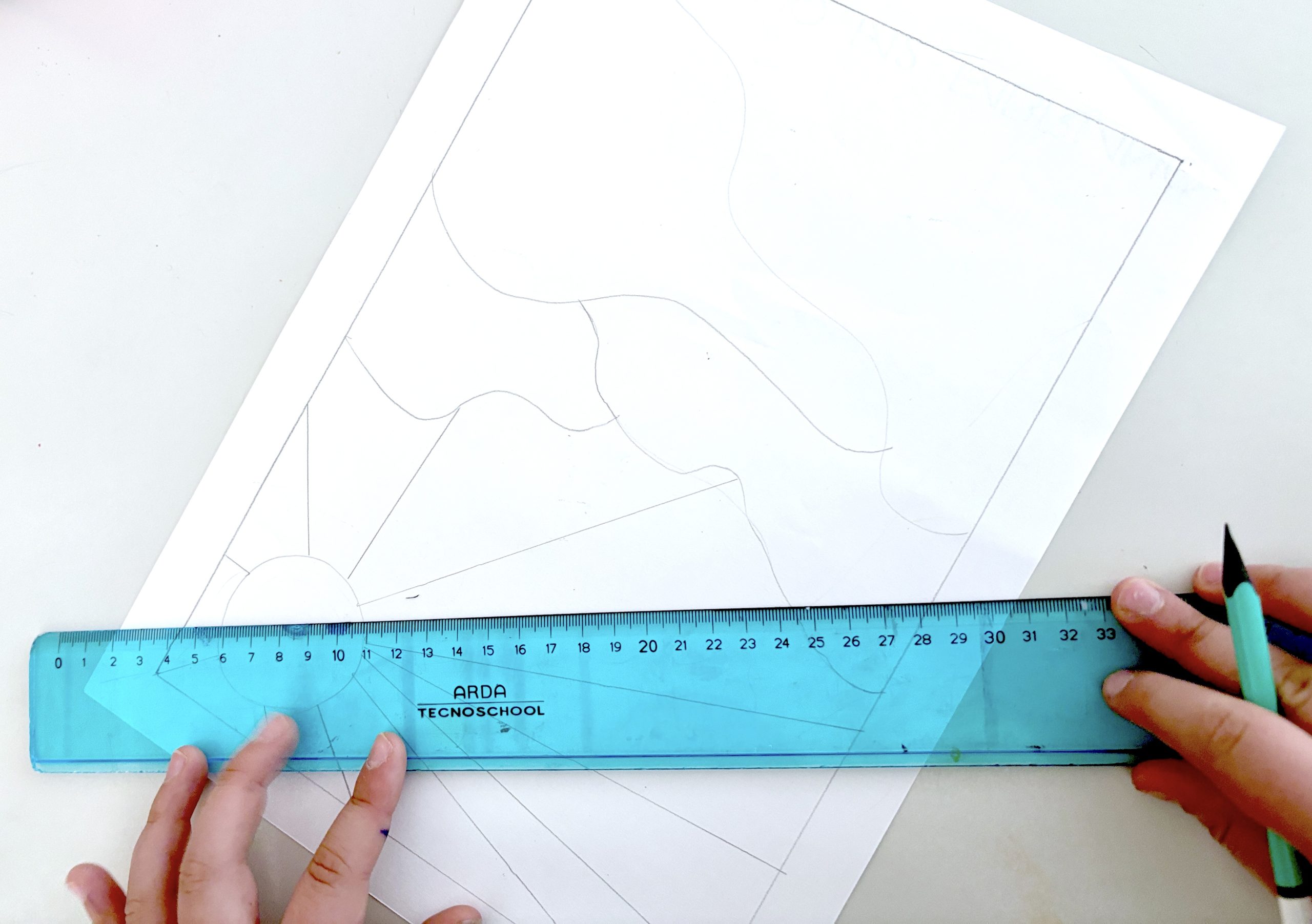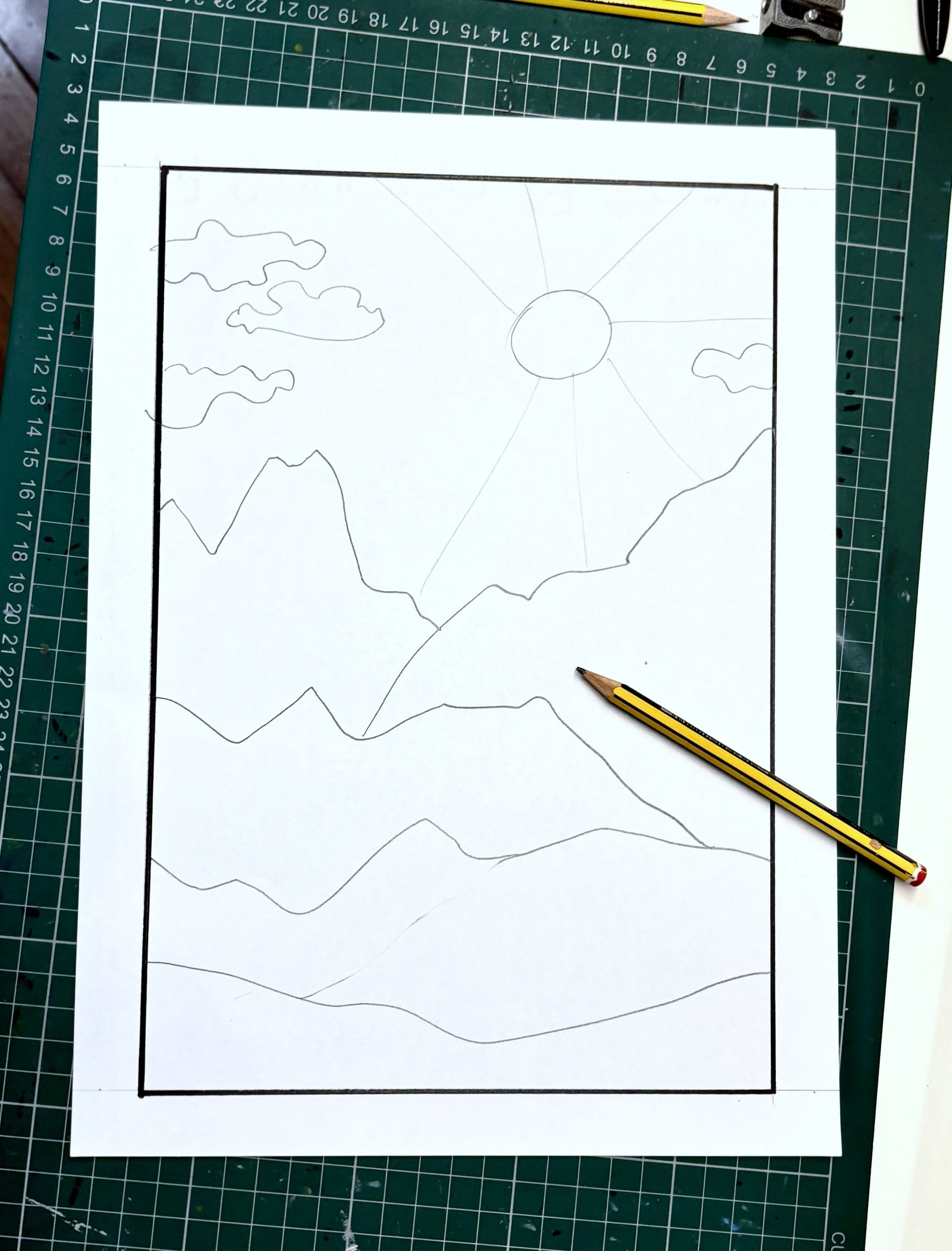 Per iniziare, noi abbiamo preparato la base disegnando una cornice di 3 cm lungo tutti i bordi del foglio, aiutandoci con il righello. Successivamente, abbiamo abbozzato il nostro paesaggio (montano o marino) suddividendolo in sette o otto livelli di profondità, dal primo piano fino al cielo.