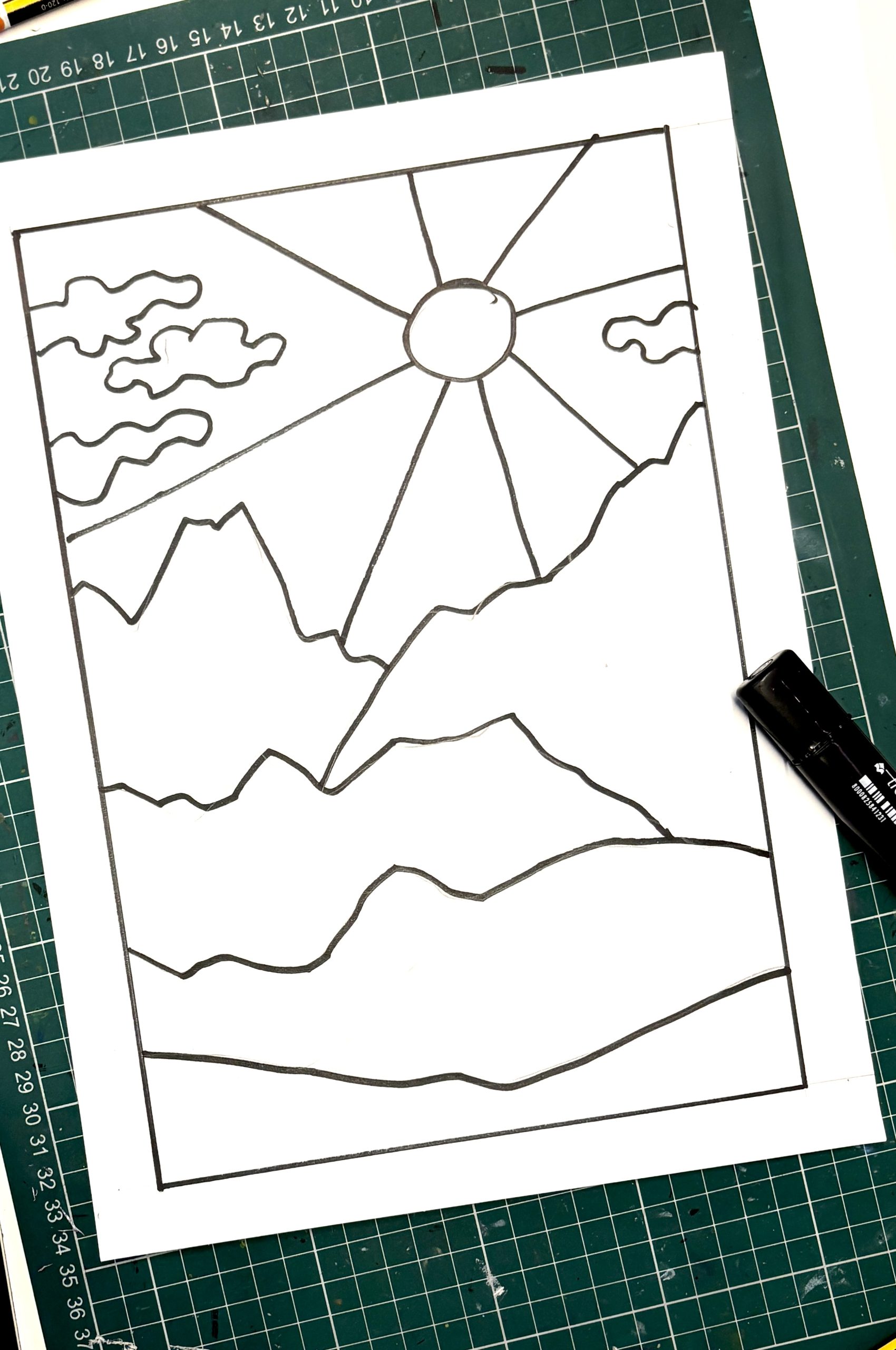 Una volta soddisfatti della composizione, noi abbiamo utilizzato il pennarello nero a punta grossa per delineare i contorni di tutti i livelli del paesaggio, rendendoli netti e visibili. Questo strato spesso serve a separare chiaramente le zone che andremo a riempire.