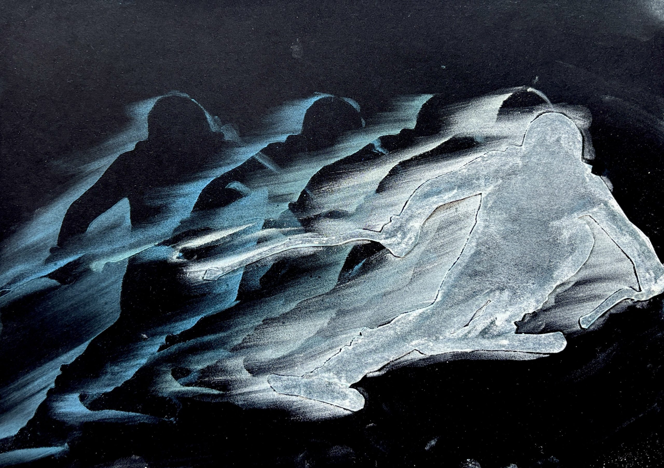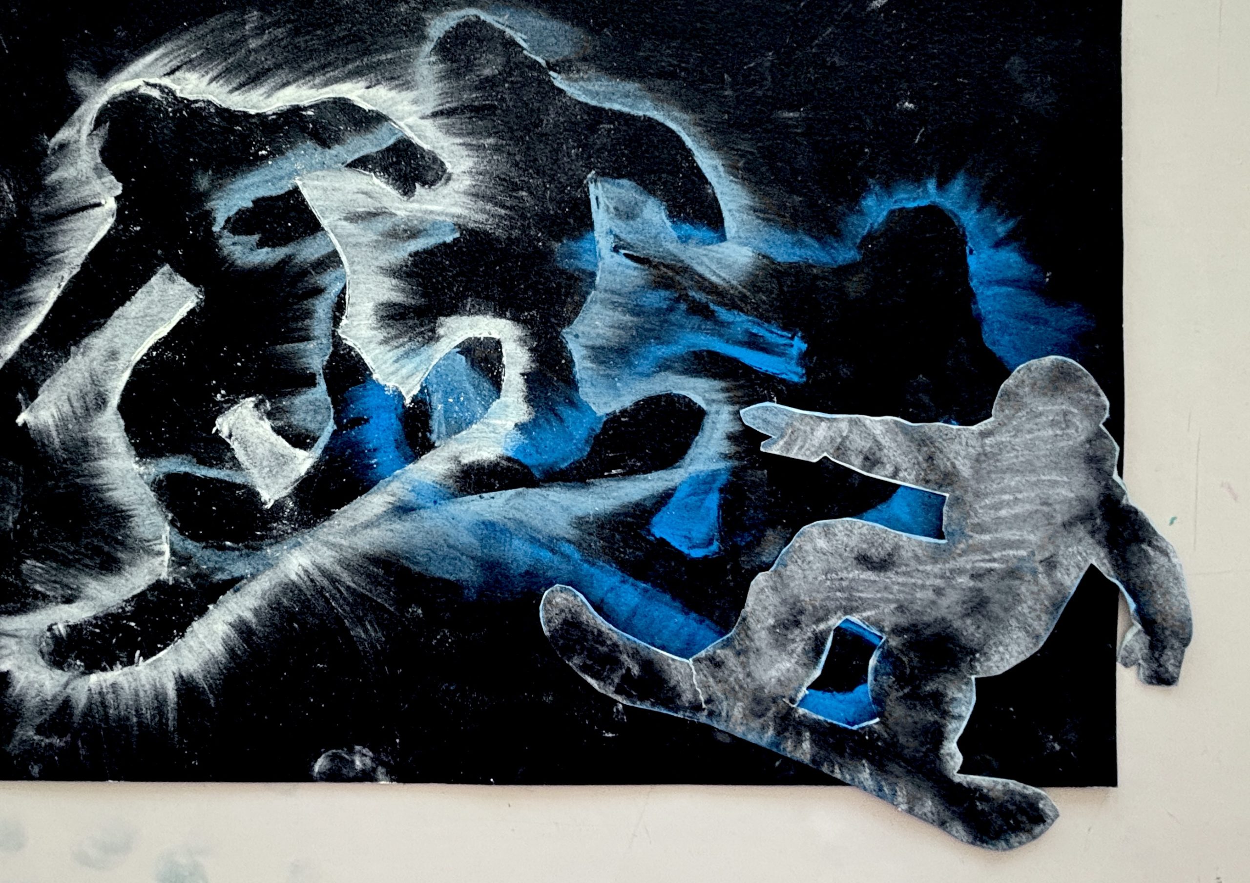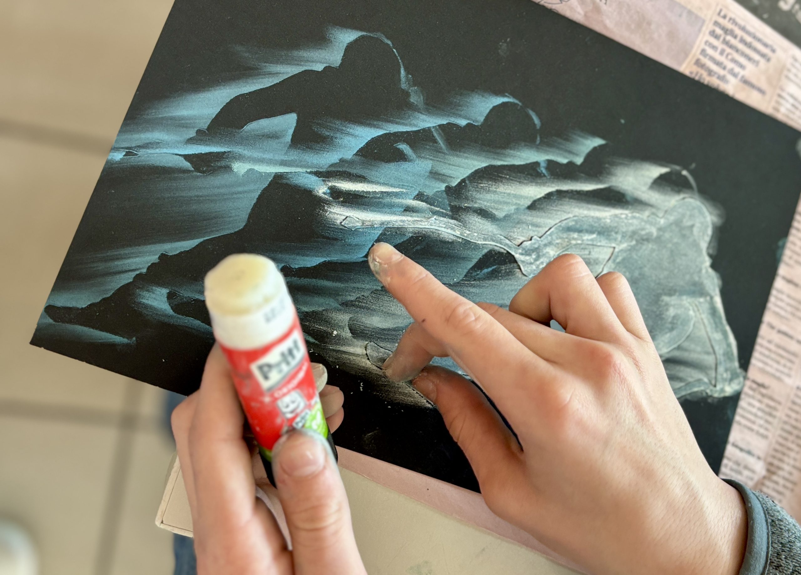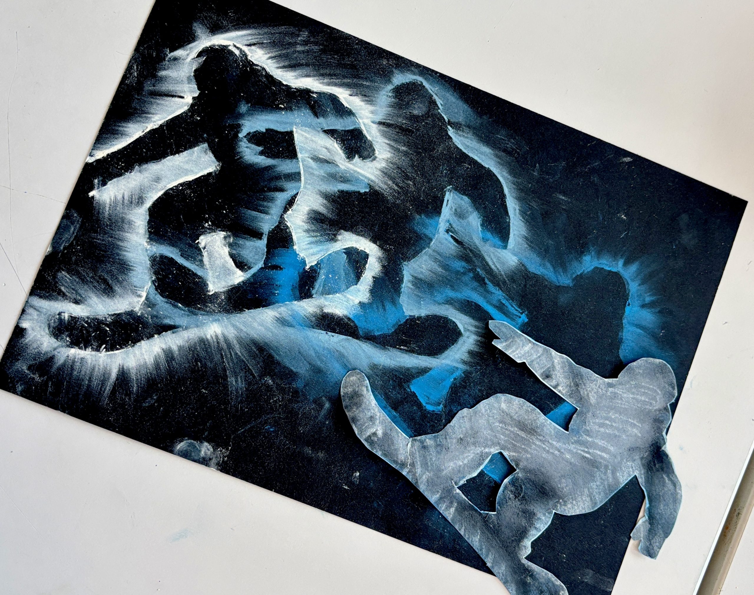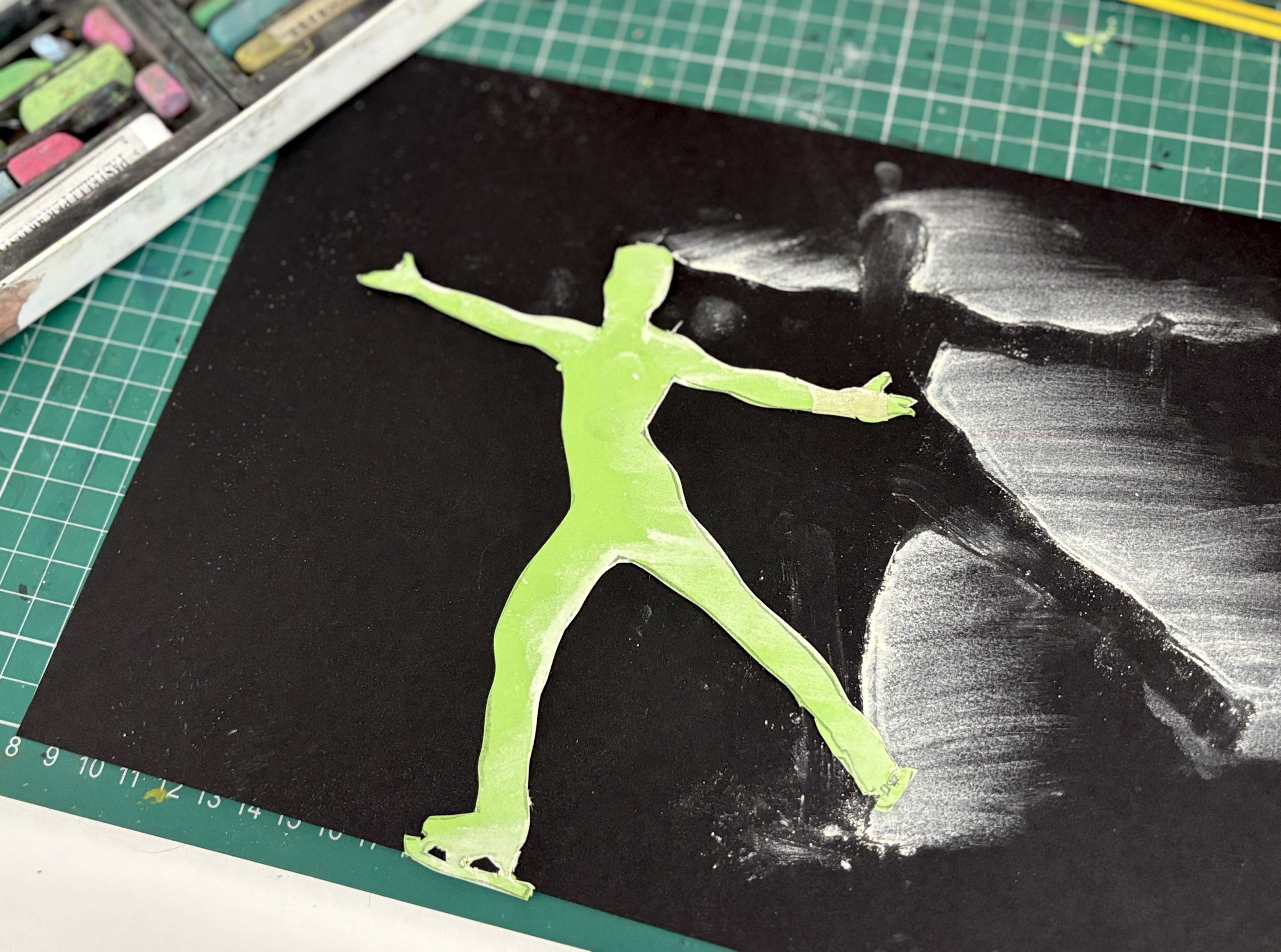 Prima di iniziare con il colore, abbiamo studiato la composizione sul cartoncino nero. Abbiamo pianificato come posizionare la nostra figura ritagliata per far entrare l’intera sequenza di movimenti all’interno del formato A4, simulando lo spostamento dell’atleta.