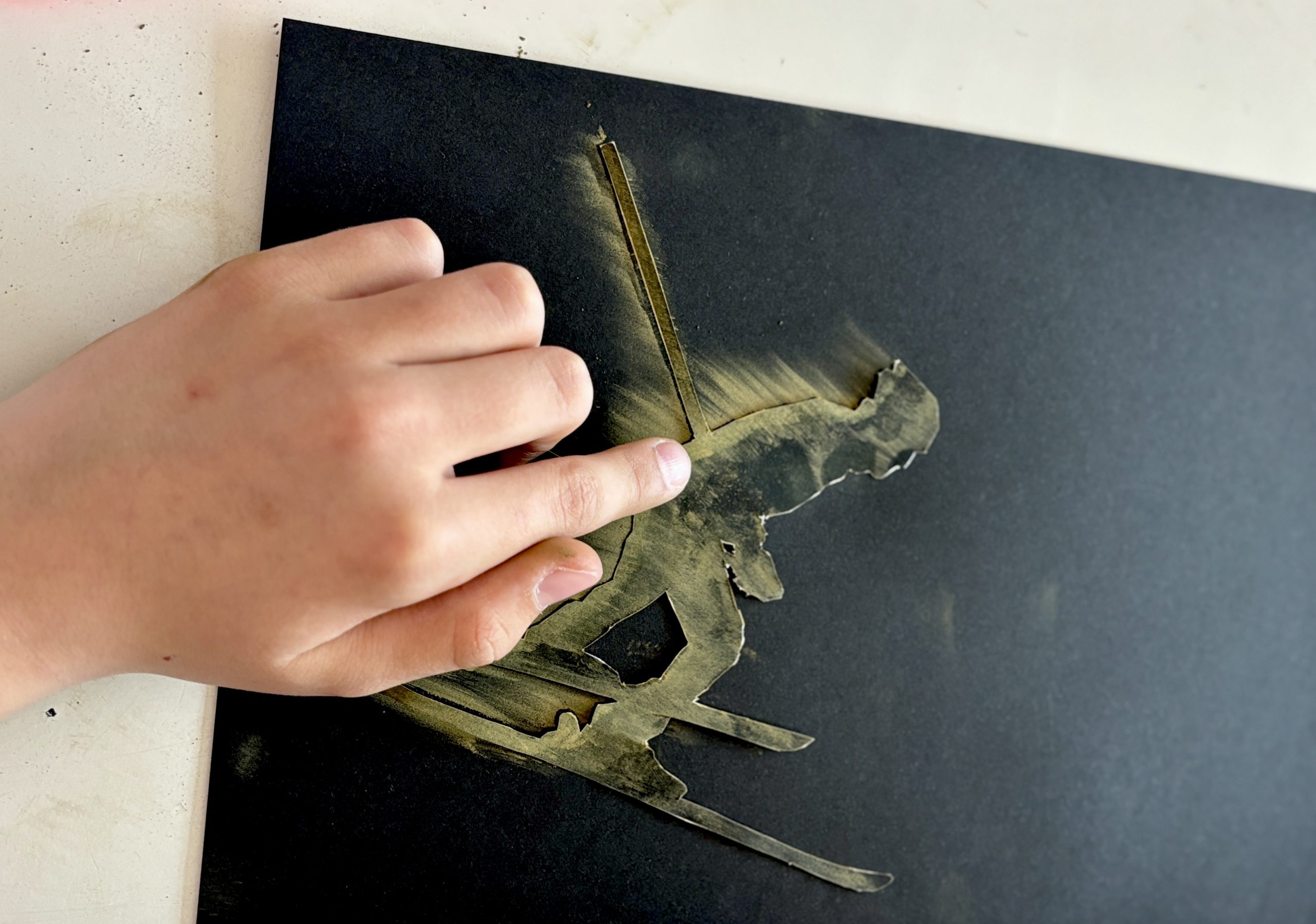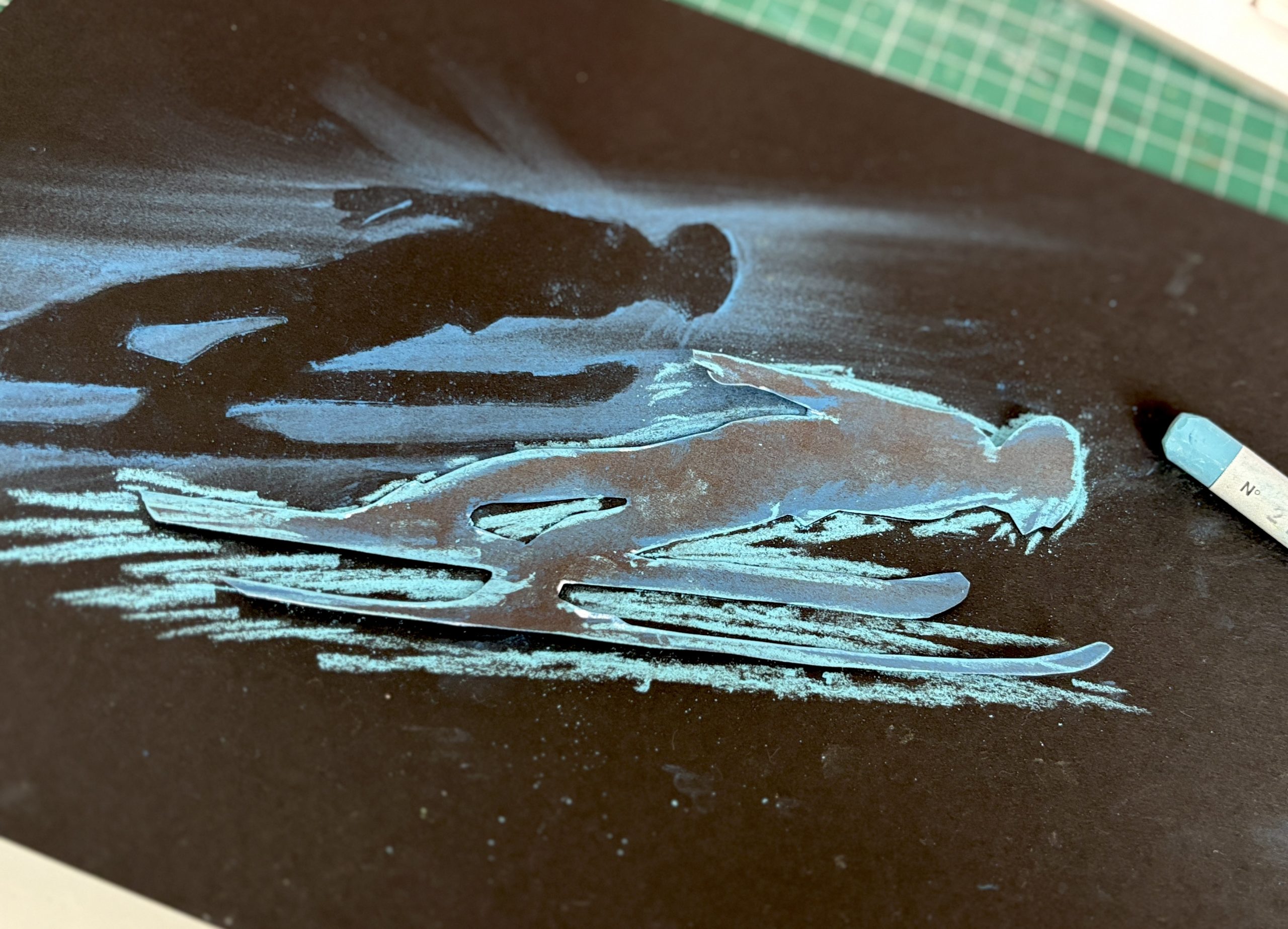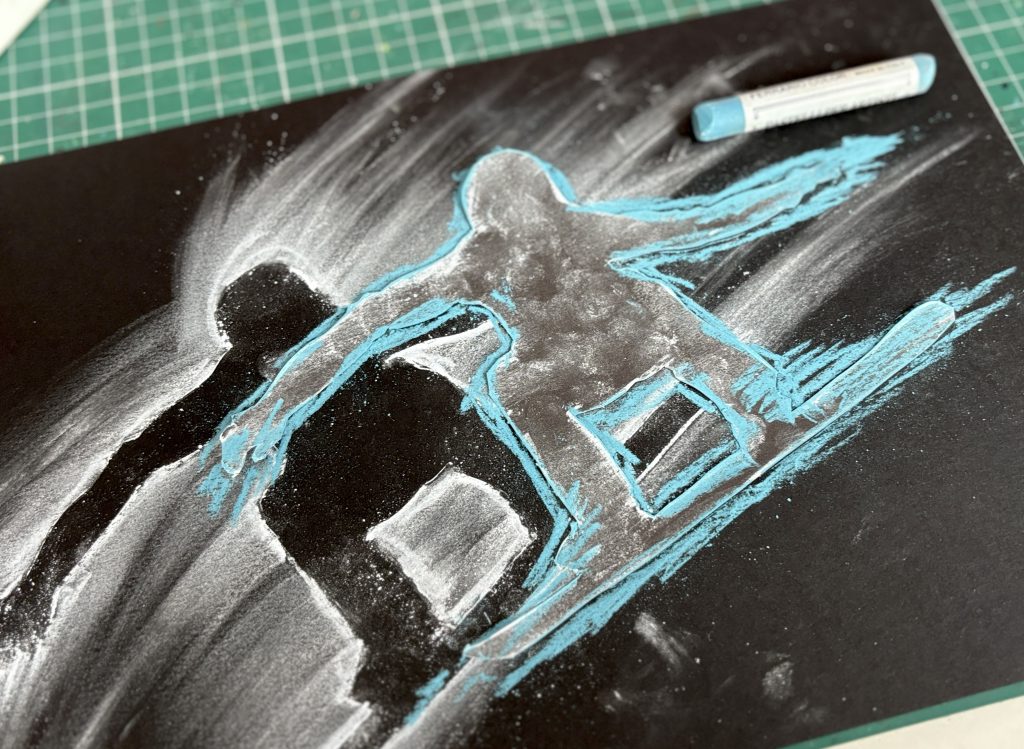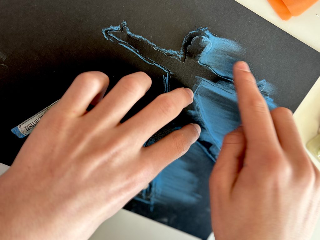 Abbiamo poi selezionato una gradazione di 3 o 4 colori di pastelli morbidi, dal più chiaro al più scuro. Tenendo ben ferma la figura-stencil sul cartoncino, abbiamo colorato il bordo con il primo pastello e poi abbiamo sfumato il colore con le dita verso l’esterno, dando una direzione precisa alla sfumatura per suggerire la velocità.