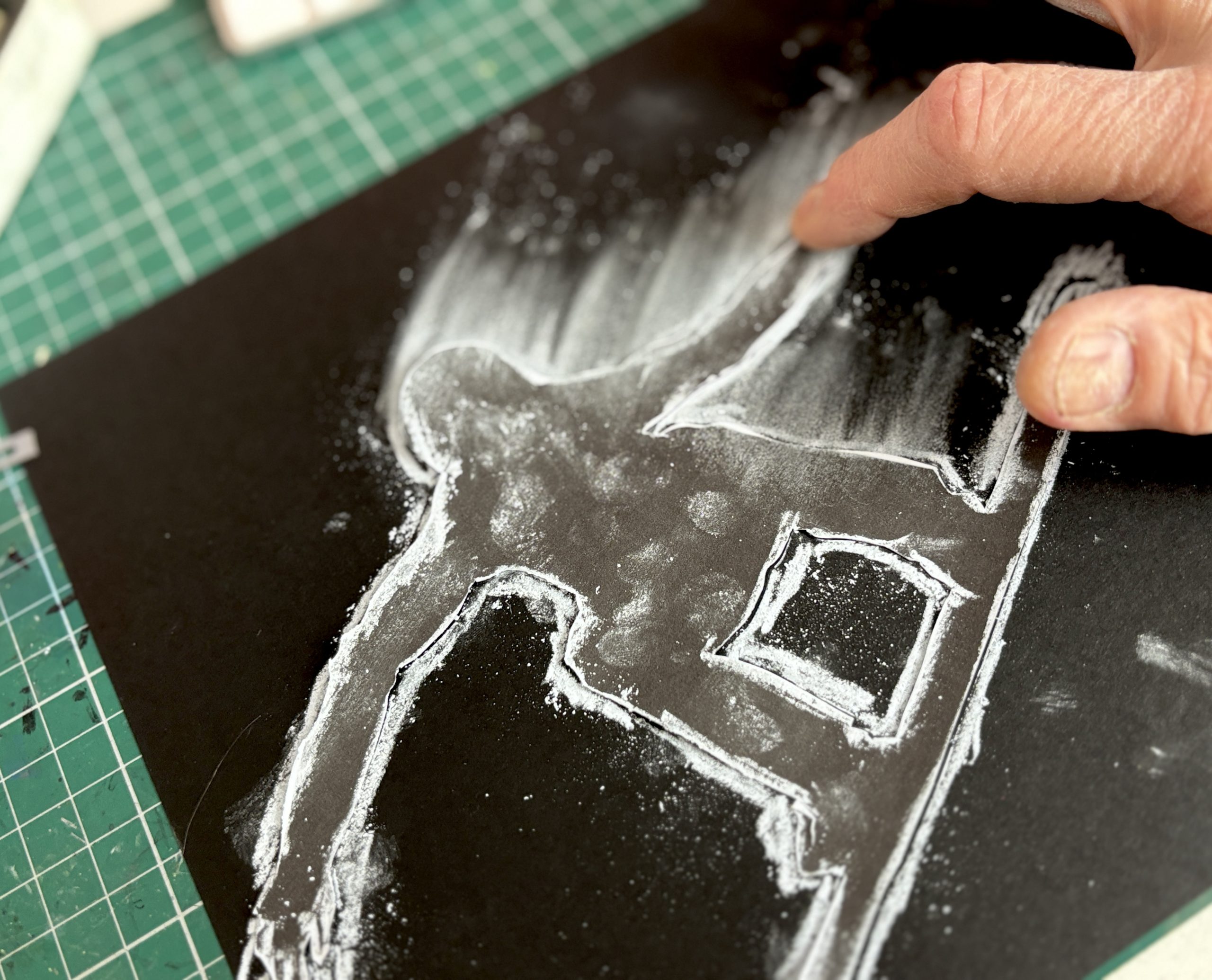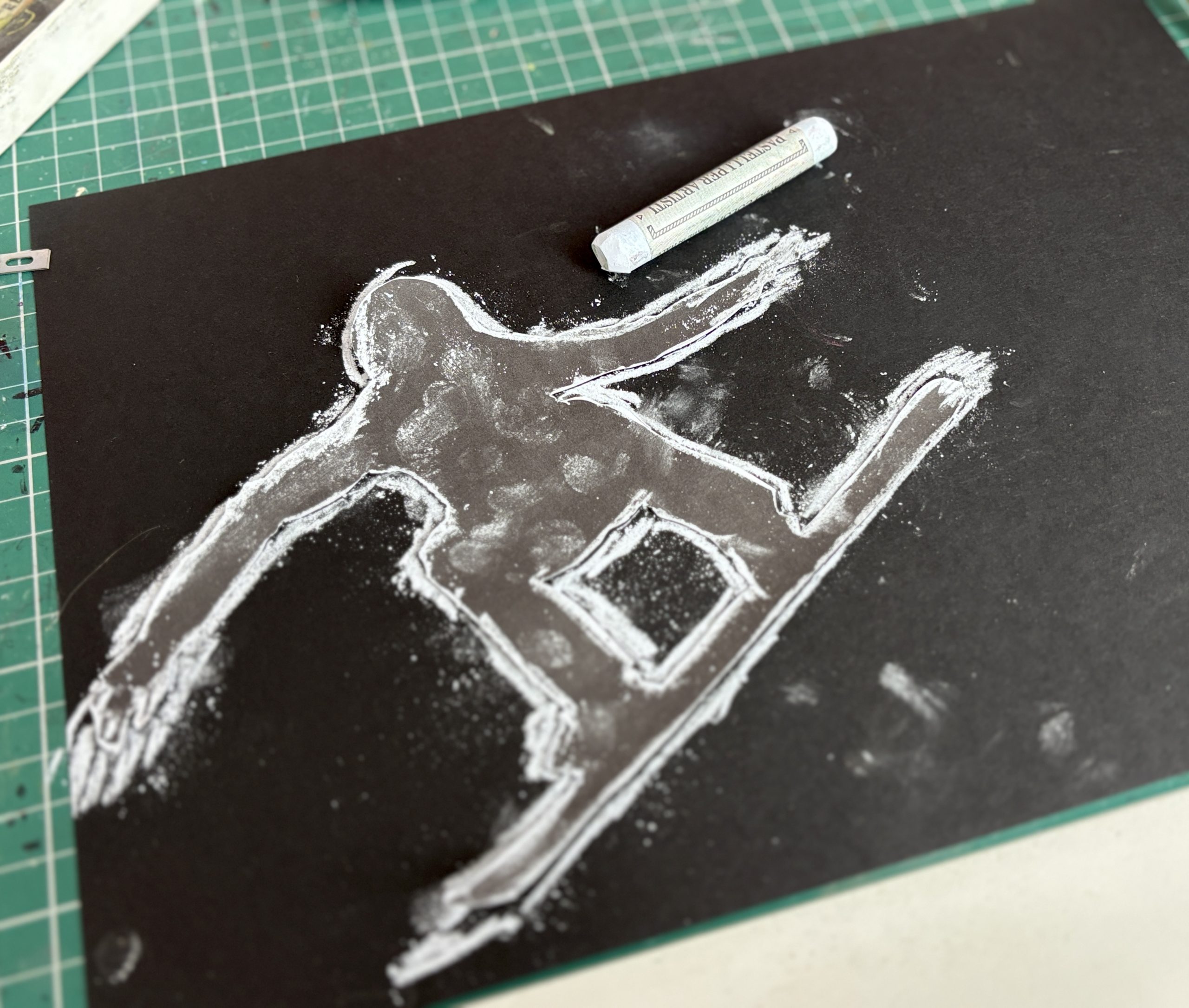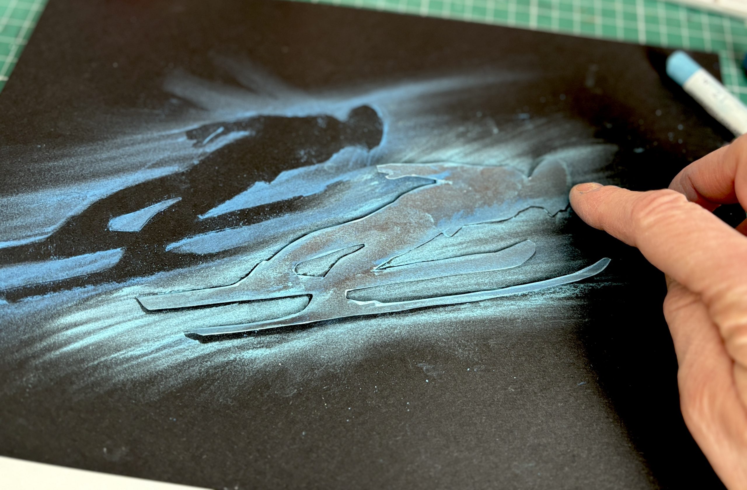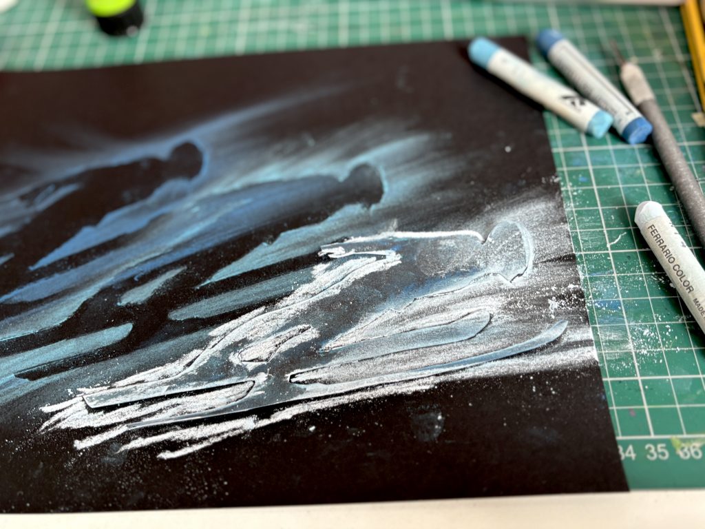 Abbiamo poi selezionato una gradazione di 3 o 4 colori di pastelli morbidi, dal più chiaro al più scuro. Tenendo ben ferma la figura-stencil sul cartoncino, abbiamo colorato il bordo con il primo pastello e poi abbiamo sfumato il colore con le dita verso l’esterno, dando una direzione precisa alla sfumatura per suggerire la velocità.