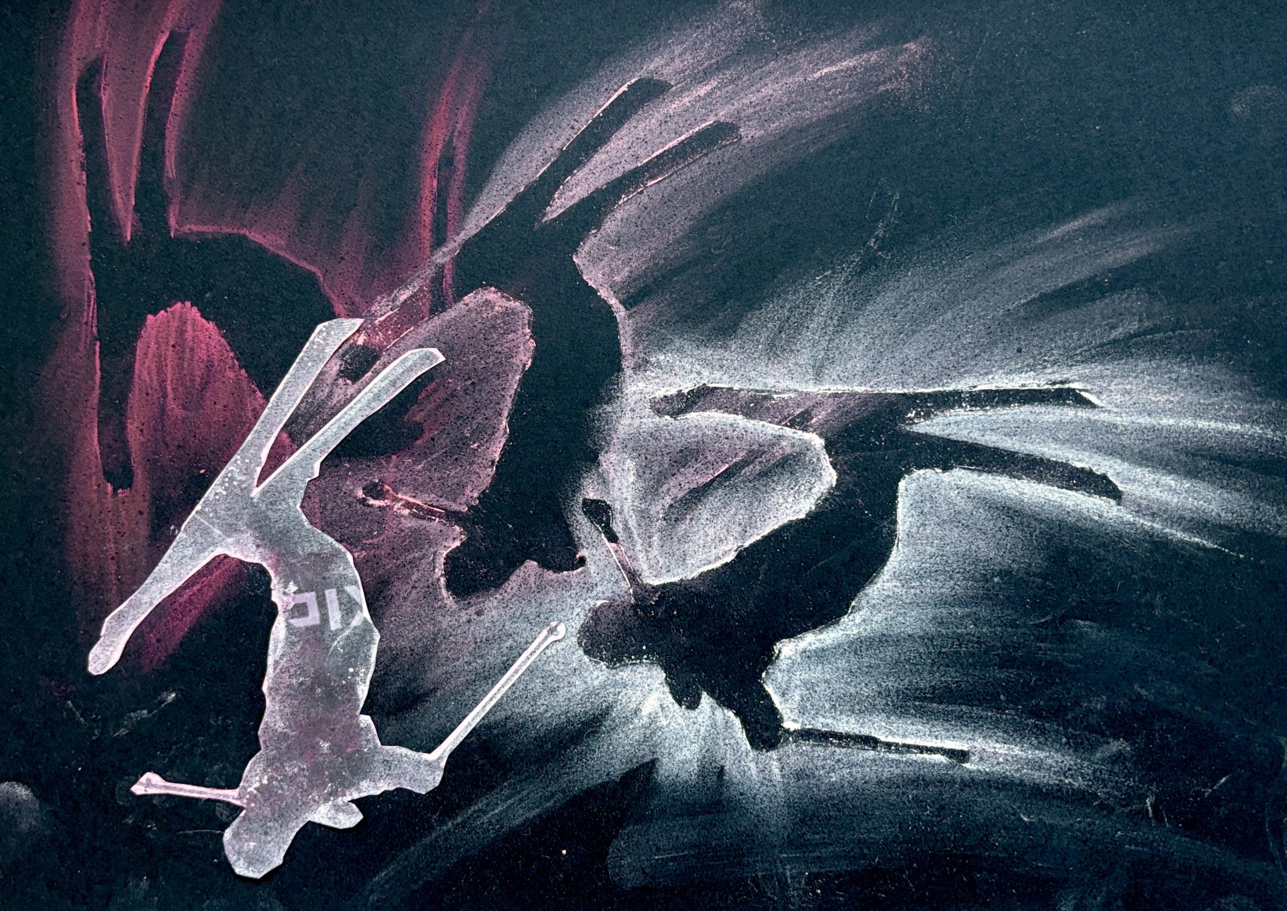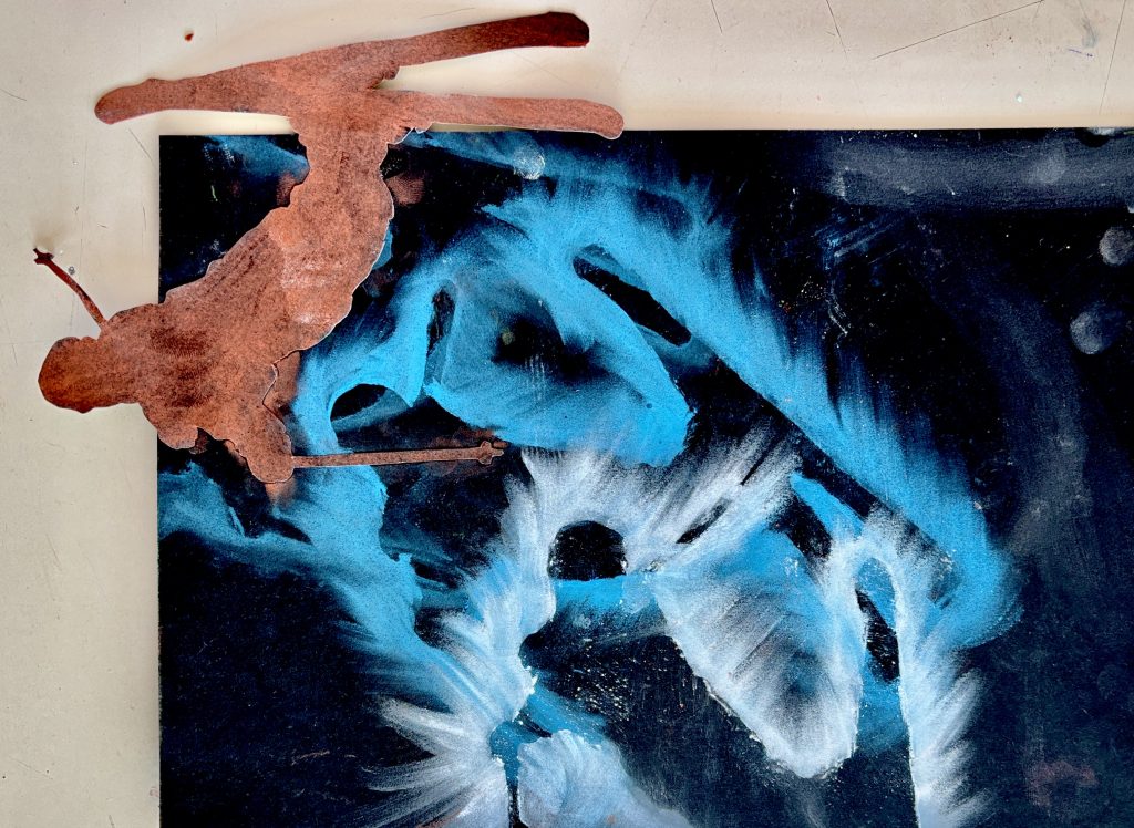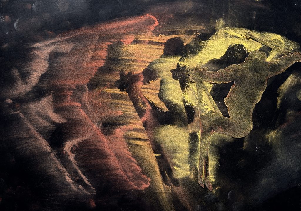 Senza alzare la sagoma, ma spostandola leggermente di lato, abbiamo ripetuto l’operazione con il secondo colore della gradazione, sfumando nuovamente con cura. Procedendo in questo modo, sovrapponendo leggermente le sfumature successive, abbiamo creato una scia cromatica che rende l’idea del movimento della figura nello spazio.
