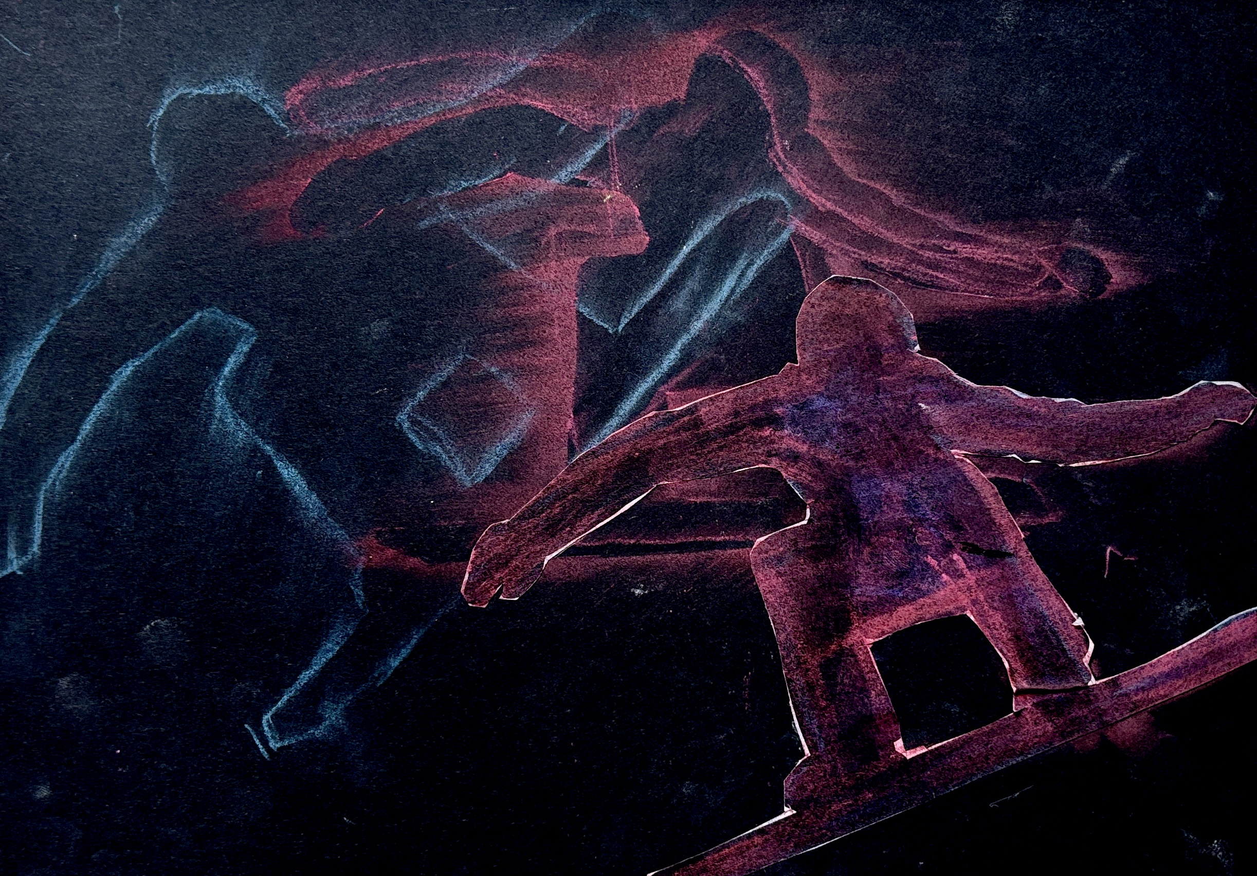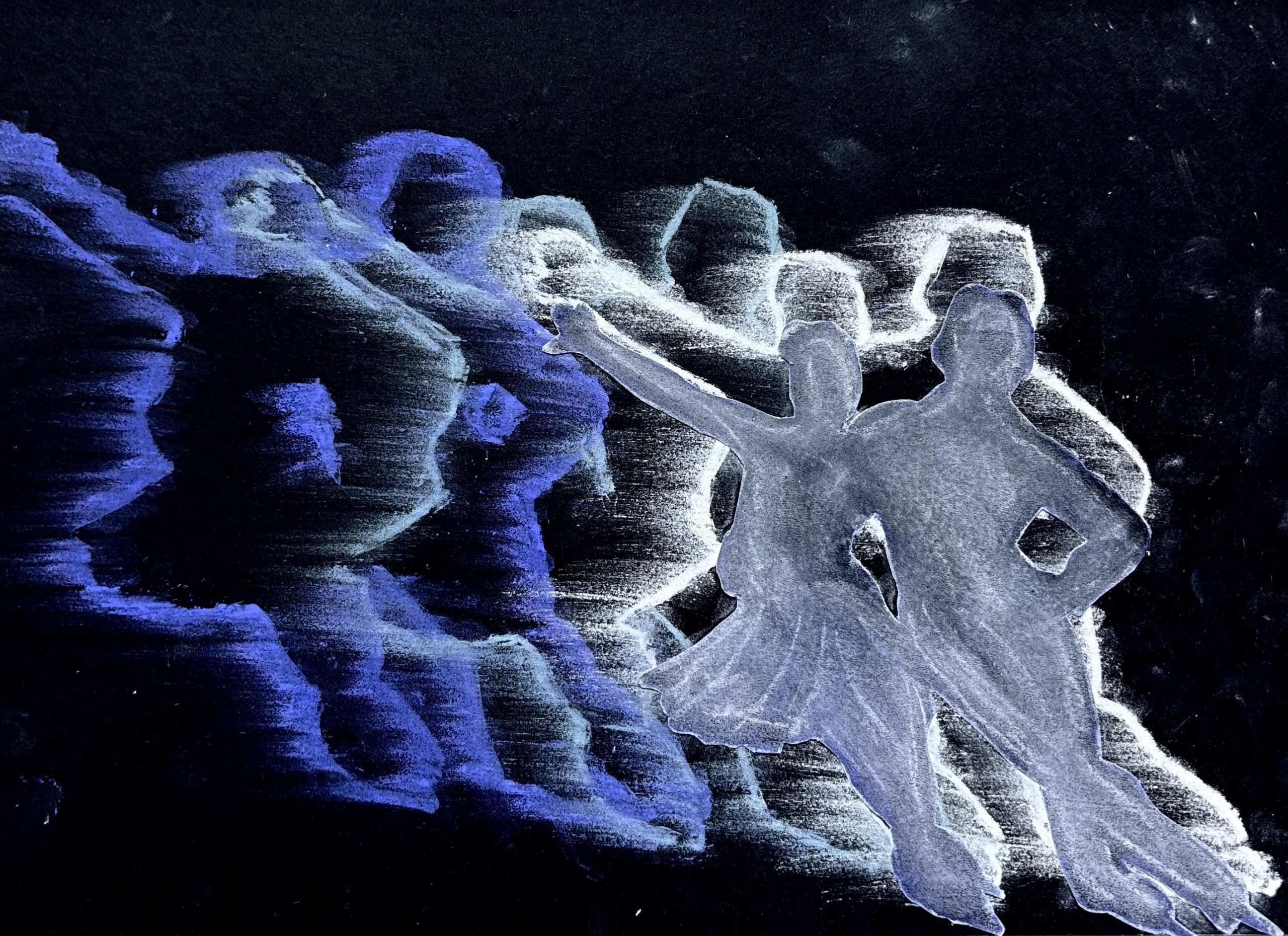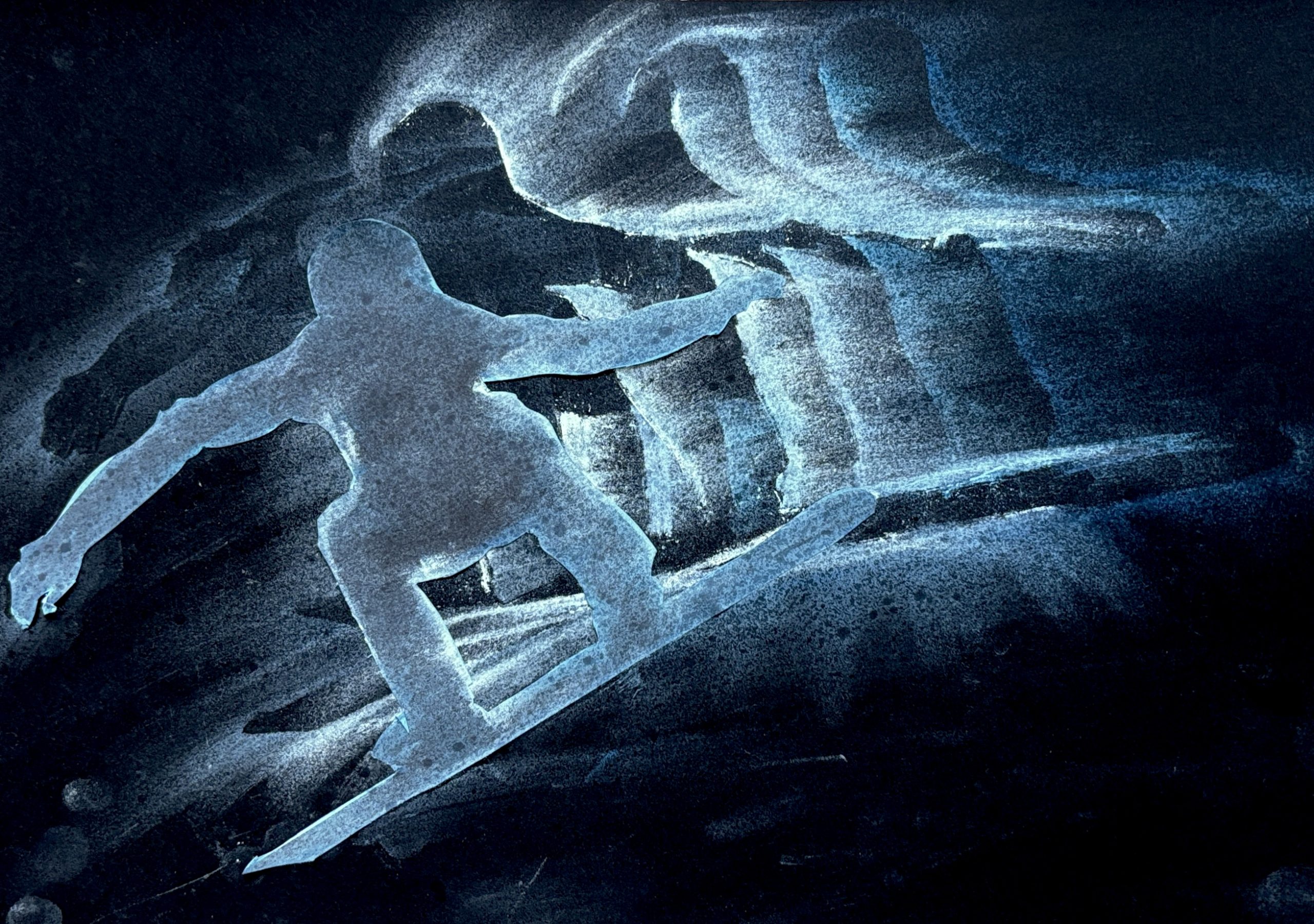 Senza alzare la sagoma, ma spostandola leggermente di lato, abbiamo ripetuto l’operazione con il secondo colore della gradazione, sfumando nuovamente con cura. Procedendo in questo modo, sovrapponendo leggermente le sfumature successive, abbiamo creato una scia cromatica che rende l’idea del movimento della figura nello spazio.